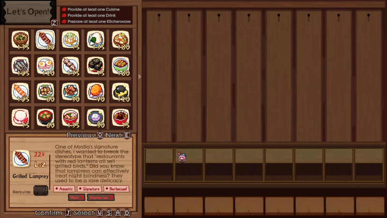 七鳃鳗——可在下午1点30分左右至下午6点期间于河边食材点找到。【妖怪小径】的许多客人都喜爱七鳃鳗,因此这将是你售价较高且十分畅销的食谱之一。确保储备充足能让你在从七鳃鳗食谱转向其他领域前的生活更轻松。它也是唯一带有【招牌】标签的食材,所以后期储备一些也很不错。