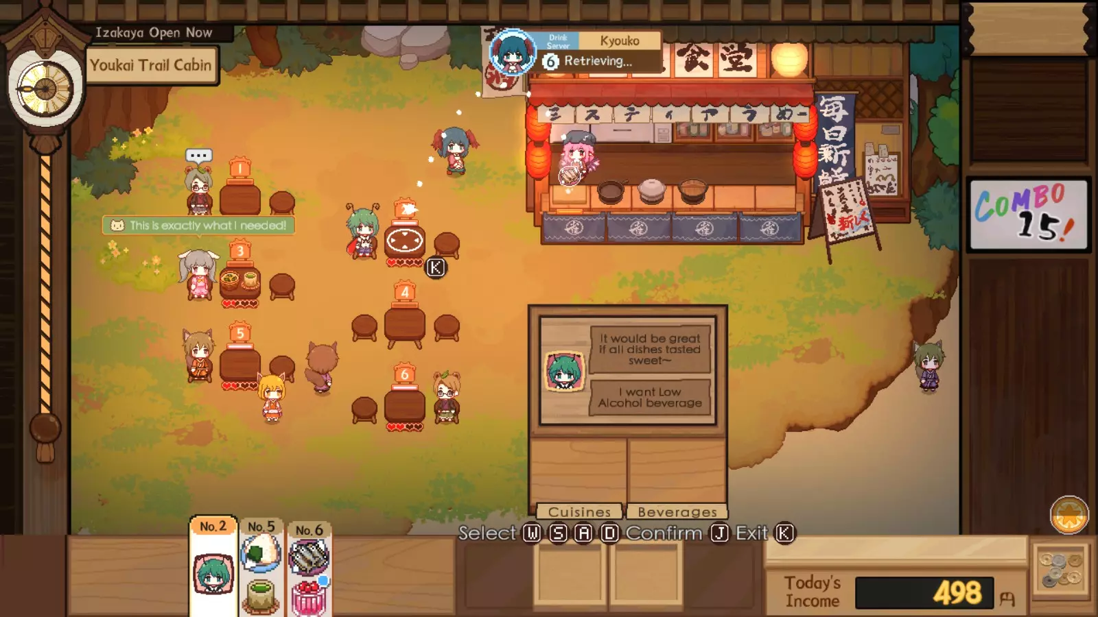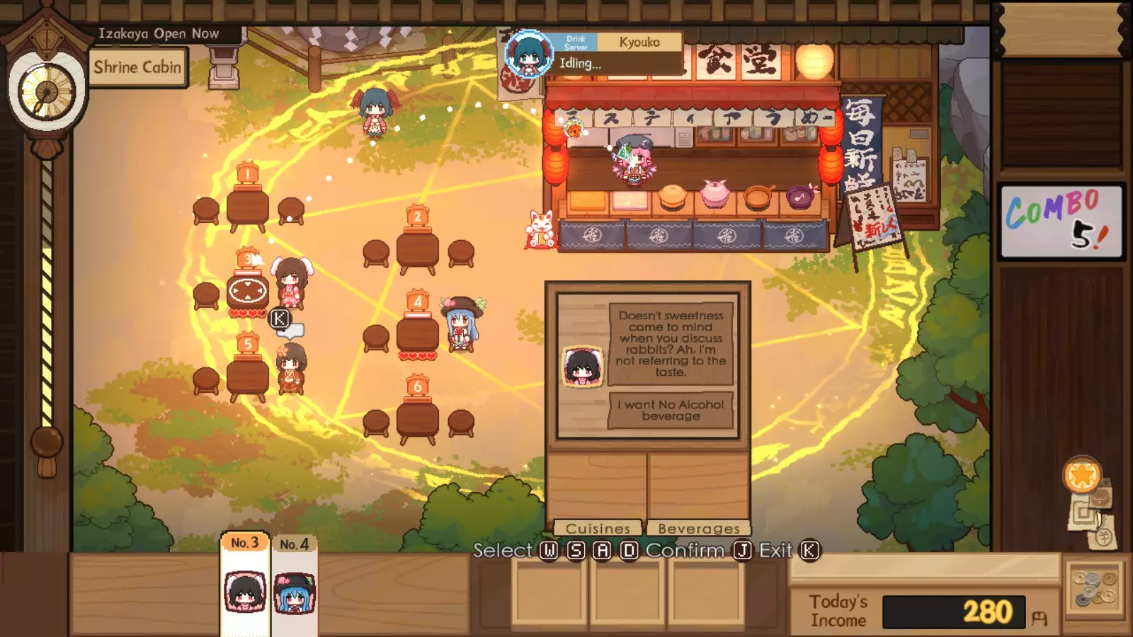你可以通过制作最便宜的食谱来“刷”这个增益效果,只为触发小游戏,或者制作一份实际订单并储存起来留到以后用。不过,随着食谱变得更复杂,小游戏的难度也会上升,这一点也要记住。但小游戏提供的增益效果是随机的,所以你可能只会进入超级模式。从截图来看,超级模式允许你远程查看稀有顾客的订单。通常情况下,你必须跑到每个稀有顾客那里才能知道他们想要什么,这意味着你得记住他们的需求。当顾客太多时,记住这些需求会变得困难得多,尤其是你还得为每个顾客确定要用什么食谱的时候。通过键盘上的【Tab】键打开笔记本时,也无法立即查看稀有客人的具体需求,只能看到他们的偏好。当你在厨房中调出客人订单时,可以暂停计时器来思考该使用什么食谱,无需跑回客人身边。如果想不出食谱,可以快速打开笔记本,查找符合稀有客人偏好和标签的食谱。利用这个机制可以减少跑回稀有客人身边反复确认订单的时间,你可以在笔记本和订单请求之间快速切换。如果你记忆力很好,可能不需要这样做,但当有4-8位需求各异的稀有客人时,难度会大很多。在任何 Boss 战中,如果你和我一样记性不好,那么同时接取多个稀有客人变种的订单并为每个客人找到符合其所有要求标签的食谱是必不可少的。 无限耐心拖延 这是极限模式速通的另一种衍生策略。如果你至少拥有无限耐心 buff,就可以用这种方法拖延当前不想要的某些客人的耐心。 在某些情况下,你的居酒屋肯定会出现一些你完全不想见到的稀有客人。或者你可能不想在最后之前为他们服务,因为你不想激活他们的符卡。帝是最典型的例子,完成她的订单后,无论你做得多好,都会触发她的骗局;而拒绝从她那里购买任何东西则会破坏你的连击,除非你激活了灵梦的奖励符卡,否则连击对于保持客人的高额小费收入至关重要。另一个例子是,慧音的符卡可以随机为你生成20位客人,听起来很棒!然而,如果你正在刷稀有客人羁绊,这对你来说可能很糟糕,因为之后出现的任何稀有客人都必须排在你刚召唤的这20位客人前面等待。如果你已经完成了稀有客人羁绊刷取,或者只是想赚更多钱,那么你可以随意触发慧音的符卡。