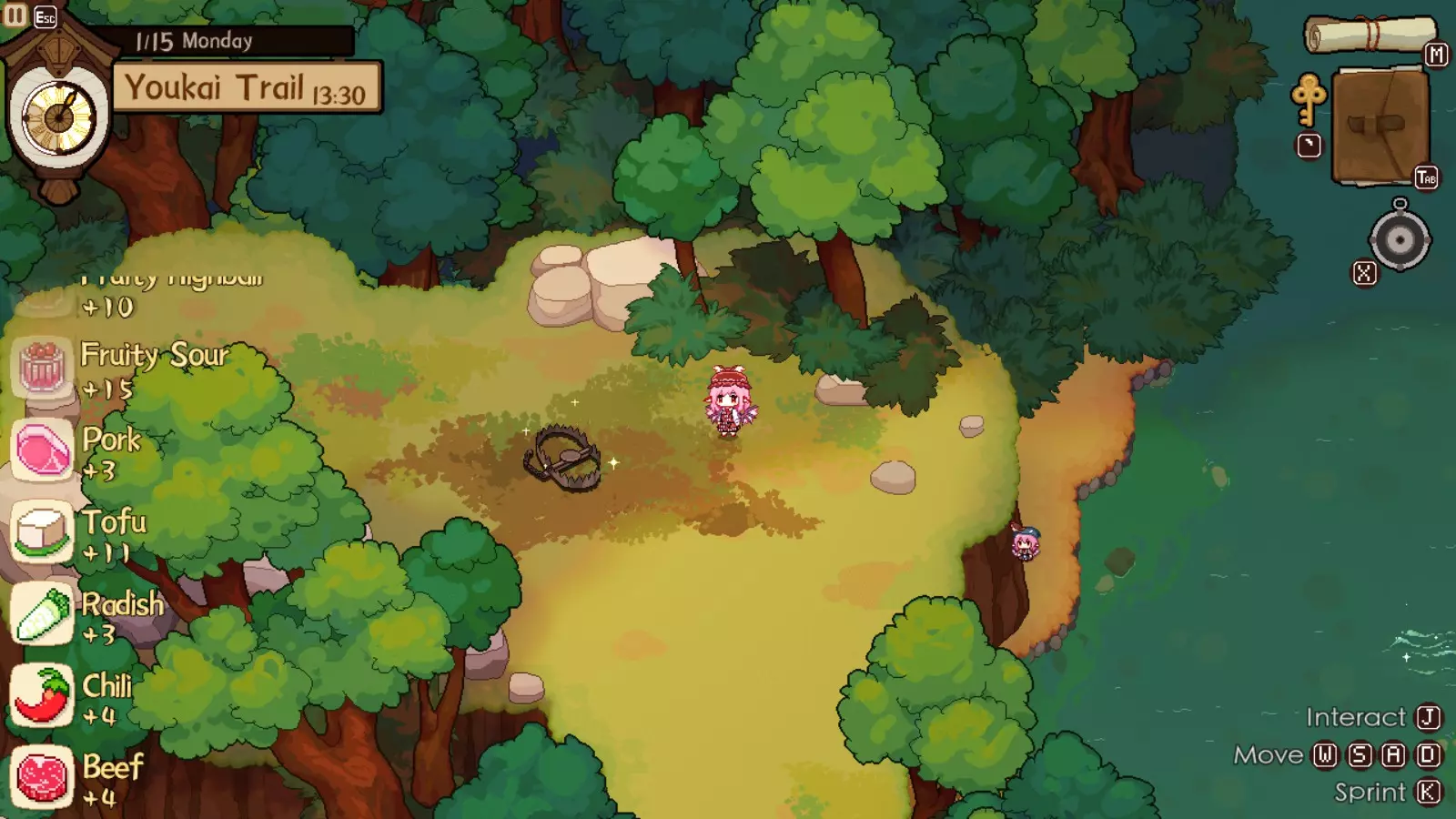 鳟鱼——与七鳃鳗同时出现在河边。在寻找七鳃鳗时,你会自然地钓到它们。这些主要用于陈的食谱和订单。在游戏初期,这是一种可靠的食材,你会需要不少来跟上订单进度,毕竟你不会想永远只卖味噌汤和饭团,它们只能分别换来微不足道的6和8块钱。 蜂蜜——后期许多食谱都非常需要的常见食材。目前也用于满足铃仙和陈的偏好。