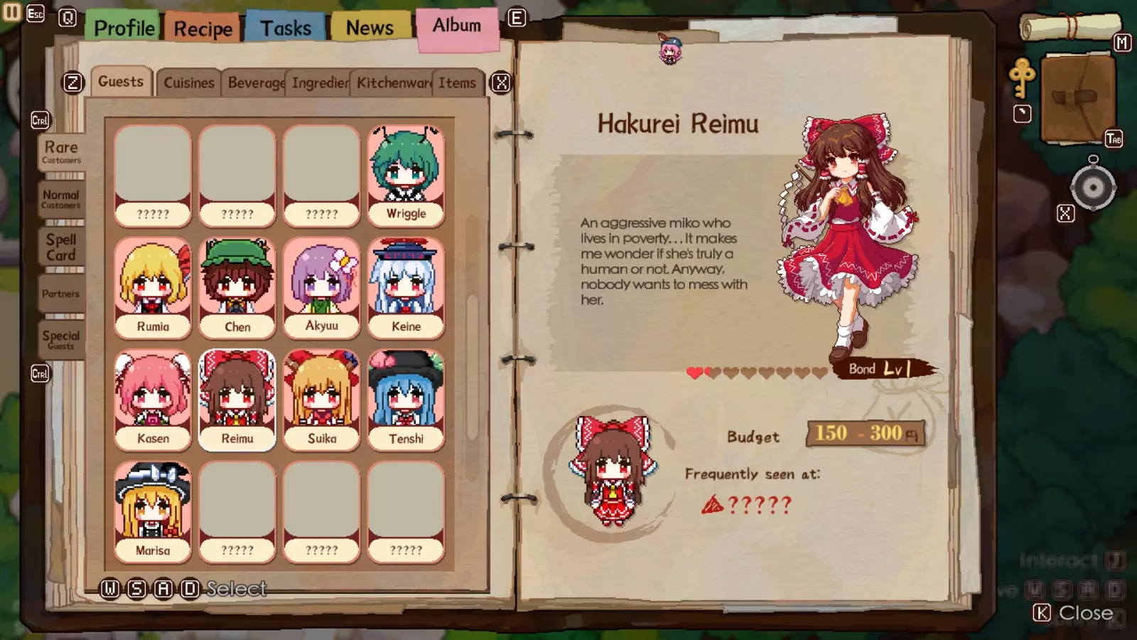 你无法提升铃之助的羁绊等级。不过,像铃之助这样的特殊客人仍然会带有奖励和惩罚符卡。铃之助的奖励符卡在游戏当前阶段非常有用,因为他会开始向你出售基地厨房用具的升级。他的奖励符卡能让你在第二天购买他的所有商品时享受30%的折扣。利用这一点购买他的升级道具吧,否则这些道具会相当昂贵。如果你资金短缺,锅、平底锅和砧板通常是非常优秀的升级选择,它们的使用频率最高,而蒸锅和烤架除了少数稀有食谱外,使用频率不高。你可以等以后有足够资金时再回来购买。铃之助是最容易满足的,只需一份额外添加海苔的饭团食谱就能获得完全正面的评价。不知为何,他也是幻想乡里唯一一个会喜欢啤酒饮料的知名角色,其他角色则不然。 总体而言:在合适的条件下,游戏的这部分内容会比较轻松。如果你运气够好,华扇和慧音的符卡能为你带来大量金钱。普通客人对味增豆腐和蔬菜沙拉这两种食谱的需求量很大,而且考虑到商人系统和食材收集机制,制作这两种料理会很简单。再次提醒,如果你还没有将铃仙或橙的好感度提升到最高,邀请她们到人类村落的居酒屋是个不错的选择。他们不一定会百分百出现,但这很重要,这样你就不用再回到妖怪小径居酒屋了。确保尽快将人类村落居酒屋升级到2级,这样你就能配备更多厨具,否则在能够升级之前,去那里是不值得的。 博丽神社 再次,米斯蒂娅似乎无法摆脱债务,因为陈又一次用另一份贷款协议引诱她。