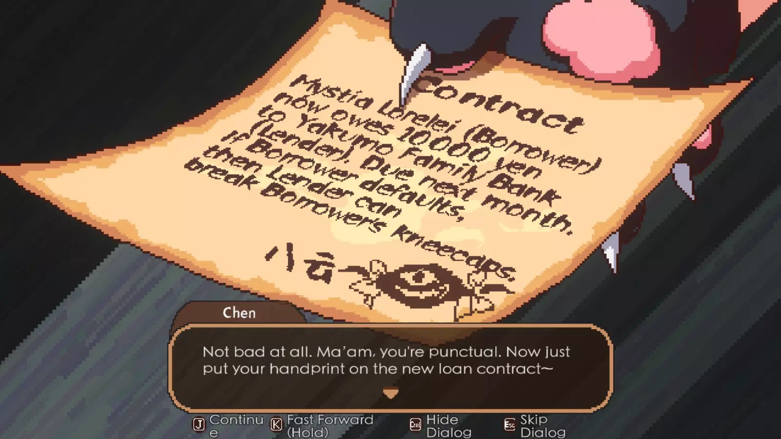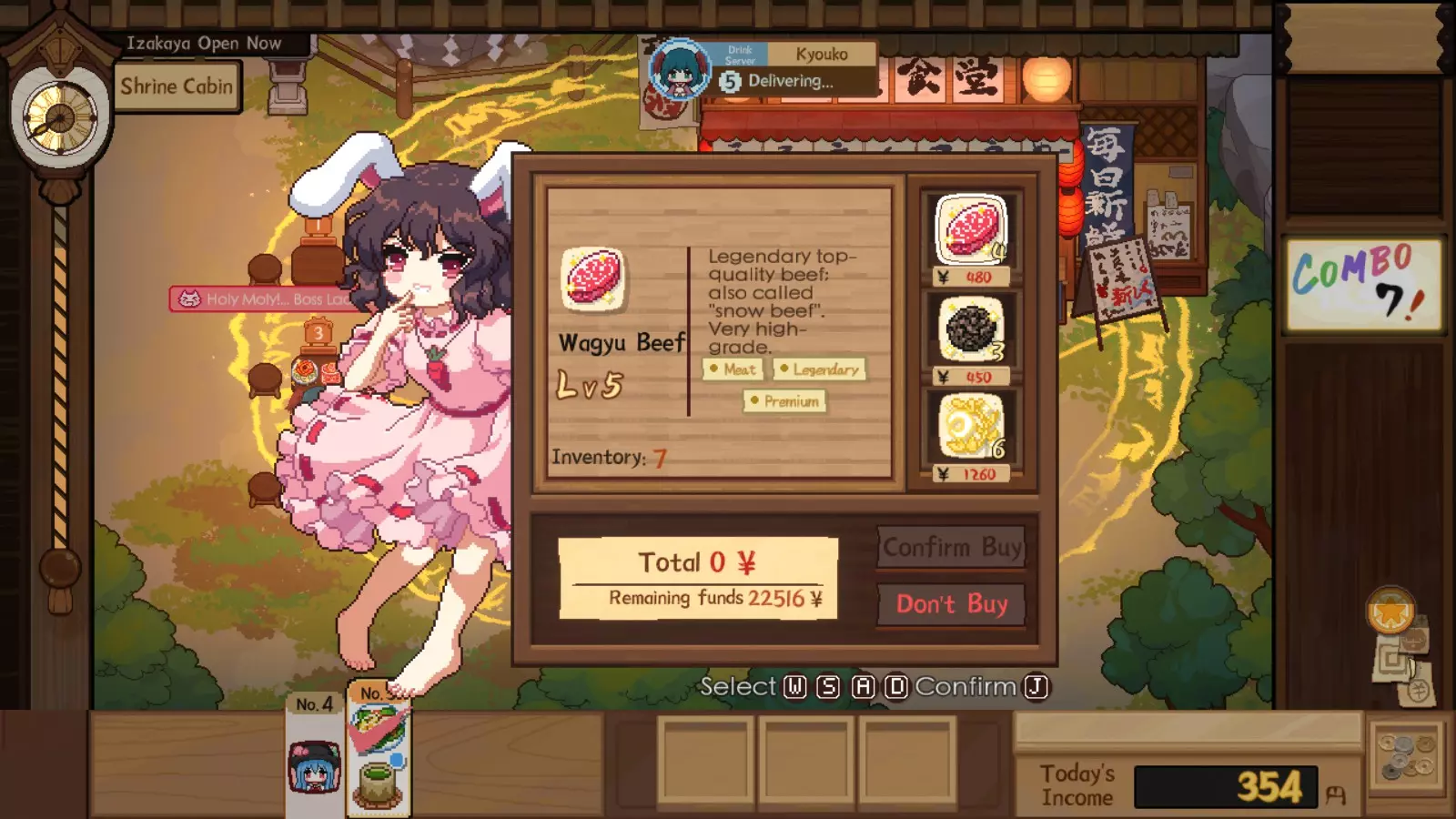最难遇到的稀有客人终于开始出现了。可能会让人困惑,为什么米斯蒂娅会抱怨帝的出现,但后者可能根本不会露面。不过,帝的独特机制是她有30%的几率出现在你的任何一家居酒屋。当她用餐完毕,会立即拿出一份购买清单,上面的稀有食材价格高得离谱。如果你拒绝购买任何东西,她会重置你的连击数,并在30秒内阻止你获得新的连击,这对你的利润和小费来说是个彻头彻尾的损害。你可以通过多种方法来防止这种情况发生。第一种是让灵梦通过捐赠或在为她服务时获得最高满意度评价来触发她的奖励符卡,以此来阻挡帝的惩罚符卡。第二种方法是触发无限耐心或超级模式增益来拖延帝,前提是她处于就座状态,直到她成为最后一位客人,这样就能防止帝造成任何伤害,直到最后你反正也没有客人了。