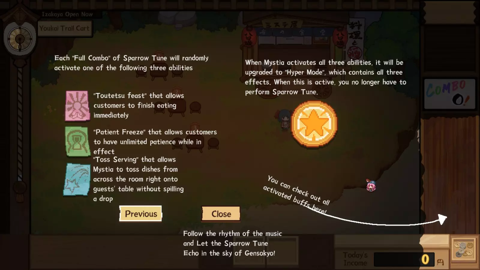 这种技巧能让你尽快进入超级模式,从而节省为客人送餐的时间。有了它,你无需任何帮助就能完成送餐。你仍然可以让京子为客人送饮料,这样你就能专注于烹饪,或者如果你愿意,也可以直接把食物扔给客人。这个技巧同样适用于饮料,所以当订单很多时,你可以通过向京子没在服务的客人扔饮料来帮她分担。你可以在游戏初期就使用这个技巧,不过通过“夜雀之歌”小游戏获得增益的初始概率较低,只有15%。虽然在初期作用不大,但随着等级提升,它会迅速变得实用,增益概率最高可提升至80%。在任何“Boss战”中,快速行动是获胜的关键。如果你浪费时间向每个“克隆体”传达指令,或是处理稀有客人的订单,那么光是来回奔波所浪费的时间就会让你失败。唯一的缺点是,这需要你进行更多主动思考,所以如果你想偷懒,可能就不会经常使用这种方法。总的来说,这项技巧不仅在日常的居酒屋夜晚能提高利润,对妖梦的许多试炼以及游戏本体的最终Boss战也非常有用。此外,它不仅能减少因不烹饪、跑去为客人服务而产生的时间浪费,还能通过让客人更快用餐来增加利润,从而吸引更多客人入座。抛投上菜范围拖延术 是超级模式冲刺的衍生技巧。此技巧仅需在居酒屋夜晚通过【夜雀之歌】小游戏获得的抛投上菜范围 buff。这不仅能让你从远处上菜/饮品,还能远程查看稀有客人的订单,让你可以在厨具前拖延时间,思考要制作什么。