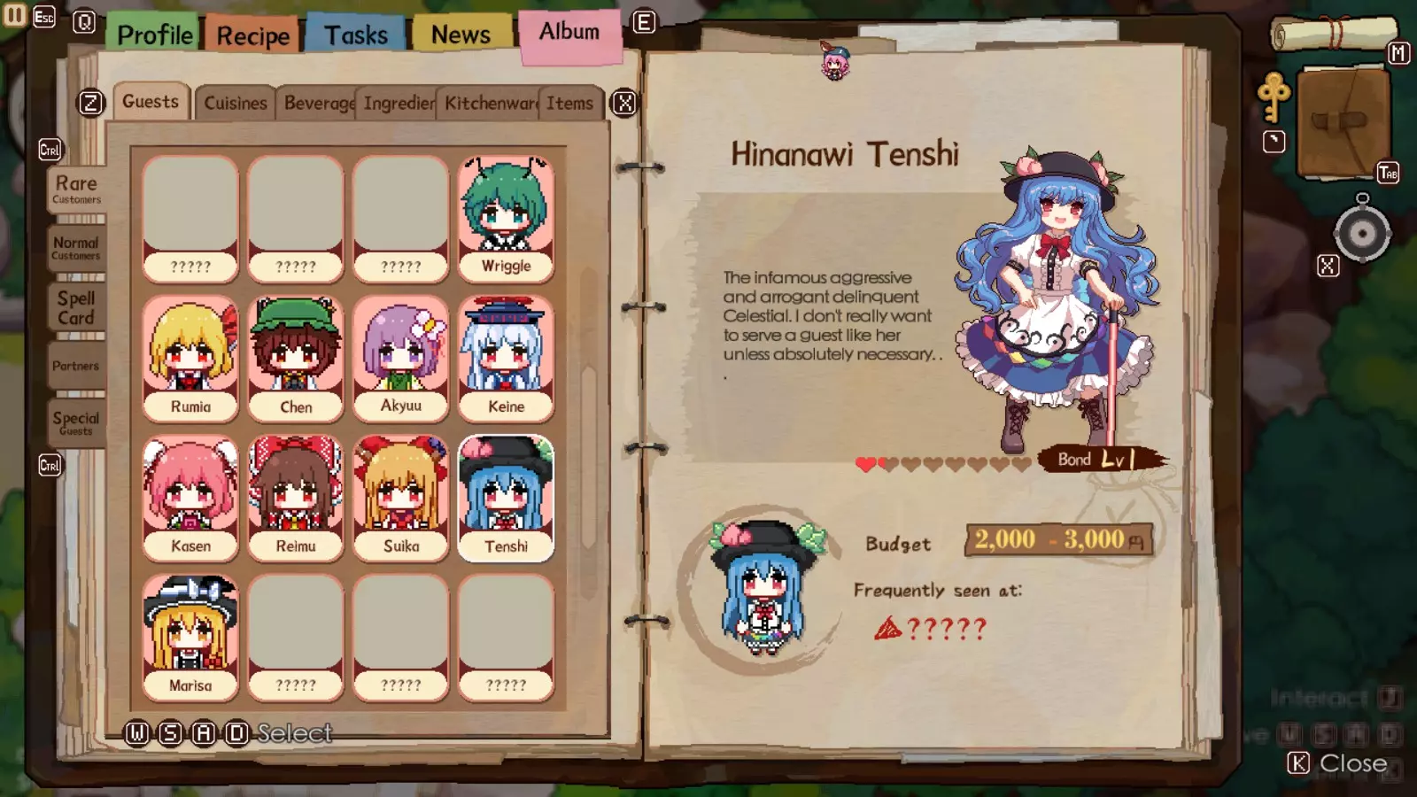 灵梦和慧音、露米娅类似,只会给你衣服。她的食谱还不错,卖得也还行,不过大多数都需要至少3种或更多食材。你可以从灵梦那里获得粉饭团、大杂煮和大名盛宴。其中大名盛宴完全不值得制作,因为它所用的食材不仅难以获取,而且也不值这个价。灵梦的标签要求不算太难满足,除非她要求带有【高级】标签的东西。不出所料,作为贫穷的巫女,她的预算也很低。不过,你还是要尽可能频繁地触发灵梦的奖励符卡,尤其是在到达博丽神社之后。原因稍后再讨论。灵梦的喜好虽然预算不高但很容易满足。触发她最大满意度的最简单方法是使用夜雀厨具,然后制作加蜂蜜的饭团,前提是她没有要求任何高级食材。 比那名居天子: