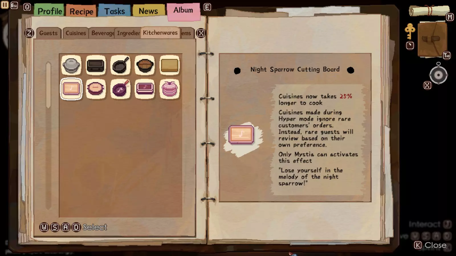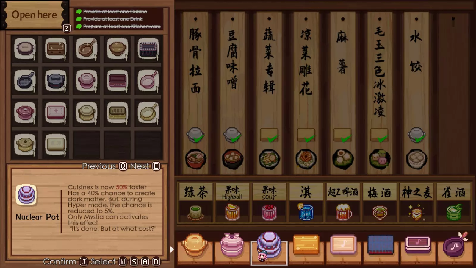 夜雀厨具的说明不够清晰,但它允许你在亢奋模式下无视稀有客人的直接要求,转而满足他们的偏好。在大多数情况下,只要你提供的料理满足他们3项偏好,几乎总能获得最佳评价。例如,灵梦要求“高级”料理,但预算只有150日元,不愧是贫穷的巫女。不过,她的其他偏好是“管饱”“甜味”和“便宜”。因此,我们只需在夜雀厨具的超级模式下,为她制作一份额外添加了蜂蜜的饭团,就能满足她的三项偏好,同时忽略她的“高级”要求——如果使用其他厨具,你是无法满足这个要求的。这样做不仅能让她更有可能因为符合预算而留下,还能通过经济实惠的食谱和所需材料提升你们的羁绊等级。其“缺点”是需要处于超级模式才能触发该厨具的优势,但如果你在积极使用超级模式速通,这对你来说完全不是问题。虽然烹饪速度变慢这一明确缺点确实存在,但影响不大,因为无论如何你都必须进入【超级模式】才能触发其正面效果,而且它能让所有客人在食物上桌后立即吃完,从而弥补了烹饪所花费的时间。根据经验,【传奇】、【高级】、【中式】和【文化背景】标签在初期通常最麻烦,因为在游戏后期之前,你不会有很多(甚至可能没有)涉及这些标签的食谱。如果稀有客人还点了传奇、高级或文化背景类的菜品,你就必须找到针对这些标签的食谱,或者添加那些如果使用【夜雀】装备本可以忽略的食材。总的来说,这是角色羁绊等级刷取的最佳装备之一,因为你可能并不总是拥有针对稀有访客特定订单所需的食材甚至食谱。3. 任务