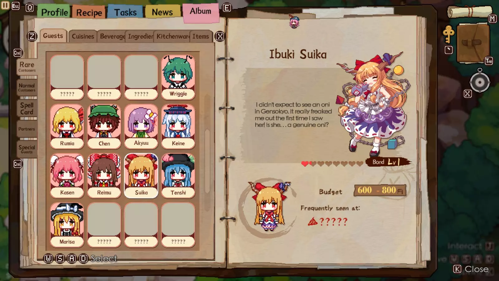 天诗和阿求类似,在她的1级任务结束时会给予一个非常强力的食谱。用1个萝卜(一种很容易获得的食材),你就能做出【玫瑰状萝卜沙拉】,这在当前阶段几乎是个过于强力的食谱。和【味增豆腐】一样,这道菜卖得非常好,和蔬菜沙拉一样,除了天诗偏好高级食材或水果外,它能很好地满足她的大部分喜好。不过,夜雀厨具不会接到直接订单,所以除非萝卜沙拉获得热门标签,否则它总是能用。她后续的食谱【桃子 tapioca】和【桃子虾仁沙拉】也能满足她所有的喜好,但桃子这种食材很难获得,因为它只有一个刷新点,且刷新时间很长。尽管向天子投掷你所有昂贵的饮品吧,她的预算高到你可能永远都无法耗尽。天子会给你【幸运桃】道具,该道具能让顾客有15%的几率给出最高满意度评价,从而增加你的小费。天子的奖励符卡能将所有当前就座客人的满意度提升至80%,进而增加你的小费。 伊吹萃香: