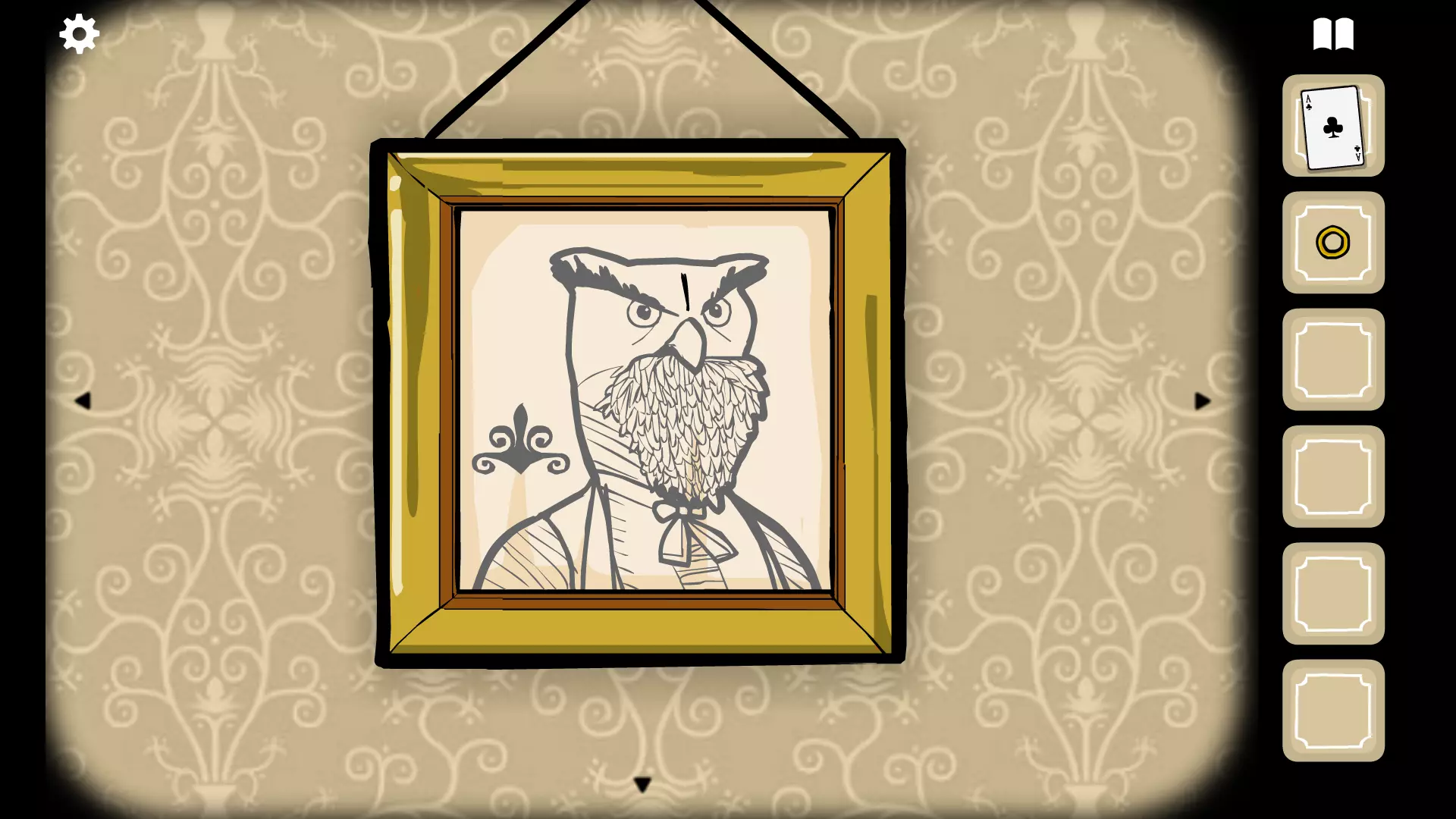 使用猫头鹰先生领带右侧的放大镜,找到一个由五条线组成的十行图案。 点击橱柜旁桌子上托盘左侧的音乐盒。点击纸片,并在猫头鹰先生的画像上重现该图案。(按顺序,从第一条到最后一条水平线:第五个圆圈、第四个圆圈、第三个、第二个、第三个、第四个、第三个、第二个、第一个、第三个)。点击纸片外,再点击音乐盒的手柄开始播放。如果顺序错误,将不会有任何反应(这种情况下,点击纸片两次重新尝试)。如果顺序正确,音乐盒底部的抽屉会打开,露出一把钥匙。 用钥匙打开窗户左侧抽屉上方的盒子,点击打开它。拿起手枪。将手枪交给雉鸡女士。回到摄影机器处,把湿玻璃底片放进去并点击快门。点击雉鸡女士两次以完成该房间。 房间4:兔子先生 本房间目标是帮助兔子先生完成他的魔术表演。 放大床上方的天花板灯。点击它获取黑桃A卡牌。 注意抽屉上方的画作,上面有字母A和数字5,位于两个符号之上。 放大抽屉,打开最下面的抽屉找到一把刀。 拨动门右侧桌子上那个顽固盒子的开关。会伸出一只手。用刀割它,获取戒指。 注意桌子上方画作中猫头鹰先生旁边的符号。