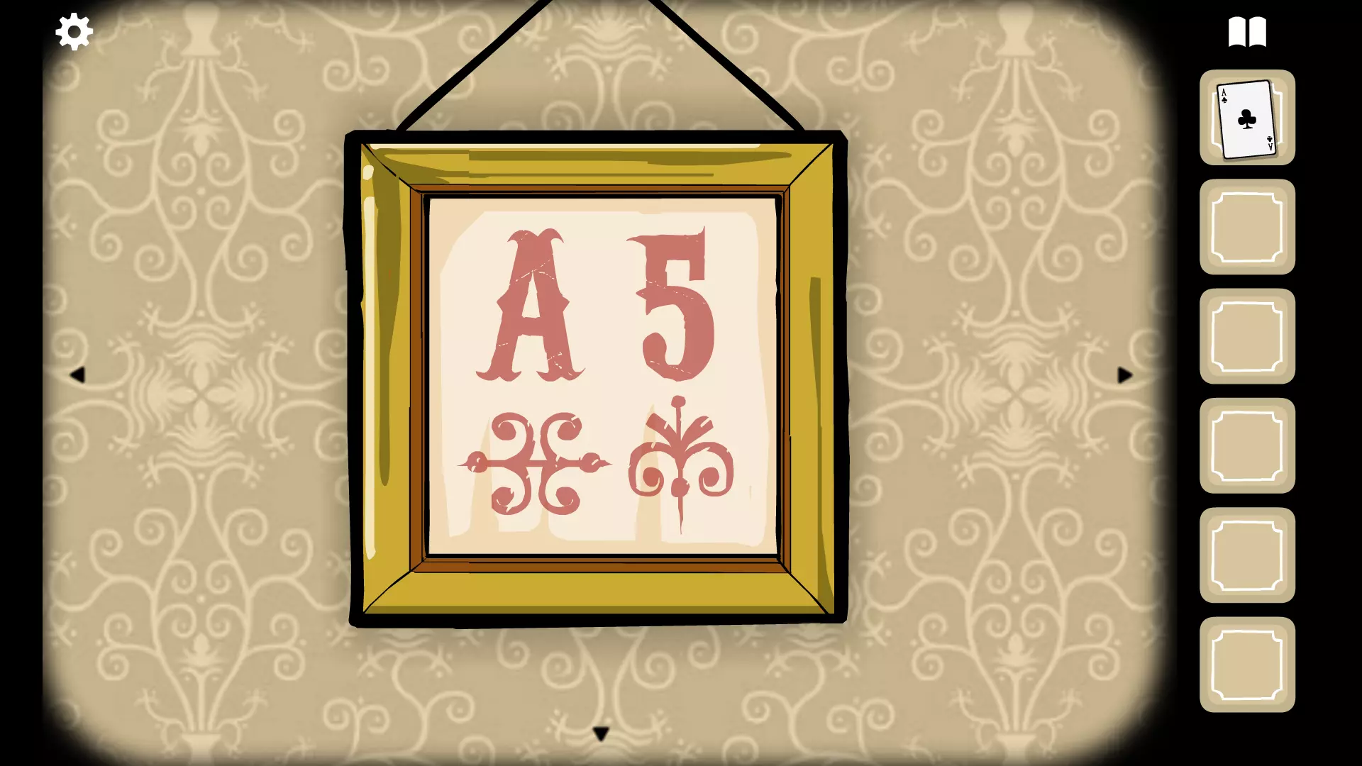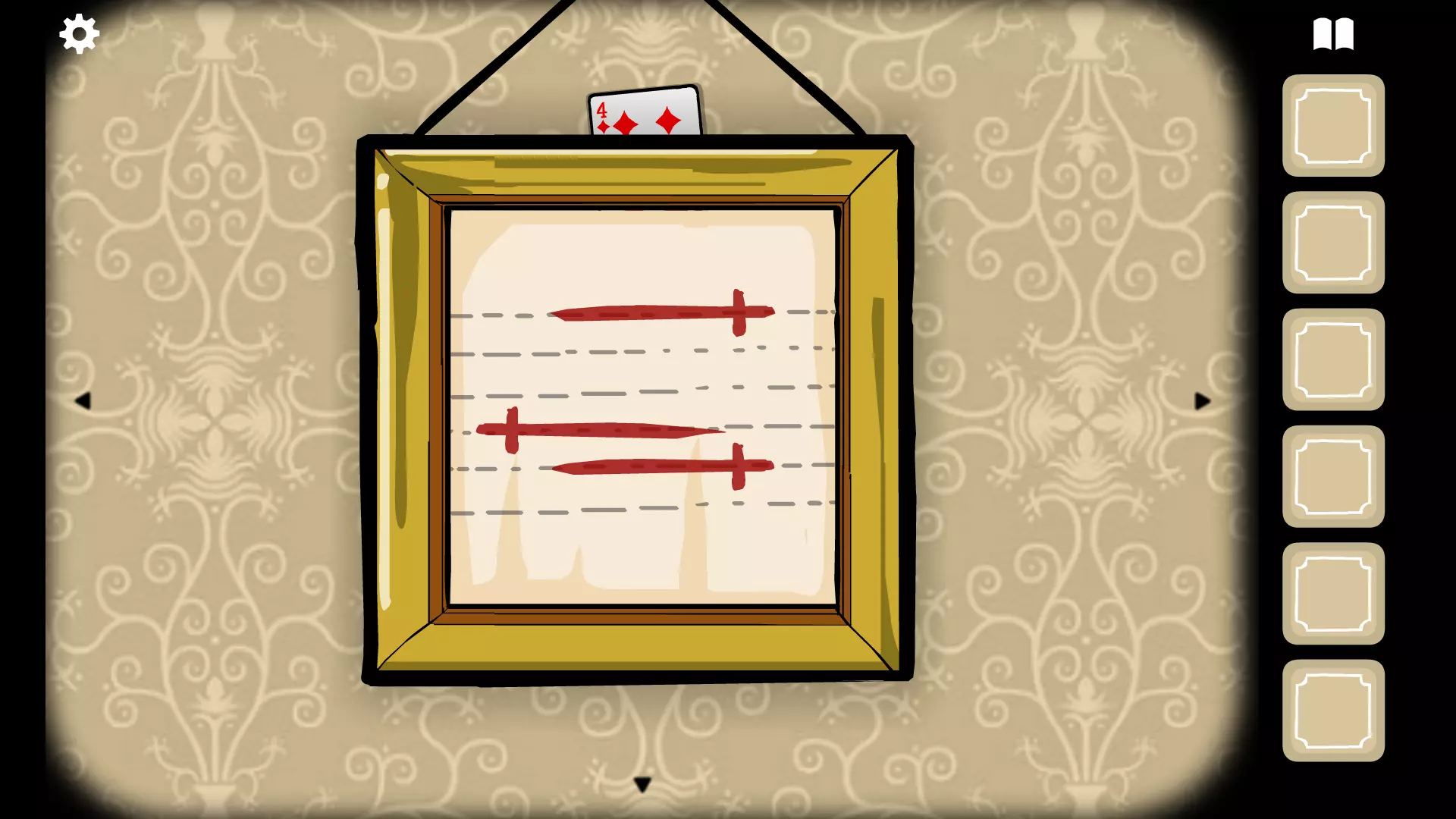 获取魔法衣柜上方的帽子。 点击兔子先生的耳朵两次,再点击卡片一次,获得梅花五。 将帽子戴在兔子先生头上,点击他的头,然后点击帽子,使花朵出现。按照魔法衣柜左侧底部图片的顺序放置花朵(紫色、粉色、白色、橙色)。再次点击花朵和帽子。点击帽子六次,让钥匙从兔子先生嘴里掉出来,获取钥匙。 点击兔子先生右侧的桌子,放大查看三个杯子。点击杯子,其中一个会升起,露出一个球。点击杯子两次,杯子开始移动。跟踪有球的杯子,当杯子停止移动后点击它。杯子升起,露出一个贝壳。再次跟随它,当它升起时,会出现一个顶针。再次跟随,这次会出现一只虫子。这次,当它升起时,会出现一只眼睛。点击眼睛获取它。 点击门右侧有两张牌的板子。上面已经有一张印着猫头鹰先生的黑桃K和一张方块8。将其他牌放到板子上。根据画作中的线索,按正确顺序放置卡牌:黑桃K对应猫头鹰先生的符号。猫头鹰画作;梅花A和梅花5对应抽屉上方画作上的符号;红桃2对应那幅画着一只手伸出两根手指的画作上的符号;方块8对应魔术表演广告顶部的符号,而方块4对应底部的符号(最终顺序为:红桃2;方块4;梅花5;梅花A;方块8和黑桃K)。如果卡牌放置正确,梅花5会移动,其下方会出现一把钥匙。移开卡牌并获取钥匙。 用你获得的钥匙打开魔术衣柜周围的锁,点击链条使其掉落。点击柜门将其打开,并将三角形石头放入门上的三角形插槽中。关闭并打开房门,然后用眼睛对着骷髅头使用。关闭并打开房门两次,获取三把剑。 将剑盒左侧图画上的文字位置重现到剑盒中(第一支箭上放一把剑,第四支和第五支箭上各放一把)。点击盒子两次以结束夜晚。 房间5:鸽子夫人 此房间的目标是帮助鸽子夫人洗澡。 注意磁铁装置左侧画作上红色叉号的位置。