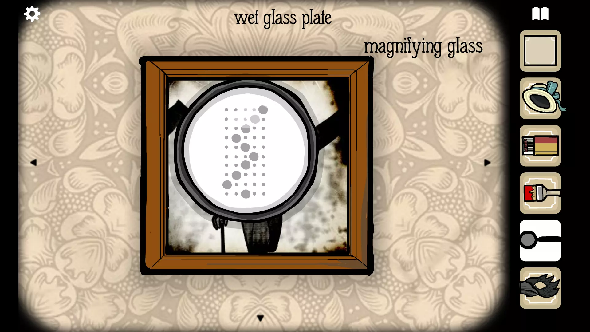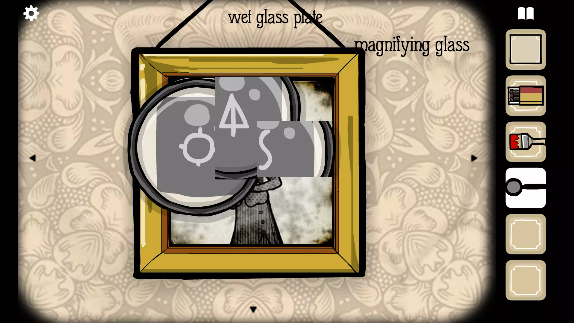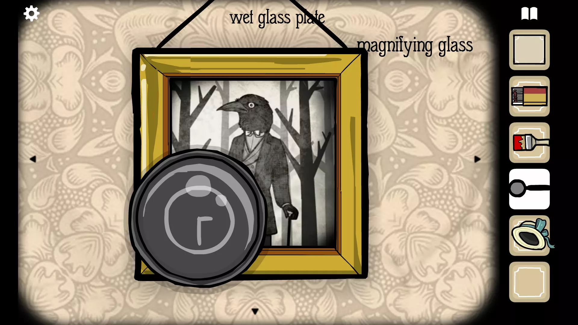 使用放大镜查看照片,能看到三个符号:十字准星、中间带一条线的三角形和字母S。按此顺序在窗户右侧花盆下方的保险箱上输入这些符号,然后点击按钮即可获得乌鸦面具。 将乌鸦面具用在雉鸡女士身上,并按照你找到的中间那张图片(乌鸦先生。图中有两条平行线,所以要涂满第一条和第三条垂直线)来绘制背景。回到摄影机器处,把湿玻璃底片放进去并点击快门。会出现一张照片,点击照片两次,然后将其放入任意空相框中。你会重新获得湿玻璃底片。