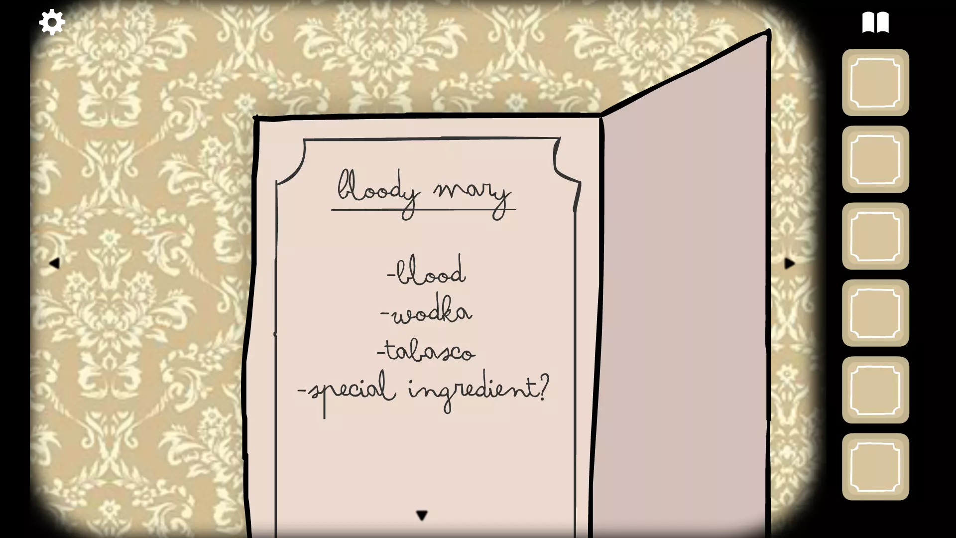 在这一天,你可以和乌鸦先生、蟾蜍先生(厨师)以及客人们交谈。你需要从前台取鸡尾酒并分发给每位客人。当所有人都拿到饮品后,双击任意客人,他们会表示该回房了。再次点击,夜晚便会开始。 第二天及以后 如果你在前几晚完成了雉鸡女士或鸽子夫人的房间任务,现在可以在餐厅旁的窗户或枕头上拿到红酒或白葡萄酒。 从现在开始的每一天,你都需要前往厨房,将找到的食材交给蟾蜍先生。他会根据你前一晚帮助过的客人来准备食谱。你制作的食谱会根据找到的食材数量获得相应评分。在此之后,夜晚即将开始。 夜晚1 在这个夜晚,电话会响起。点击电话并与猫头鹰先生交谈。他会让你查看他的肖像画,该肖像画位于电梯左侧保险箱的上方。查看肖像画后你将获得一份材料。 夜晚2 在这个夜晚,如果你与乌鸦交谈,他会让你检查他的口袋。照做的话,你将获得一份材料。 夜晚3 在这个夜晚,如果你望向大厅的窗户,会看到一道明亮的白光落下,同时房间变暗。如果你前往其他地方再回到窗户边,蝙蝠行李员会出现在天花板上。点击他两次,他就会去往别处。持续点击他直到大厅恢复正常(再点击三次),之后如果你去电梯旁和他对话,他会给你一个食材。他会出现的位置如下:左上角窗户旁、左上角前台上方吊灯旁、右上角餐厅入口旁、右上角电梯旁。 房间1:鹿先生 鹿先生房间的目标是为他调制一杯血腥玛丽。