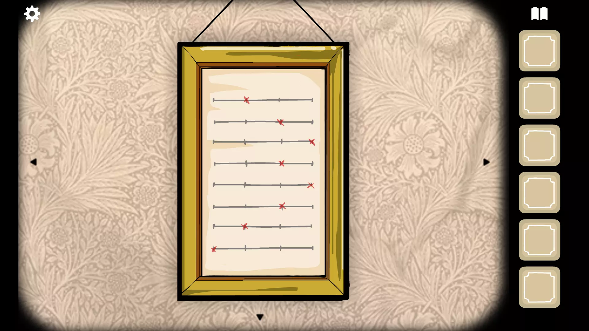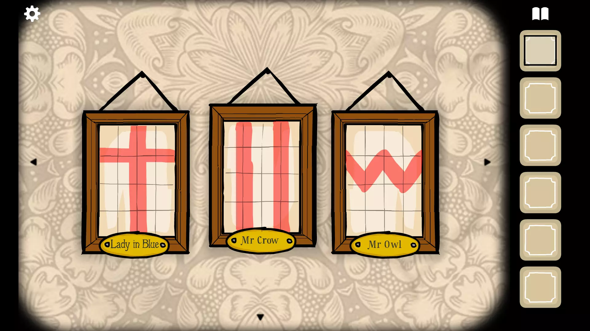 使用照片左下角的放大镜查看一个时钟,其指针大约指向三点半。点击时钟并将指针调整到该时间(点击黄色内圈可移动时针,点击带有罗马数字的白色外圈可移动分针)。时钟会发出钟声,一个小擀面杖会掉落。 点击橱柜上方的红色窗帘,露出木偶表演。用小擀面杖点击左侧的女性木偶,持续点击她,直到右侧男性木偶上方出现一把小斧头。获取小斧头并使用它点击男性木偶。继续点击他,直到女性木偶的头掉落,然后点击她身体上突出的木片,获得一个小火把。用小 torch(火把)对着她,用火柴点燃火把,点击她来点燃那个男人。点击他并获取钥匙。 用这把新钥匙打开橱柜左侧,得到猫头鹰面具。 将猫头鹰面具给 Pheasant 女士戴上,并按照你找到的中间那张图片(猫头鹰先生。上面有个“w”,所以从第一条水平线与背景左侧的交点开始,画到第二条水平线与第一条垂直线的交点;然后,画到第一条水平线与第二条垂直线的交点;再到第二条水平线与第三条垂直线的交点;最后到第一条水平线与背景右侧的交点)来绘制背景。回到摄影机处,将湿玻璃片放入其中,然后点击快门。会出现一张图片。双击该图片并将其放置到空相框中。你将再次获得湿玻璃片。