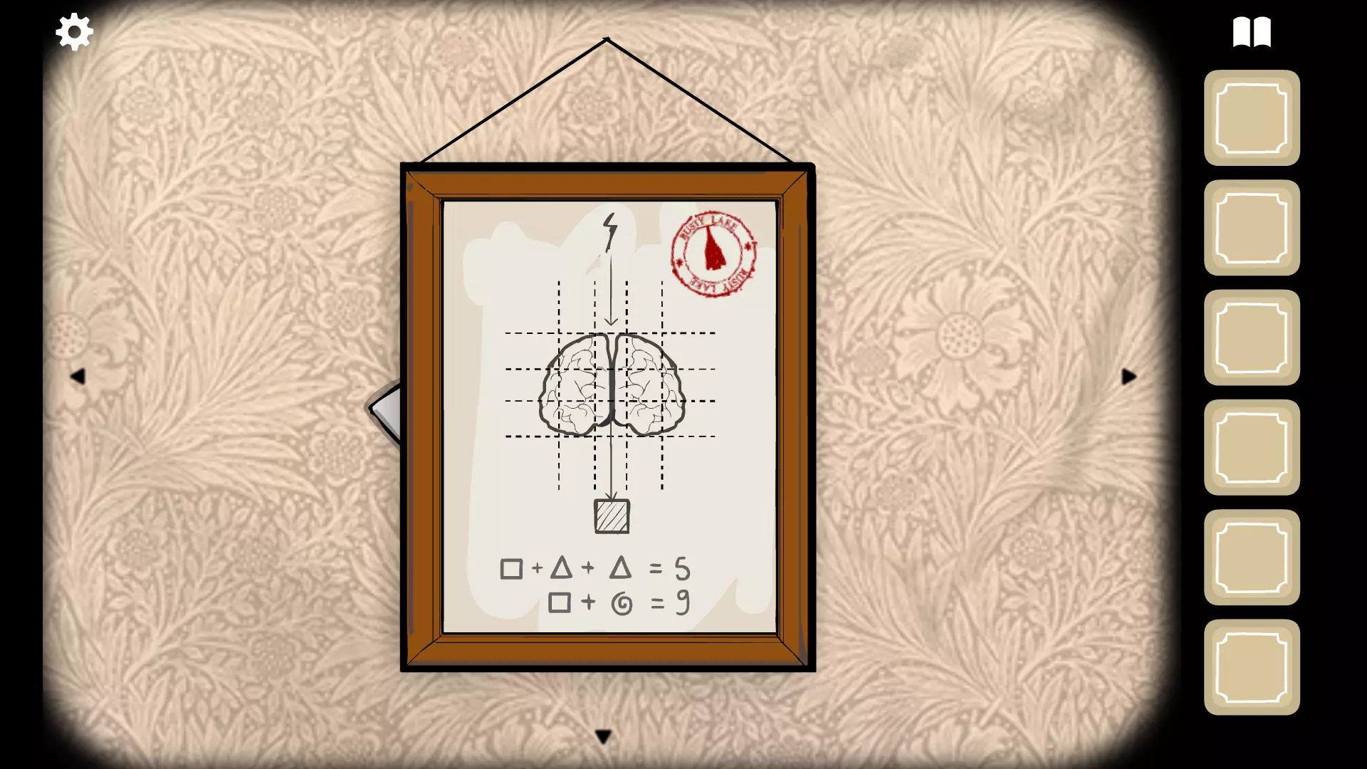 注意活动电影放映机状机器左右两侧画作上的等式: 三角形 + 正方形 = 4 正方形 - 螺旋形 = 2 正方形 + 三角形 + 三角形 = 5 正方形 + 螺旋形 = 9
