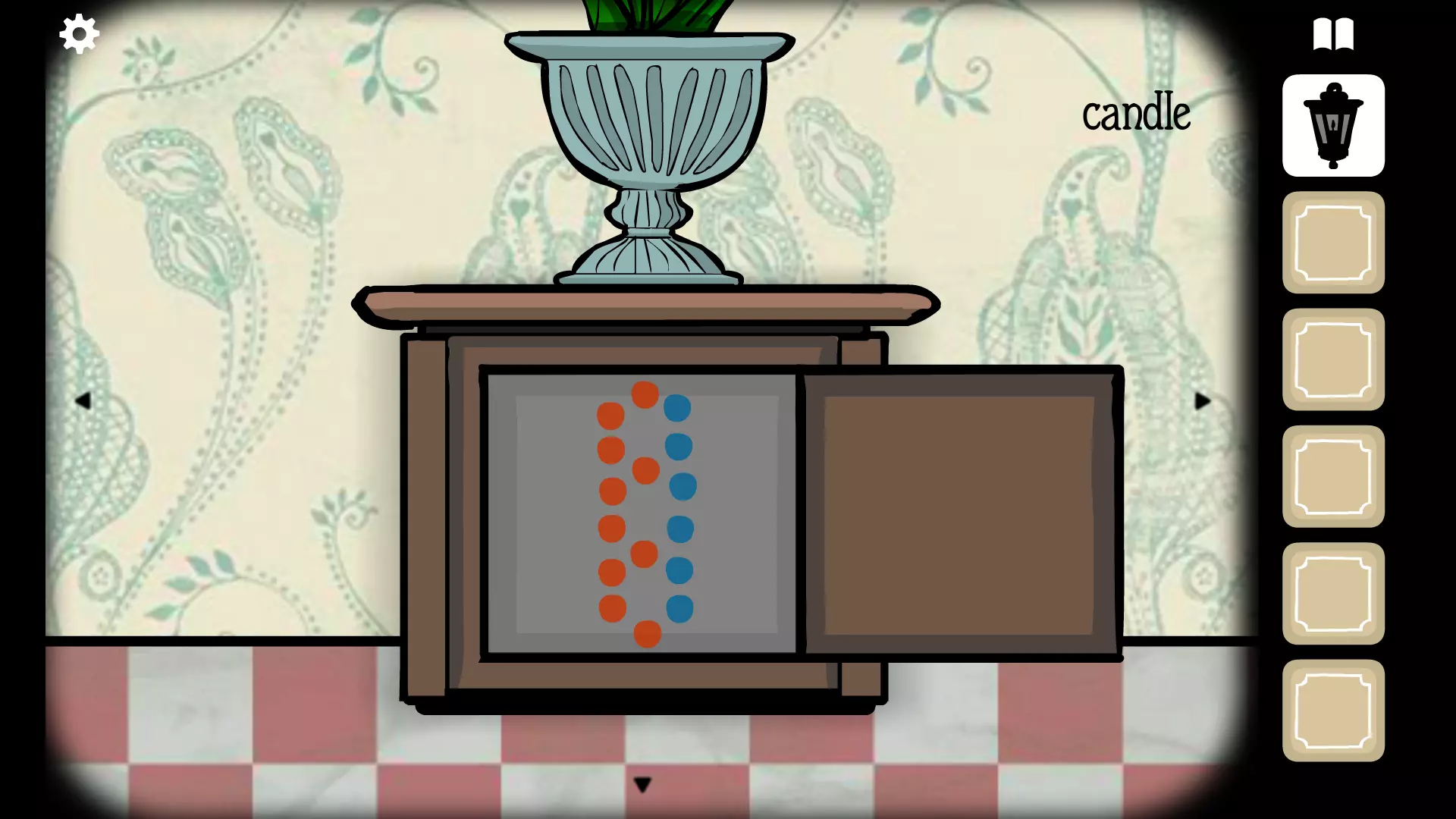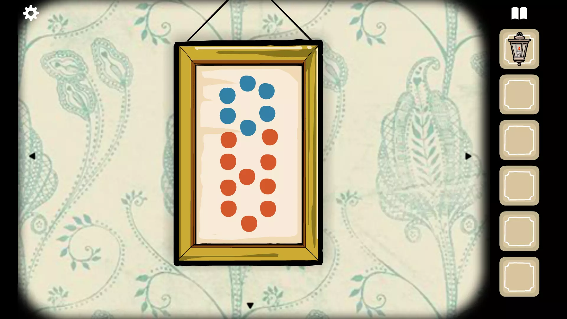 抽屉上方有一幅画,画中有红色和蓝色的圆圈。记住它们的位置,并将其用于门右侧的加热器。左侧的板条会打开,露出一个鸦片烟枪。拿起加热器上方的卫生纸。 放大查看三只猴子,点击第一只。它们敲击盘子的次数表示接下来需要点击哪只猴子(如果它敲击盘子两次,就应该点击第二只,以此类推)。如果点击了错误的猴子,它会张开手臂但不会敲击盘子。正确顺序为:第一只、第二只、第三只、第二只、第一只、第三只、第三只、第一只、第二只、第三只。它们都会敲击盘子。点击任意一只猴子,第三只猴子的头会脱落,露出一把钥匙。