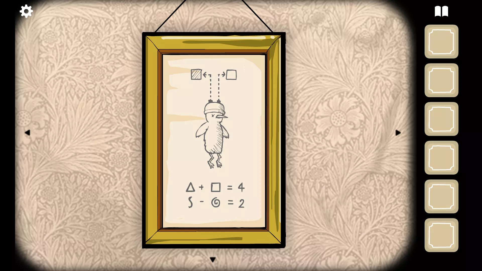 从右侧图片左侧露出的部分获取纸片。 放大收音机,获取其后方的纸片。按照磁铁装置左侧画作所示的顺序,通过点击左右旋钮切换电台。顺序为:第二、第三、第四、第三、第四、第三、第二、第一(90、100、110、100、110、100、90、80)。切换到下一个电台前需等待静电声结束。树枝会损坏收音机并出现一把钥匙,获取钥匙。 放大类似活动电影放映机的机器。从左上角获取钥匙。点击带有立方体图案的圆圈。将印有立方体侧视图(中间有线条)的纸片放入底部插槽,另一张纸片放入右上角插槽。点击圆圈外并扳动杠杆,让西洋镜开始运作。如果图画位置正确,其上方的灯就会亮起。 点击收音机左侧的桌子。这个谜题的目标是通过填充圆圈来困住即将离开板子的锹甲。每次填充一个圆圈,锹甲就会移动一格。尝试先填充最外层的圆圈。如果失败,点击板子即可重置。若成功填充锹甲周围的六个圆圈,点击它就能抓住。 用金钥匙打开收音机下方的柜子,获取玉米。 放大磁铁装置,将锹甲放入其中。它会开始跑动,使磁铁旋转并点亮灯光。 放大鸽子夫人,把玉米给她。点击她七次,从盘子上拿起钥匙。 解开方程式以确定每个符号的数值。然后,将这些数值用于门右侧机器上的插槽。三角形等于1,正方形等于3,螺旋形等于6,S等于8。密码是8613。缩小画面。 点击机器的门,用钥匙开锁。点击两个锁将它们取下。 扳动磁铁装置右侧的杠杆,幼鸟会按住它。 按下特斯拉线圈旁边的按钮,在闪电停止后,点击鸽子夫人两次以完成该房间。 私人房间(仅在第6晚开放):猫头鹰先生 与猫头鹰先生交谈。他会让你查看黑色立方体。房间周围有五台机器,里面装有黑色立方体。点击每一台机器。 再次与猫头鹰先生对话。盖板会升起,露出一个白色立方体。点击它两次。 你会发现自己身处一片森林中。点击两个立方体,继续移动,直到点击了八个立方体。再次移动,你会看到一部电梯正在上升。在它离开屏幕前点击它,否则你将不得不移动并返回。点击电梯三次以完成游戏。