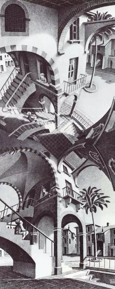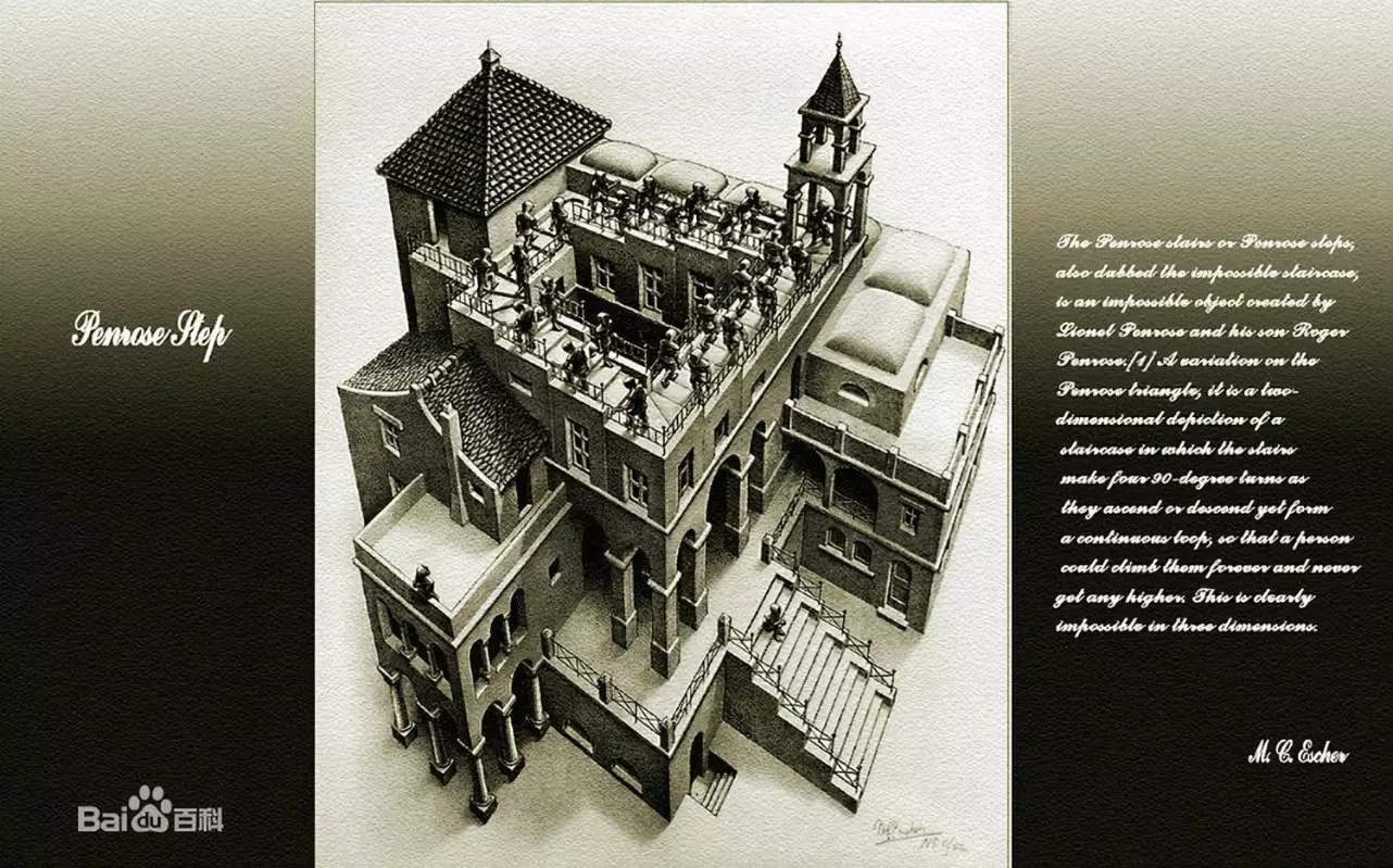 同样在1958年,他们提出了彭罗斯阶梯(Penrose stairs),它可被视为彭罗斯三角的变体,但二者又完全不同。埃舍尔对此深感兴趣,于是创作了《攀高和下行》这一作品。