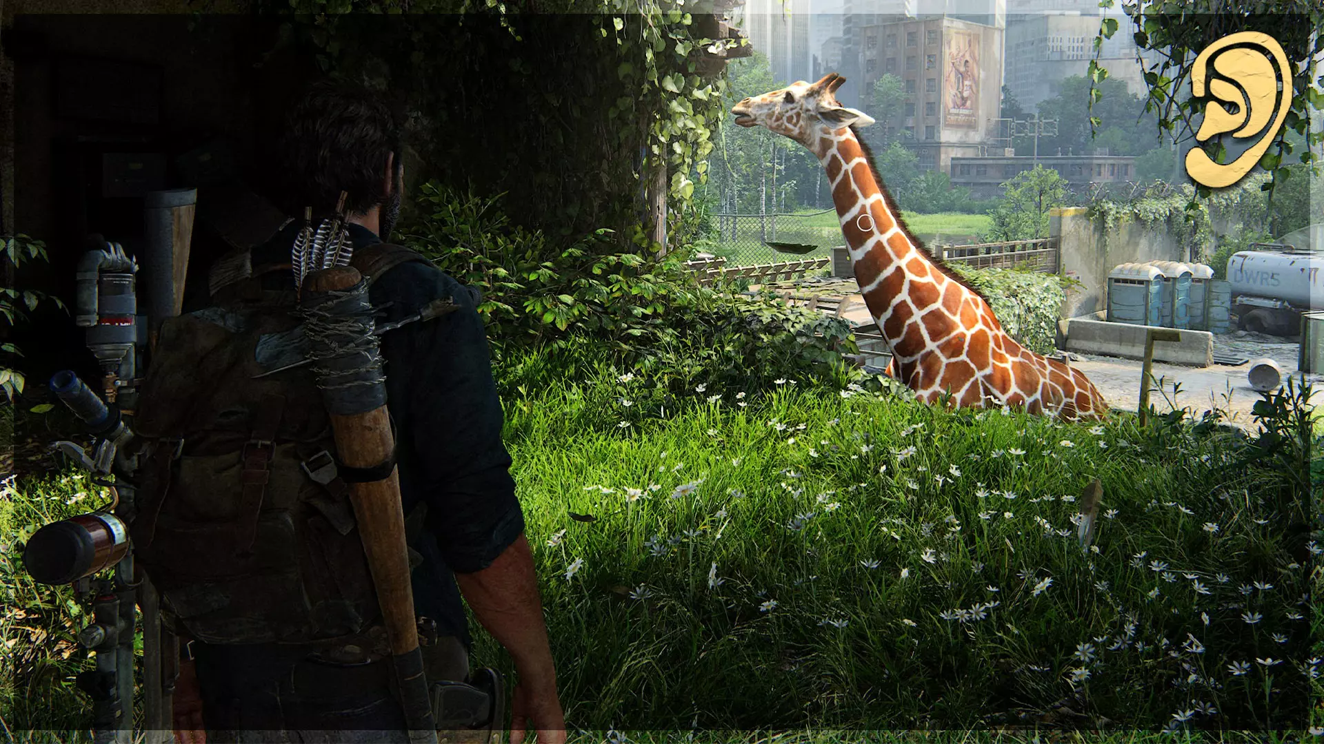 可选对话(38/54) 爬上梯子后,跟随艾莉进入有一只正在吃草的长颈鹿的房间。与它互动。