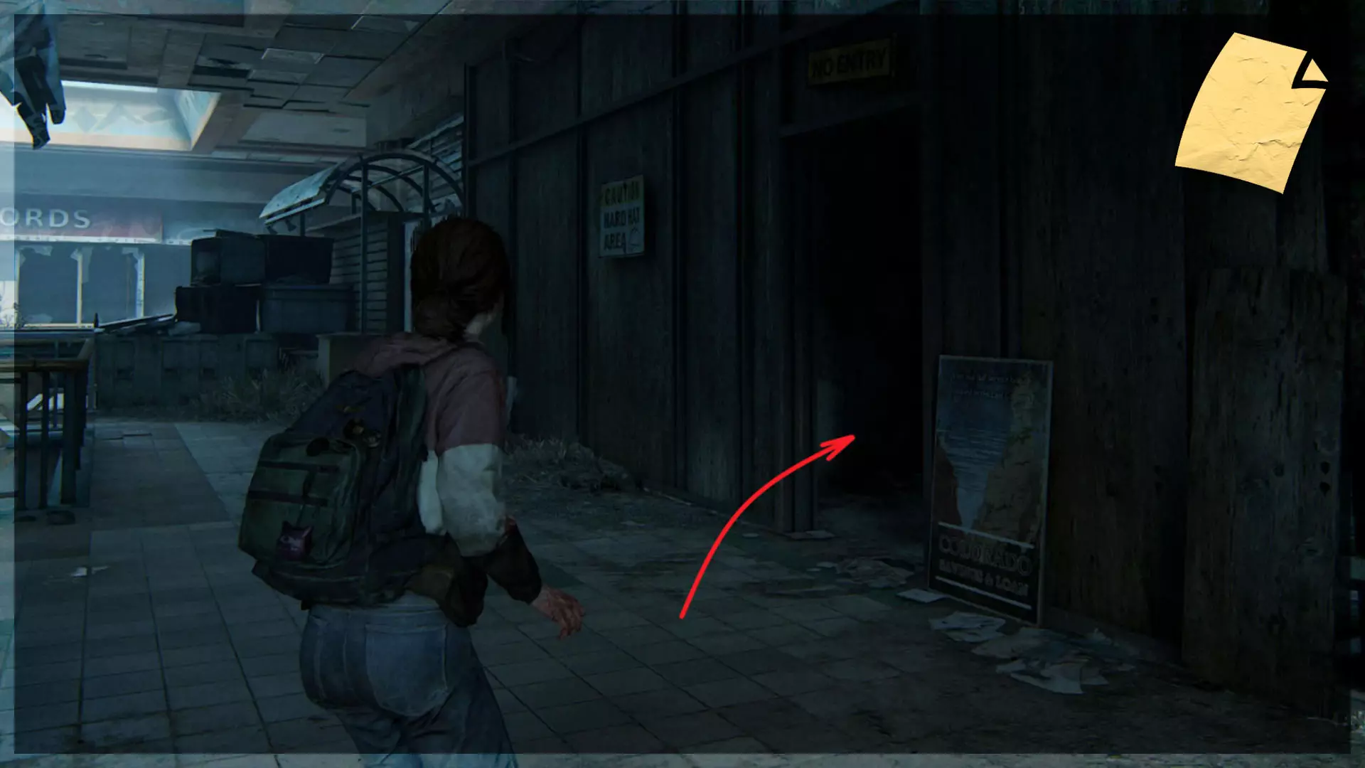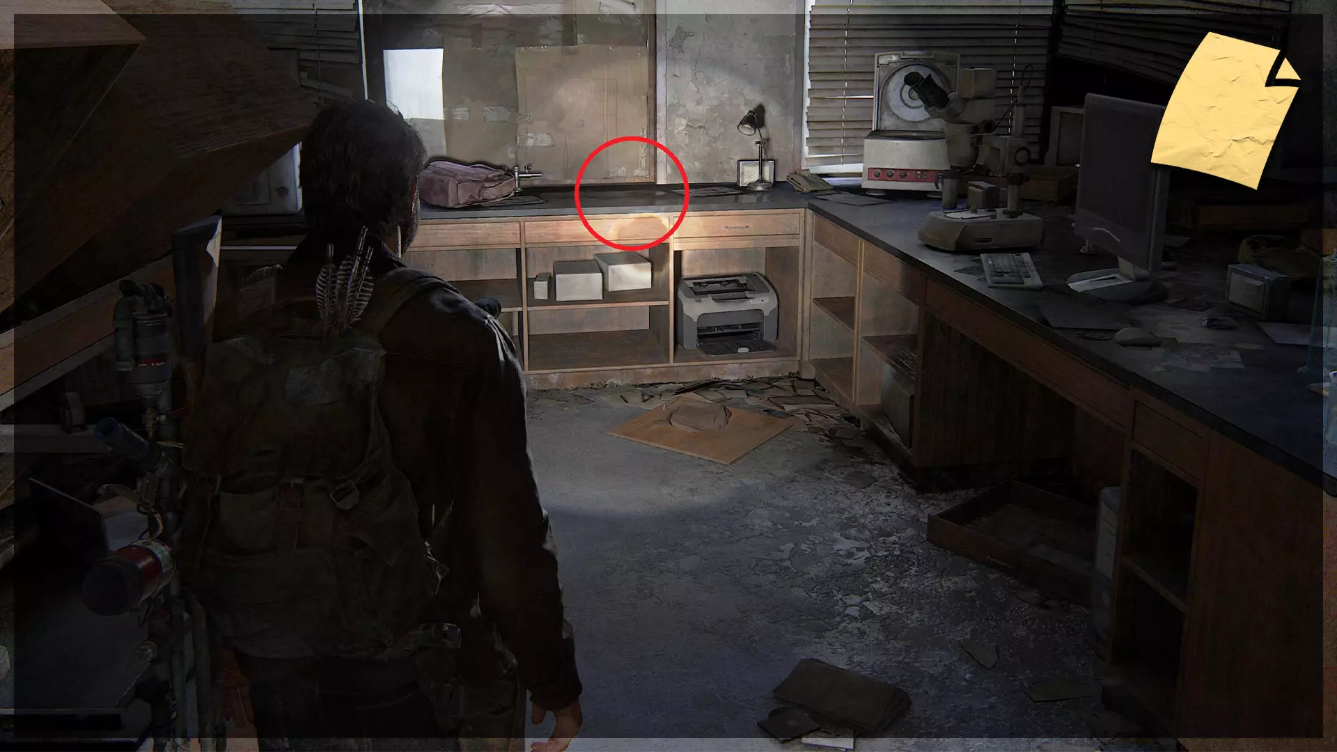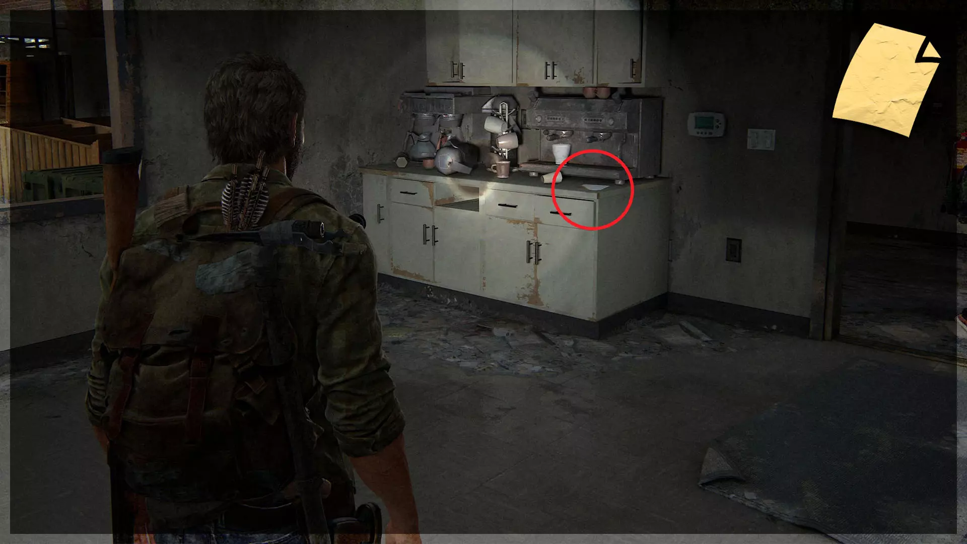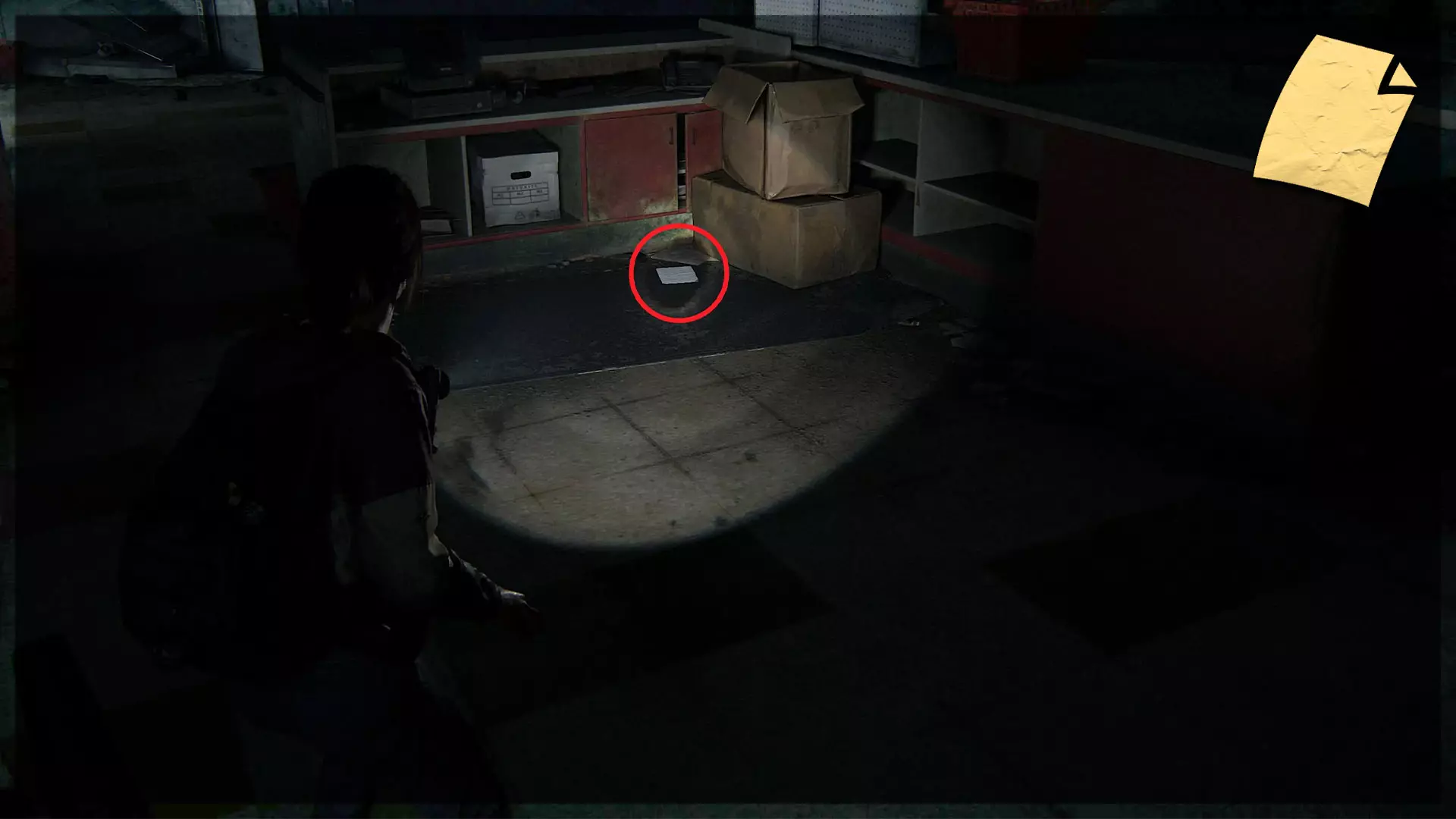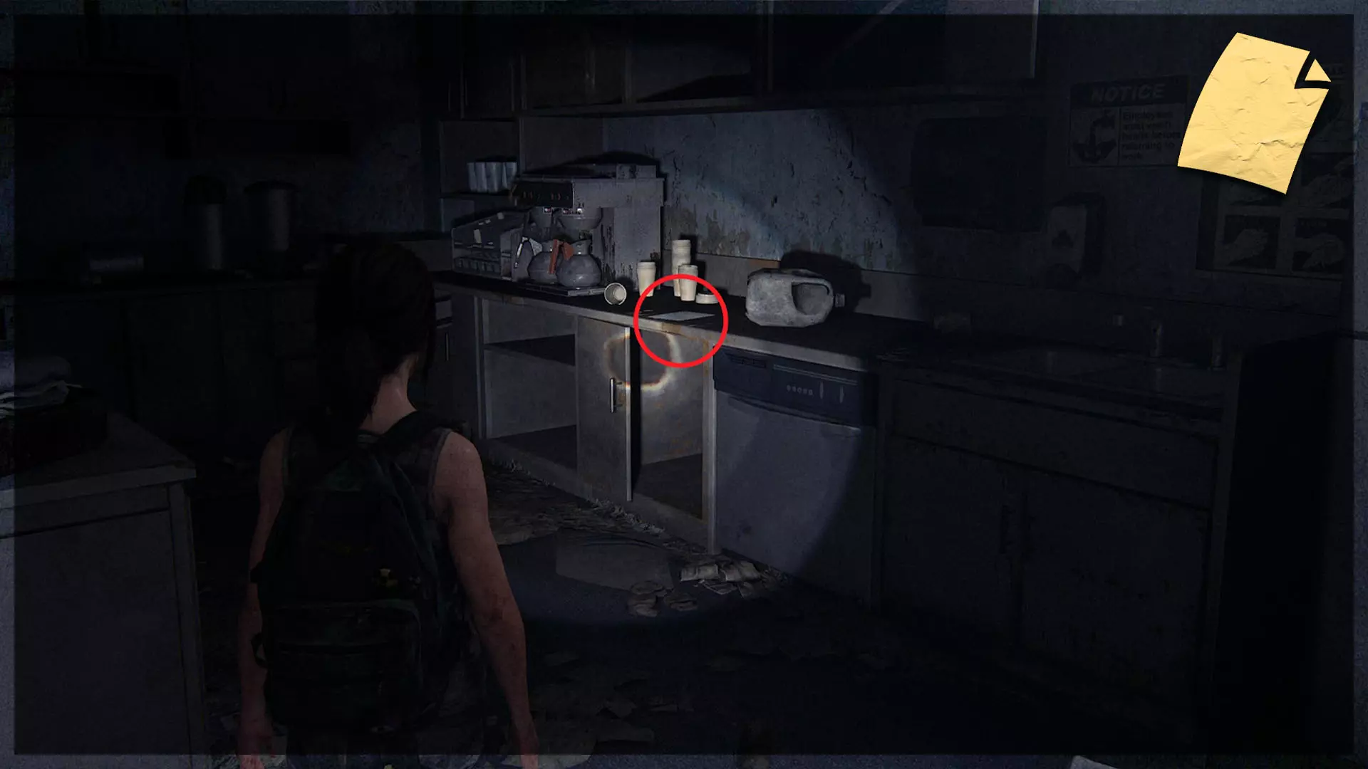 【遗物】(34/97) ➥ 废弃区域笔记 沿着商店的墙壁进入厨房区域。笔记会在一个柜台上。