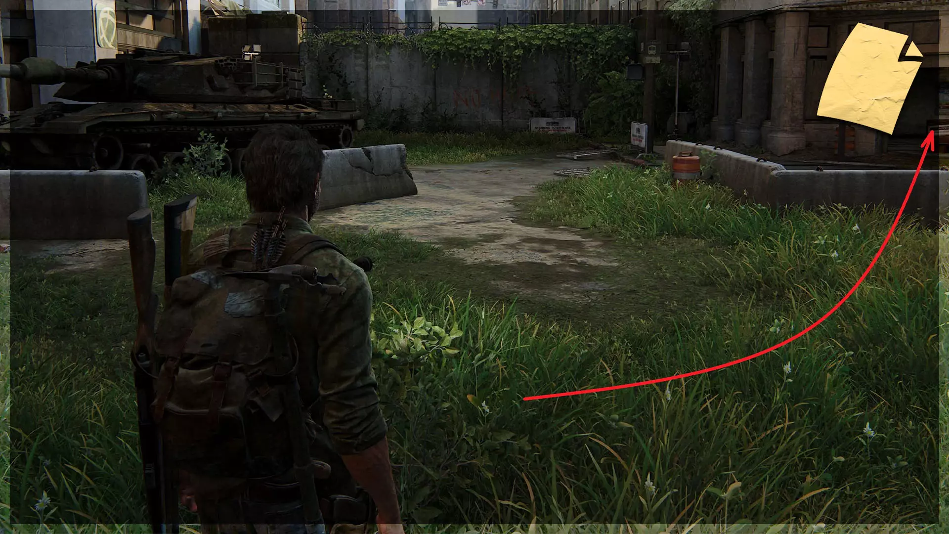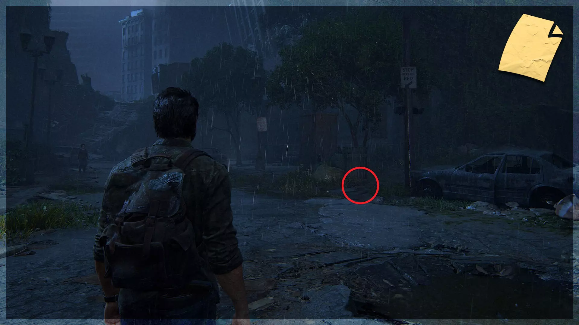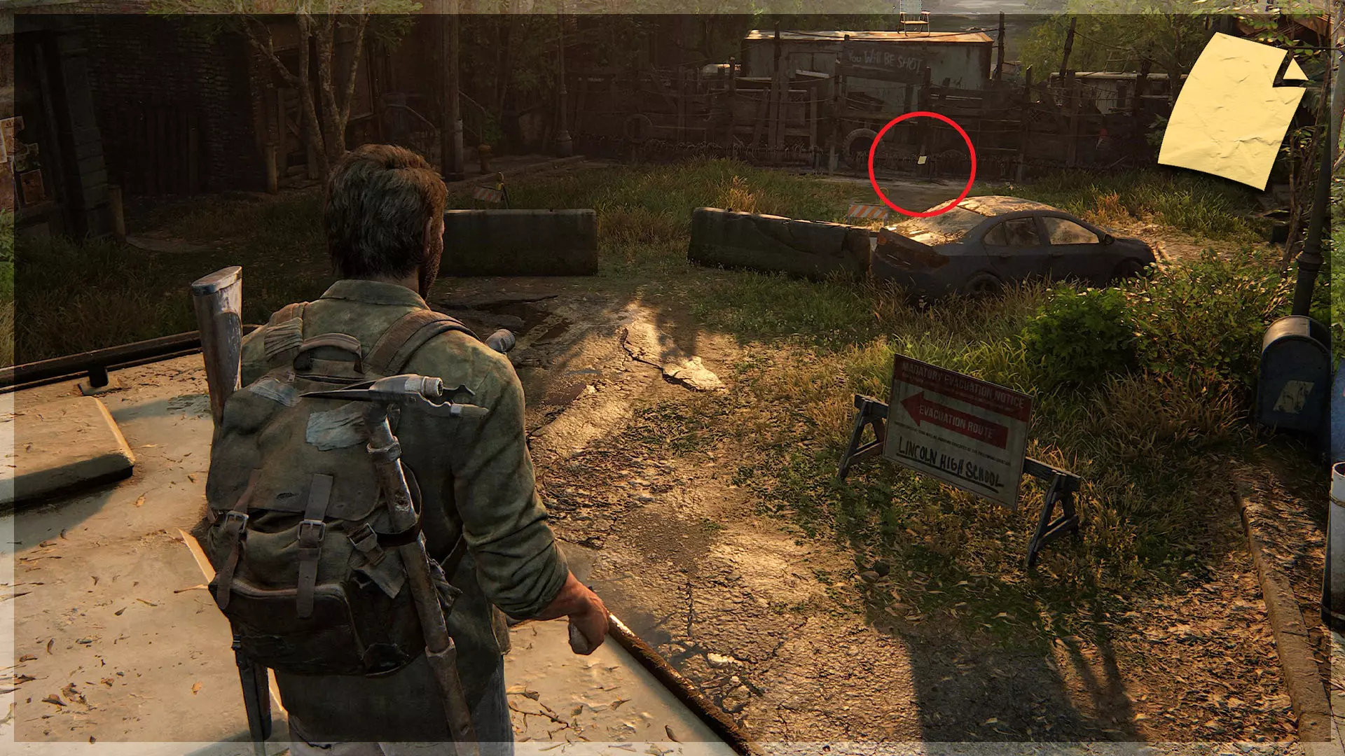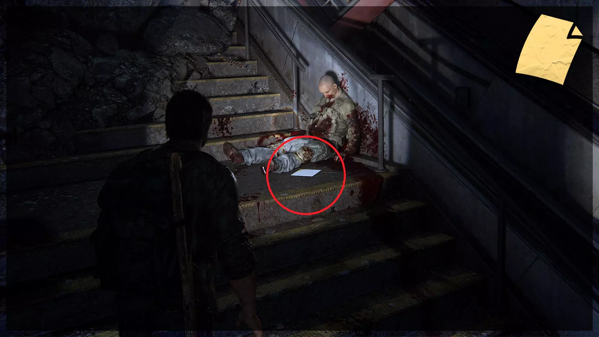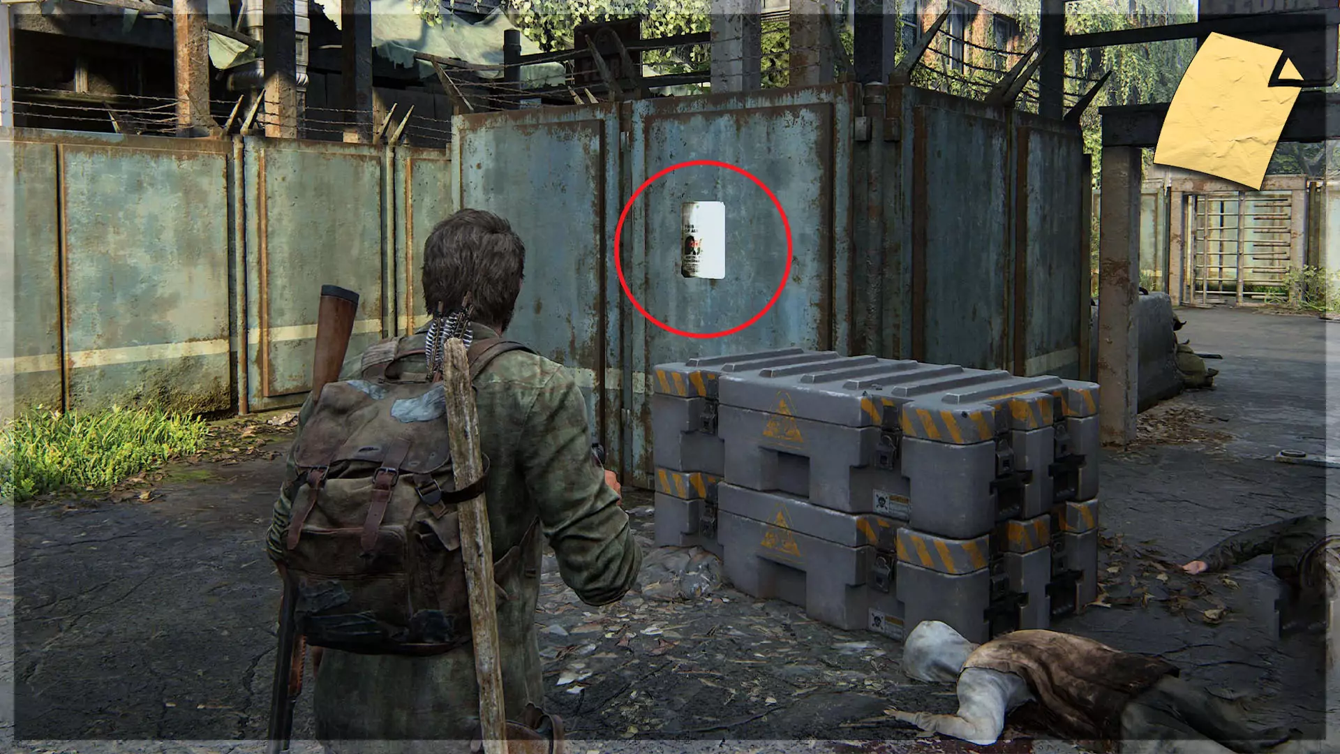 遗物(10/97) ➥ 疏散传单 出去后,你需要爬上一条破损的道路到达街道层面。这件遗物位于右侧人行道上,在一根路灯柱和一个垃圾桶之间。