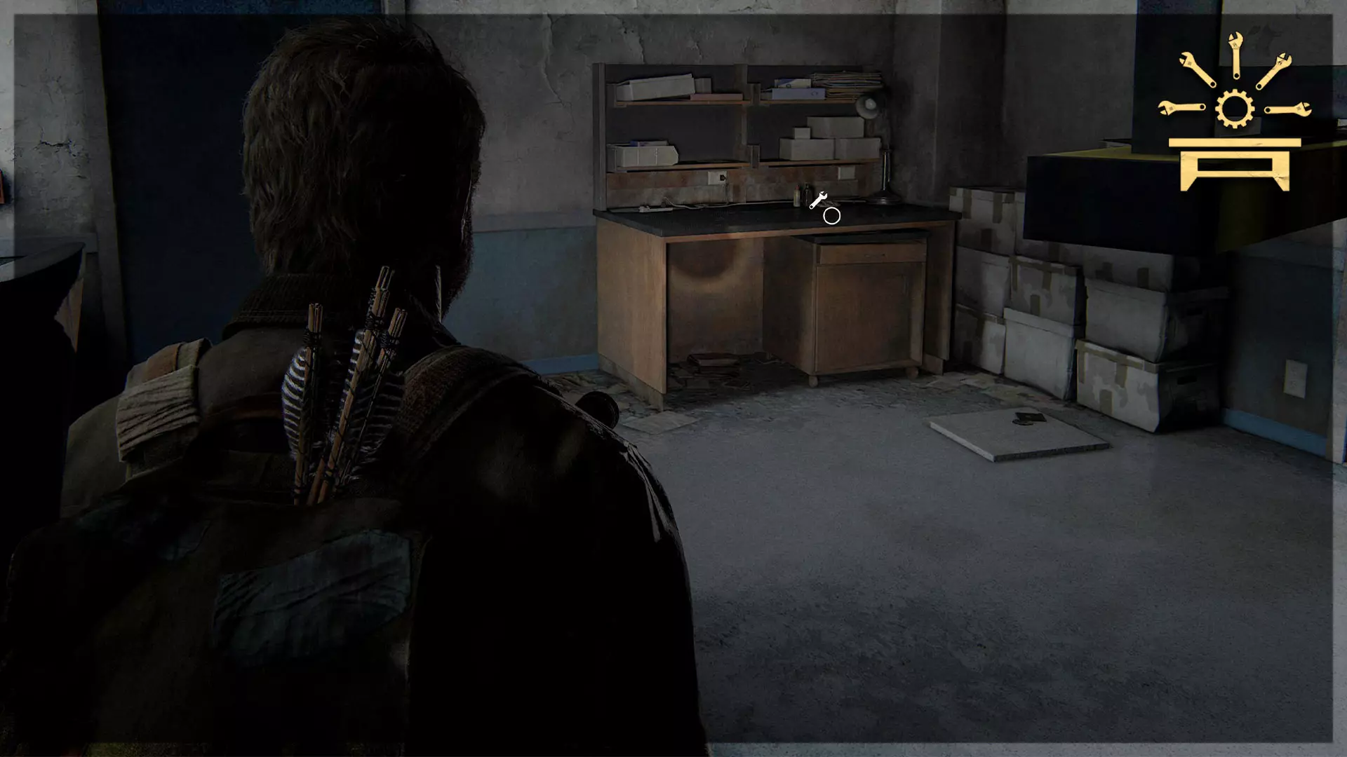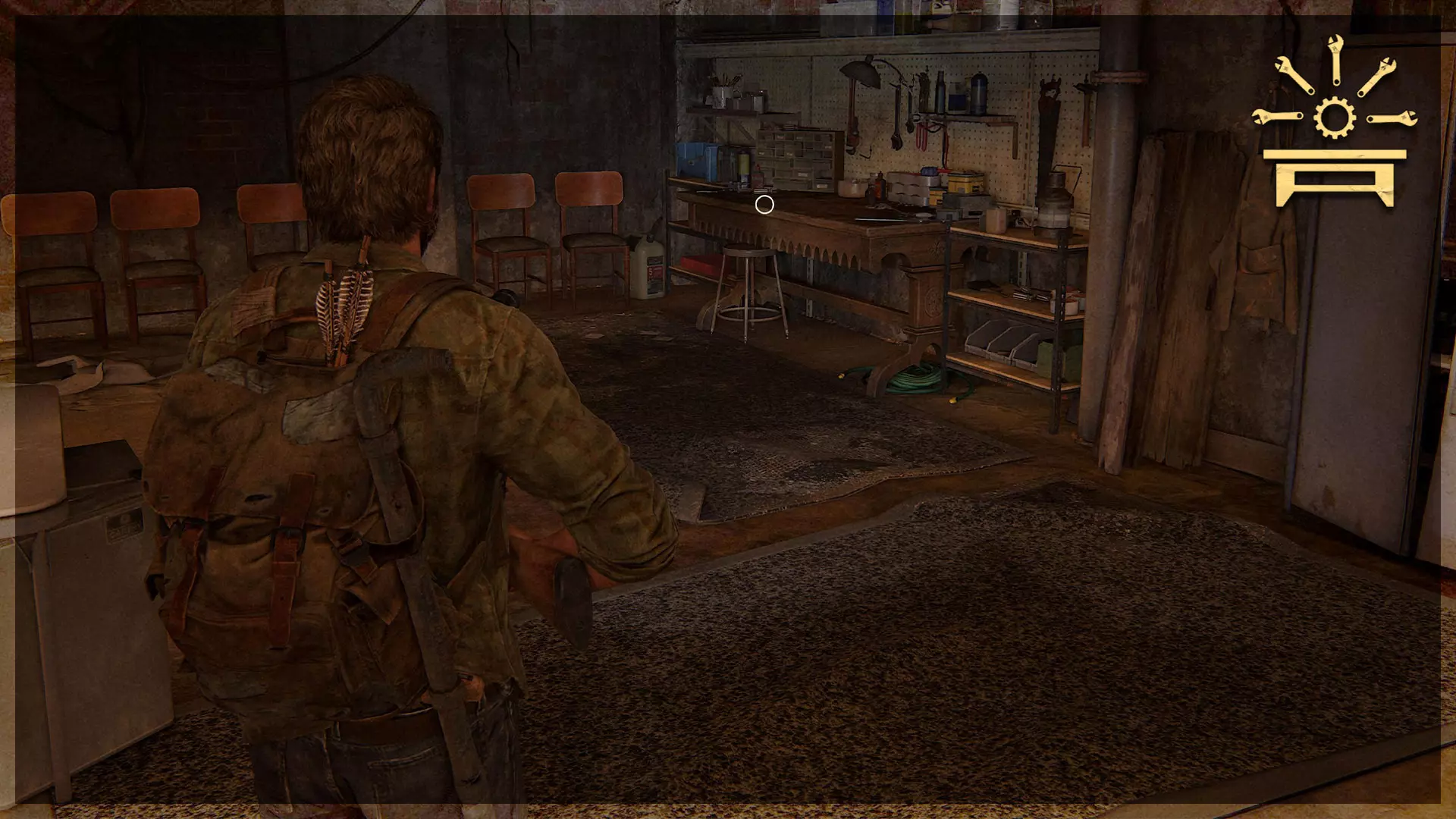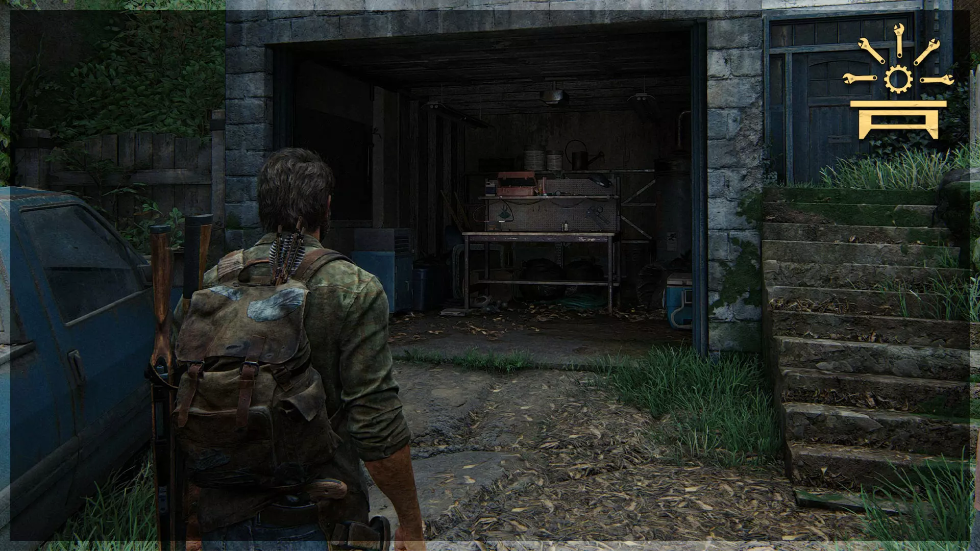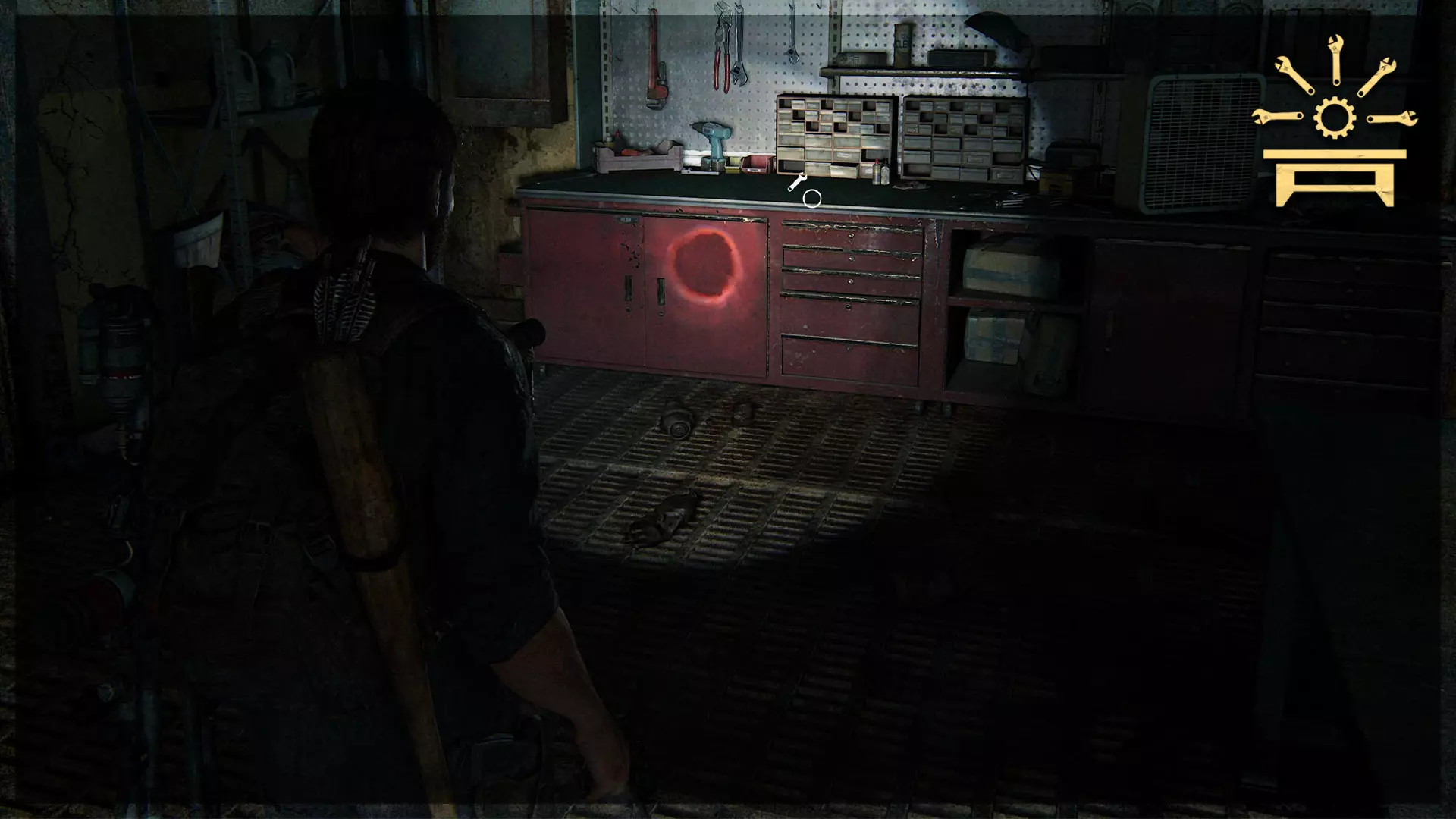 可选对话(14/54) 工作台工具(2/5) 收集品(29/97)→ 游客清单 处理完猎人后,进入车库,与衣物堆旁的艾莉交谈,获取带有收集品的工具。