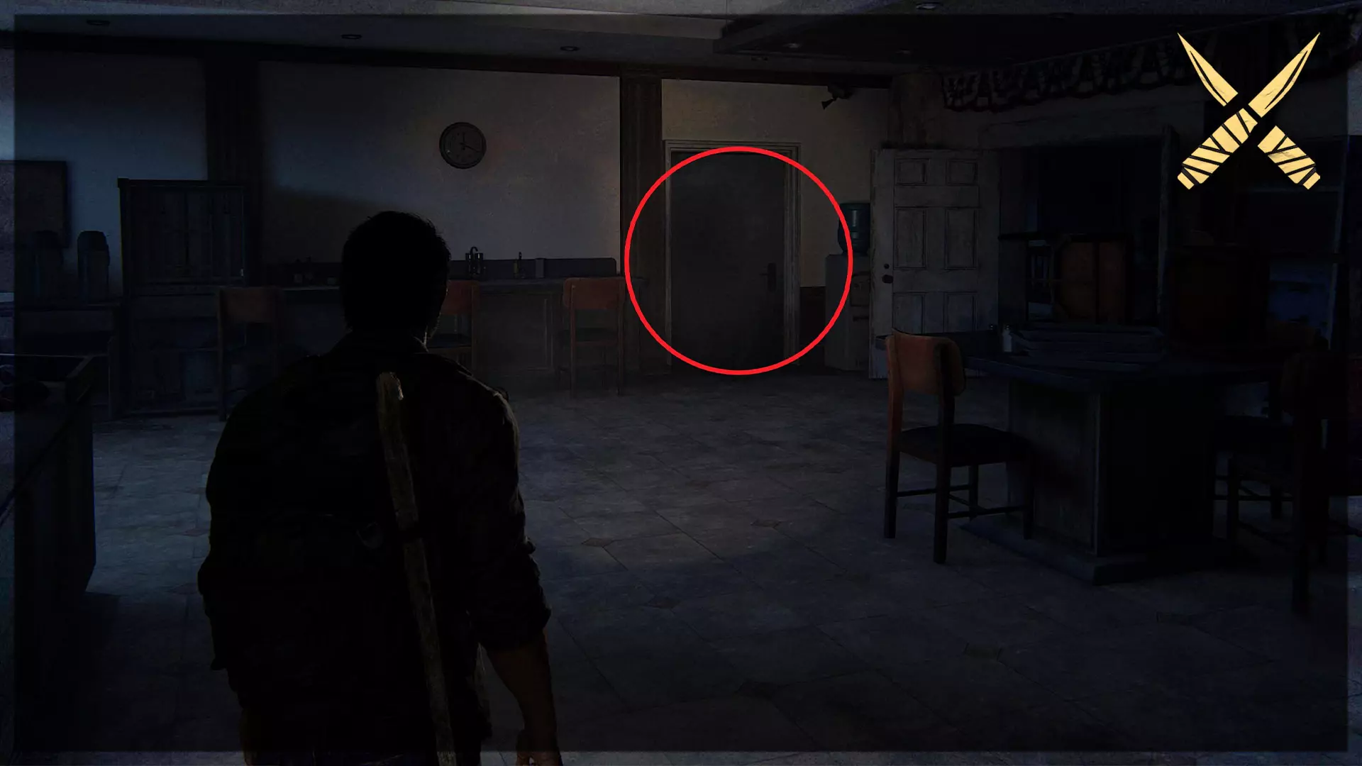 Shiv门(2/13) 当你与泰丝和艾莉分开后,会遇到一些循声者。左侧厨房区域会有Shiv门。