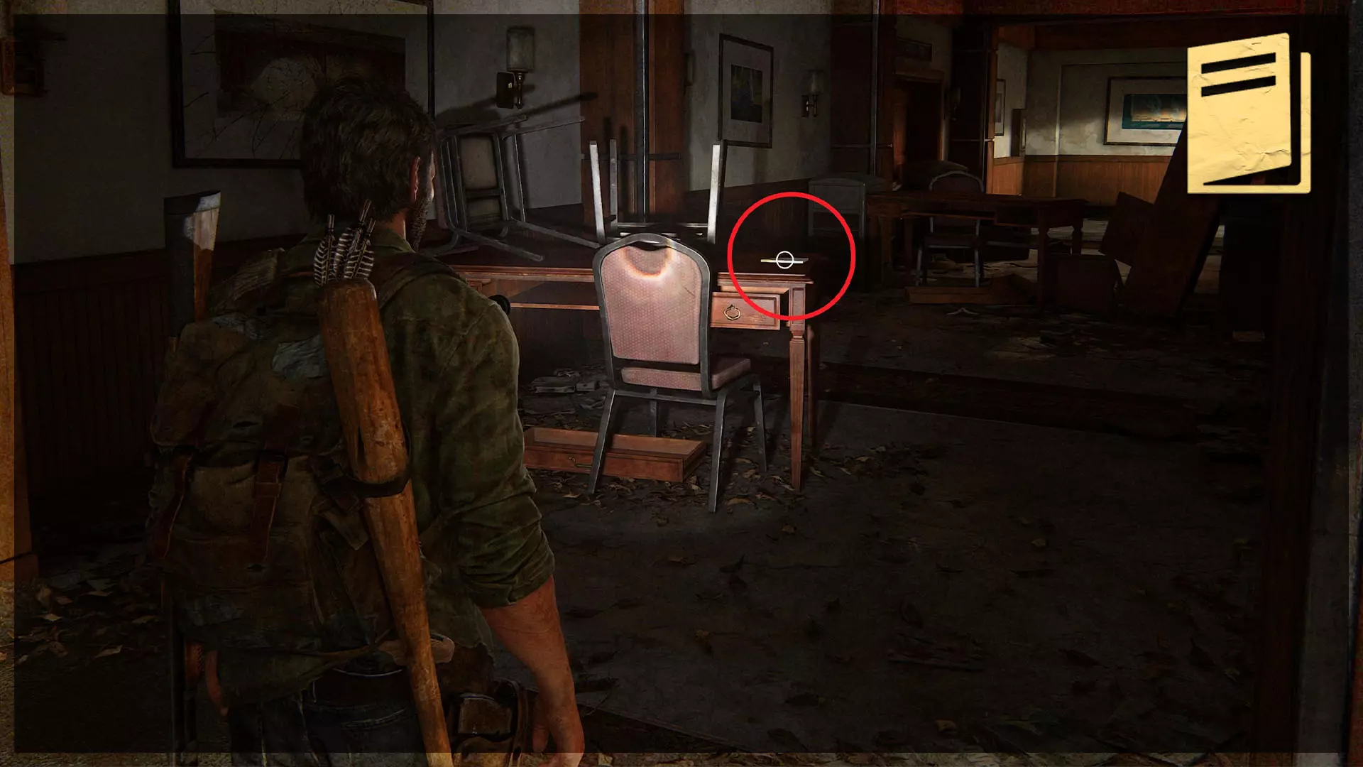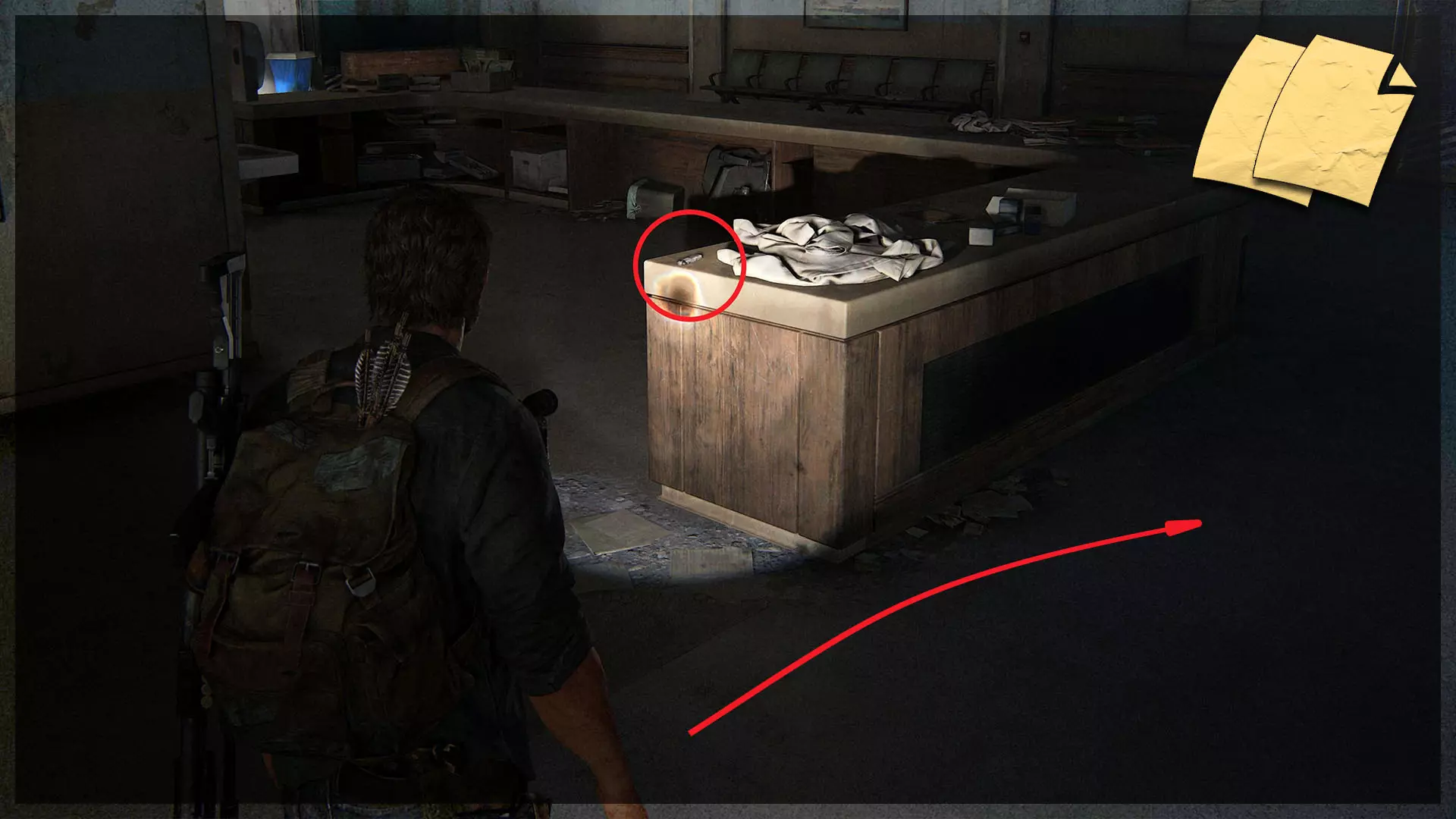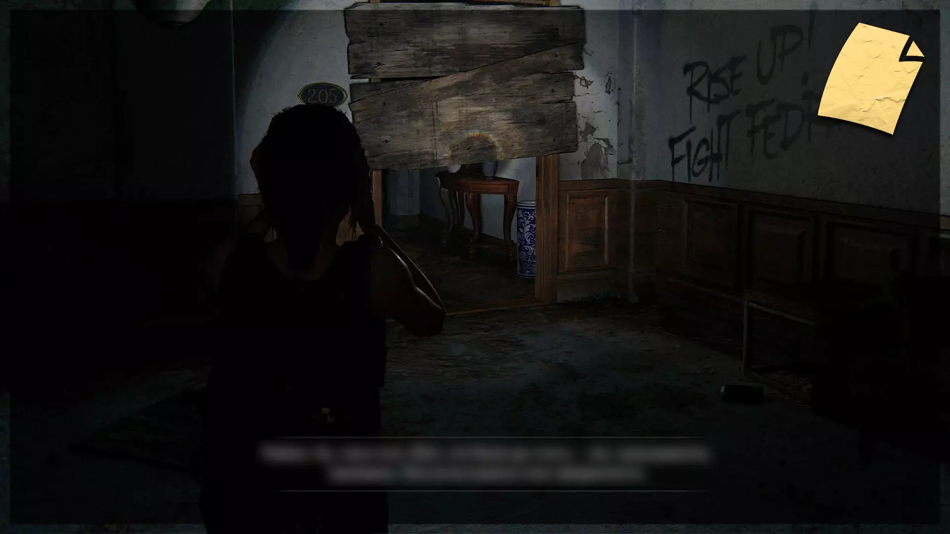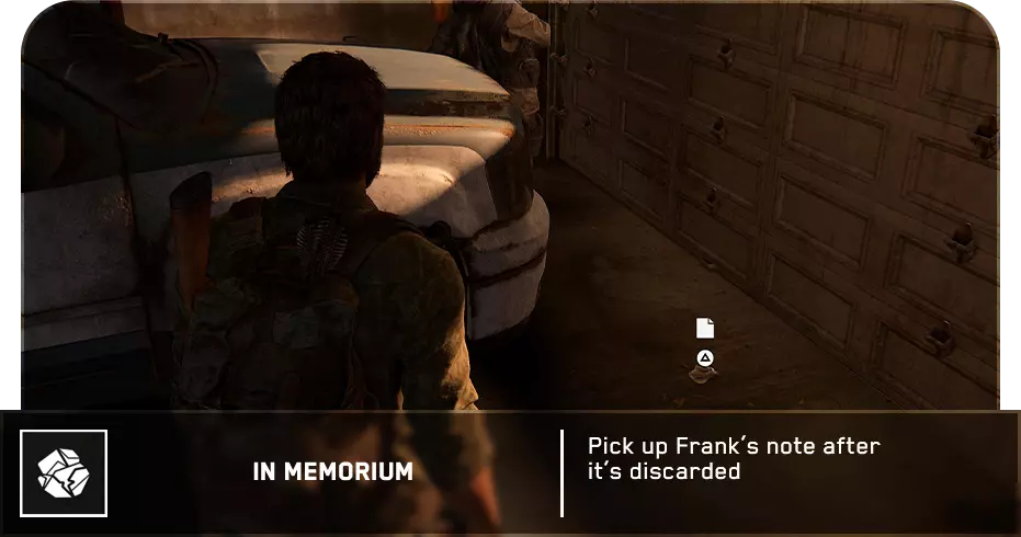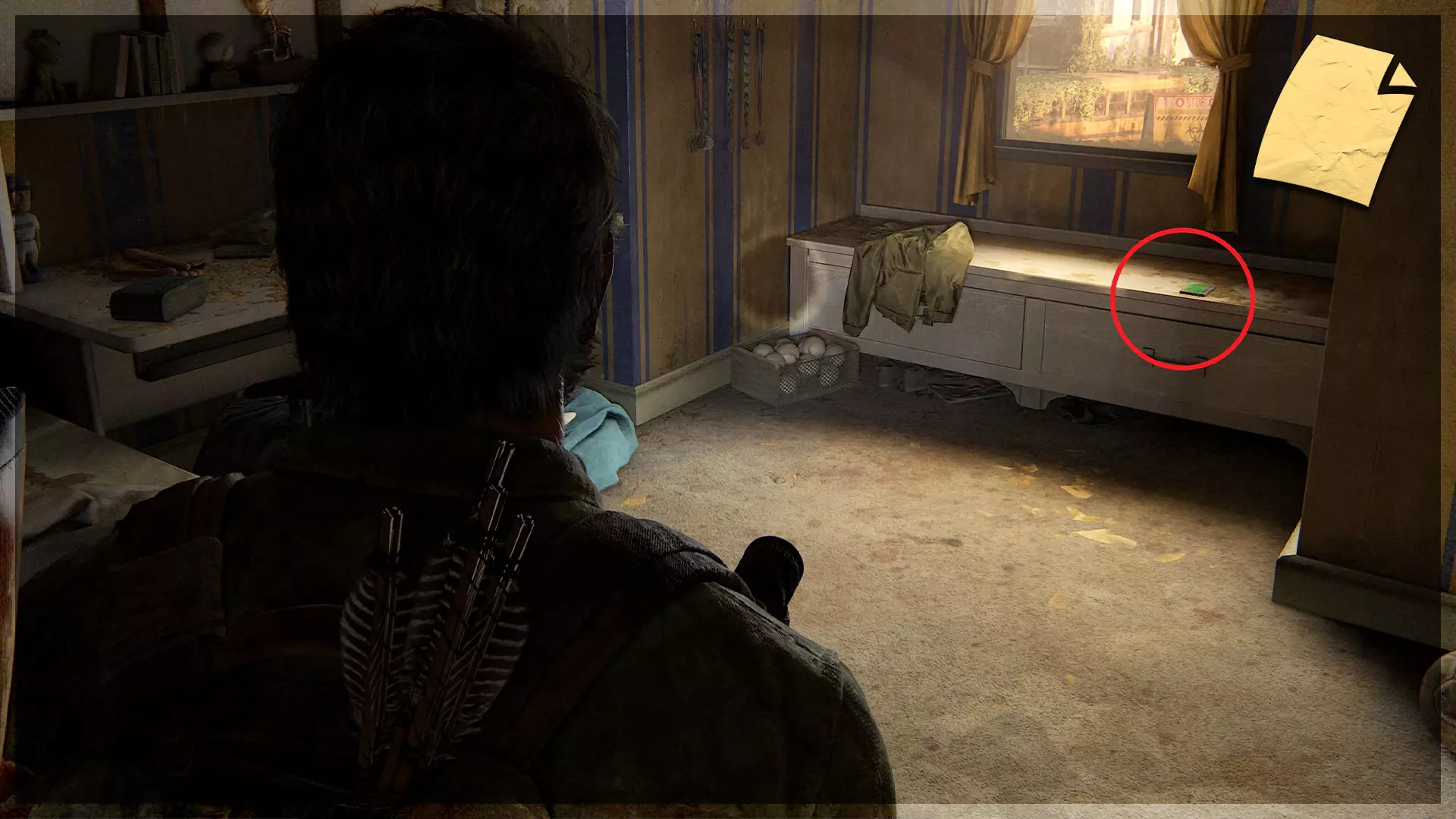 【物品】(8/97) ➥ 苔丝的清单 章节开始时,它会直接出现在你面前。如果你正在加载章节或重新加载检查点,它会在你身后的房间里。