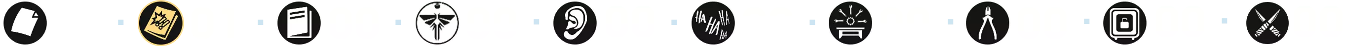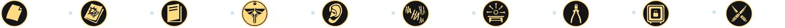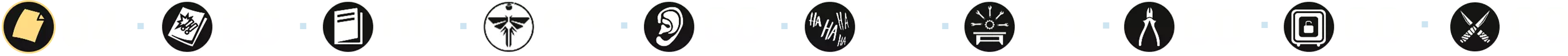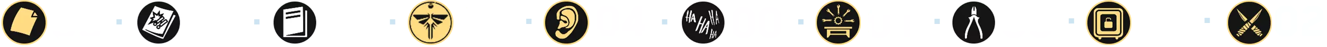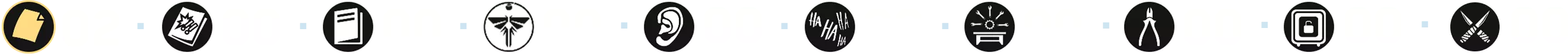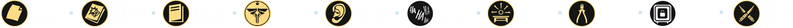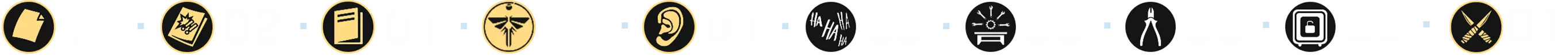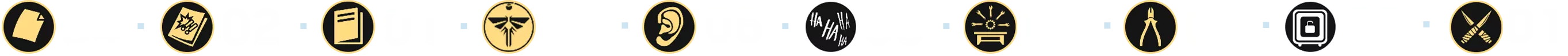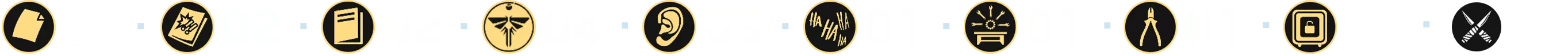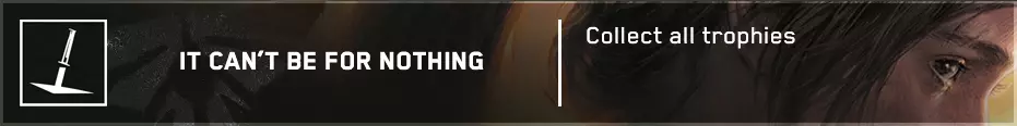 成就的主要部分包括收集所有[254]个可收集物品,这些物品散布在主游戏及其剧情DLC的几乎每个关卡中: - 文物 — 97个(❏ 14个); - 漫画 — 30个; - 萤火虫吊坠 — 30个; - 训练手册 — 12个; - 可选对话 — 57个(❏ 14个); - 艾莉的笑话 — 6个(❏ 1个);笑话算作可选对话 - 工作台 — 11个; - 工具 — 5个; - 保险箱 — 4个; - Shiv门 — 13个; (❏ <DLC中出现的收集品数量>)已为每个章节制作了摘要,其中每种收集品都有其独特的标识和颜色