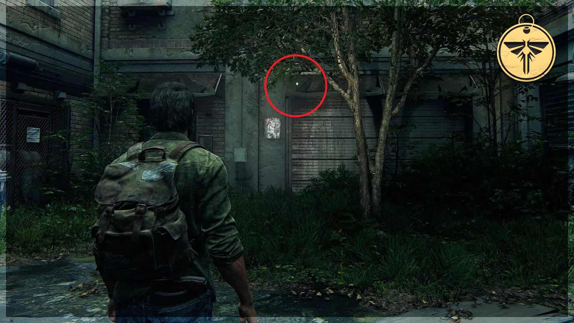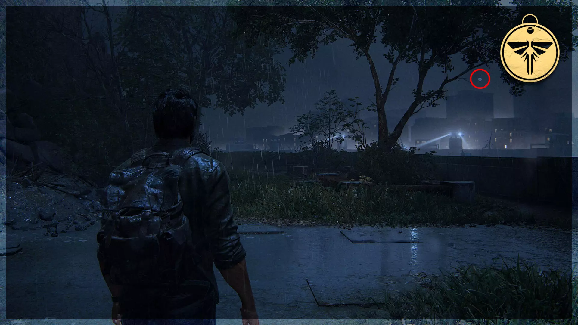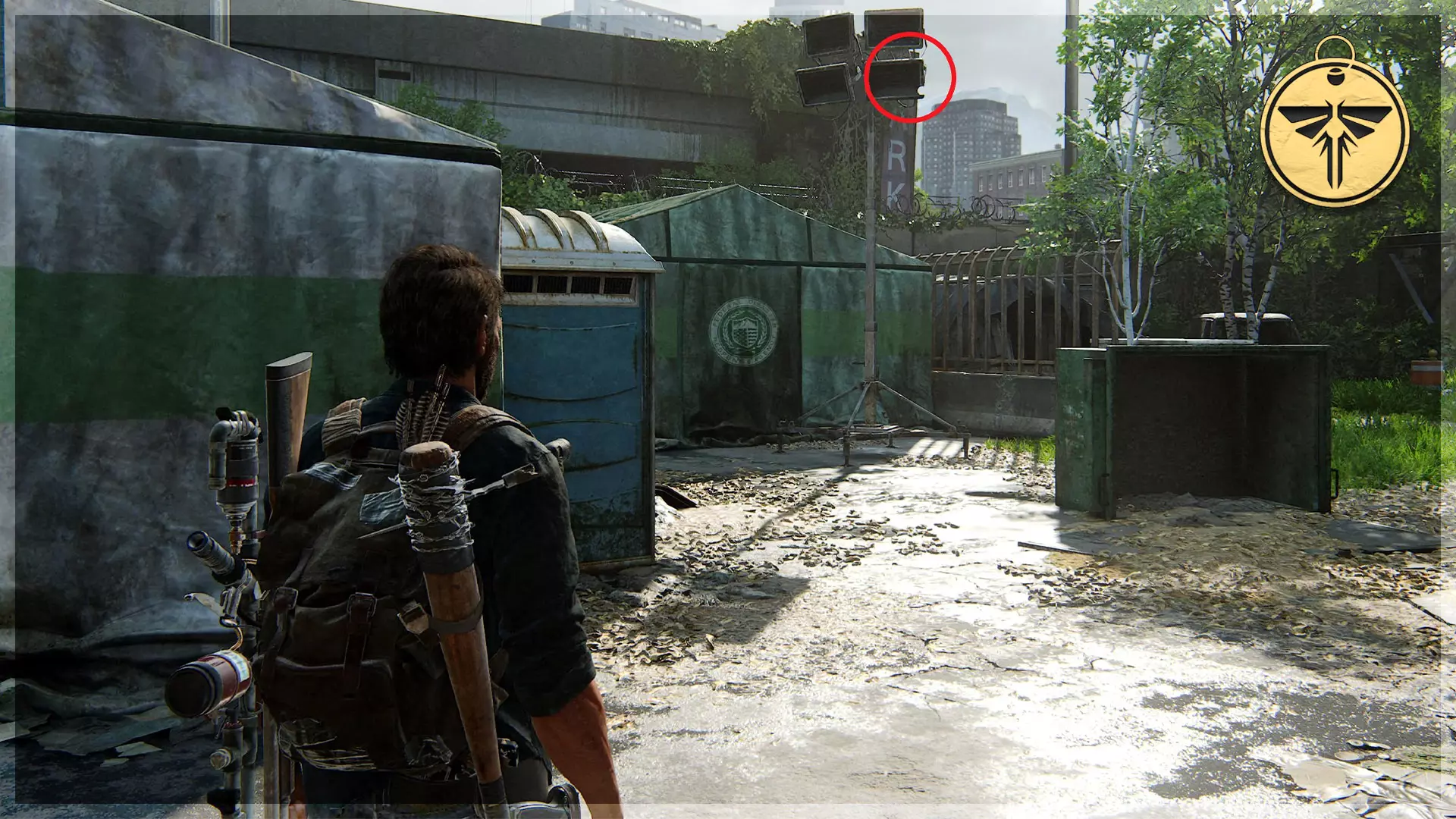 萤火虫吊坠(28/30) ➥ 妮可·胡 走过帐篷后向左看,会看到栅栏附近有一盏泛光灯。萤火虫吊坠挂在泛光灯上,将其击落即可。