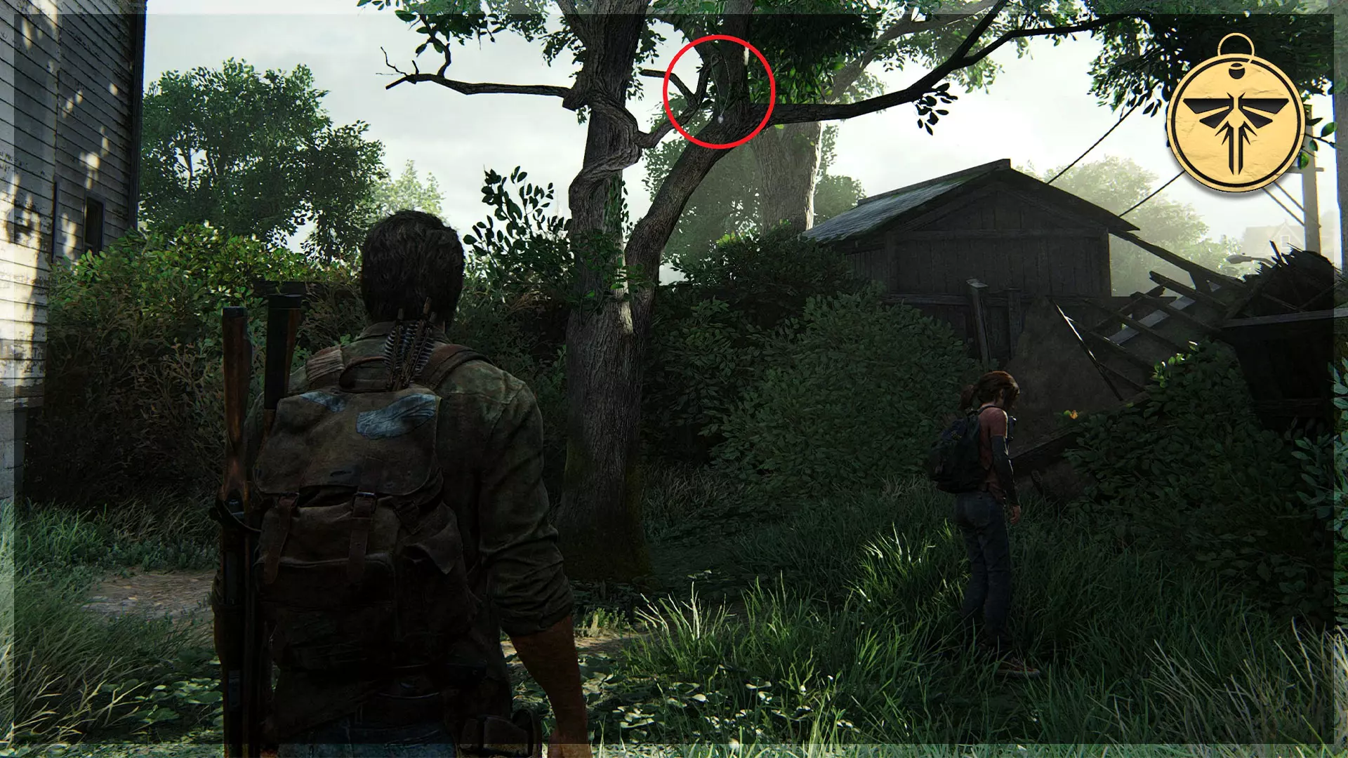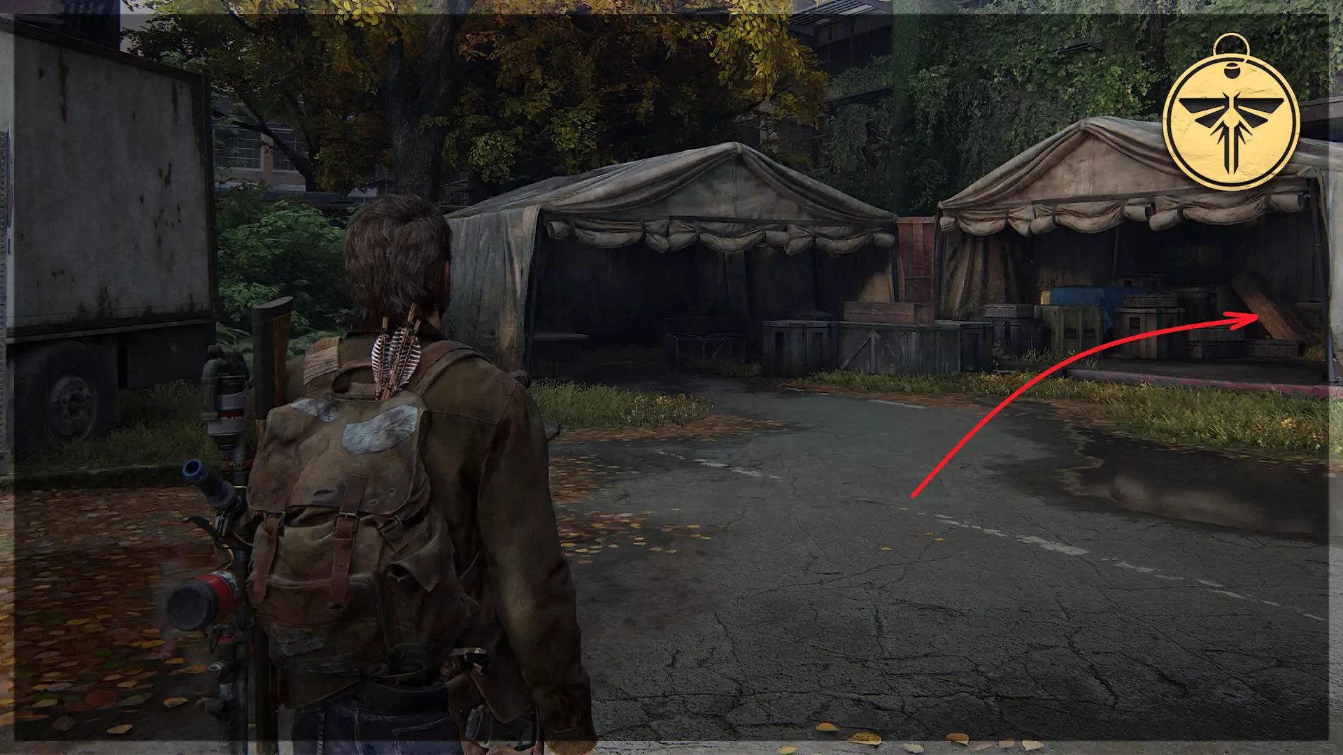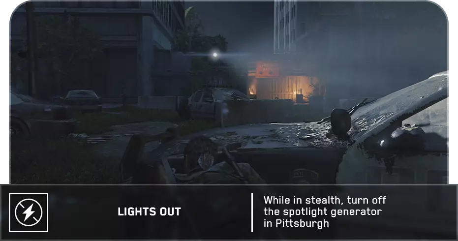 萤火虫吊坠(28/30) ➥ 妮可·胡 走过帐篷后向左看,会看到栅栏附近有一盏泛光灯。萤火虫吊坠挂在泛光灯上,将其击落即可。
