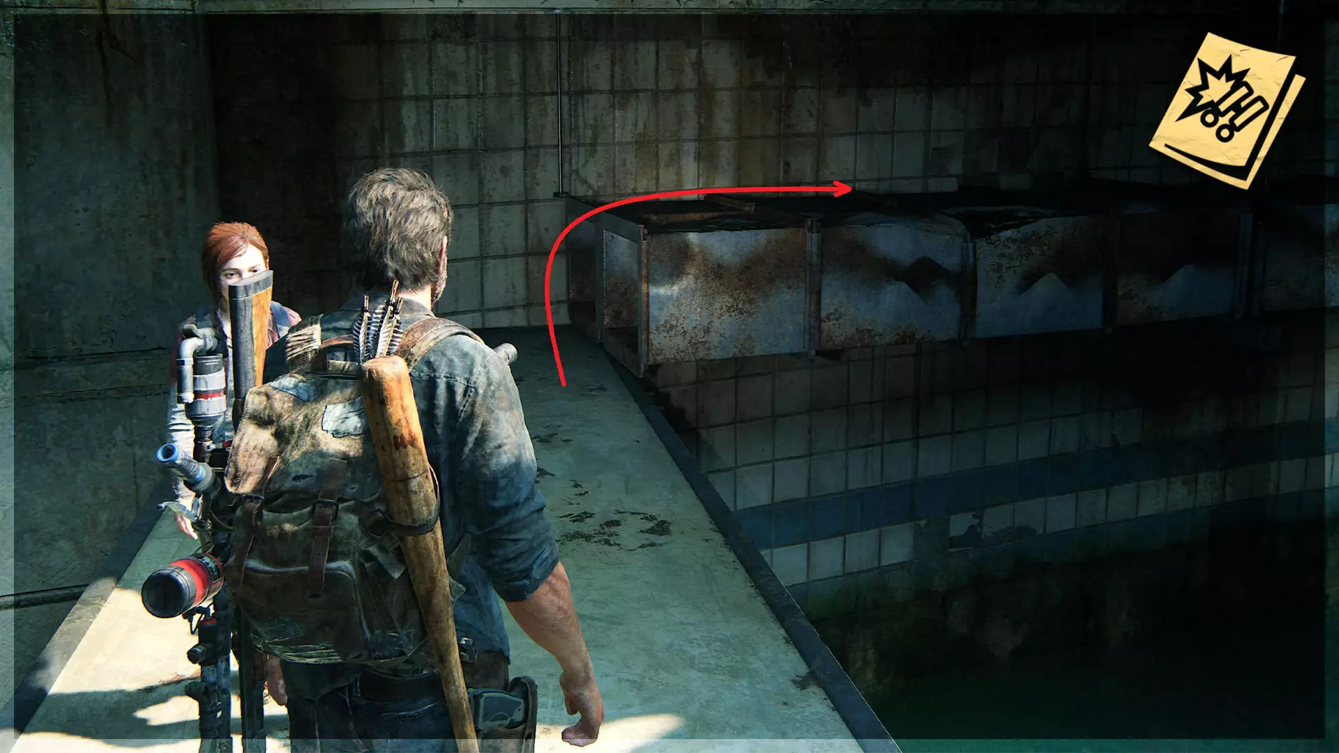 漫画(12/13) ➥ 催化 推进剧情,直到需要放下梯子帮助艾莉爬上卡车。从卡车上,走到通风管上,在尽头拿到漫画。