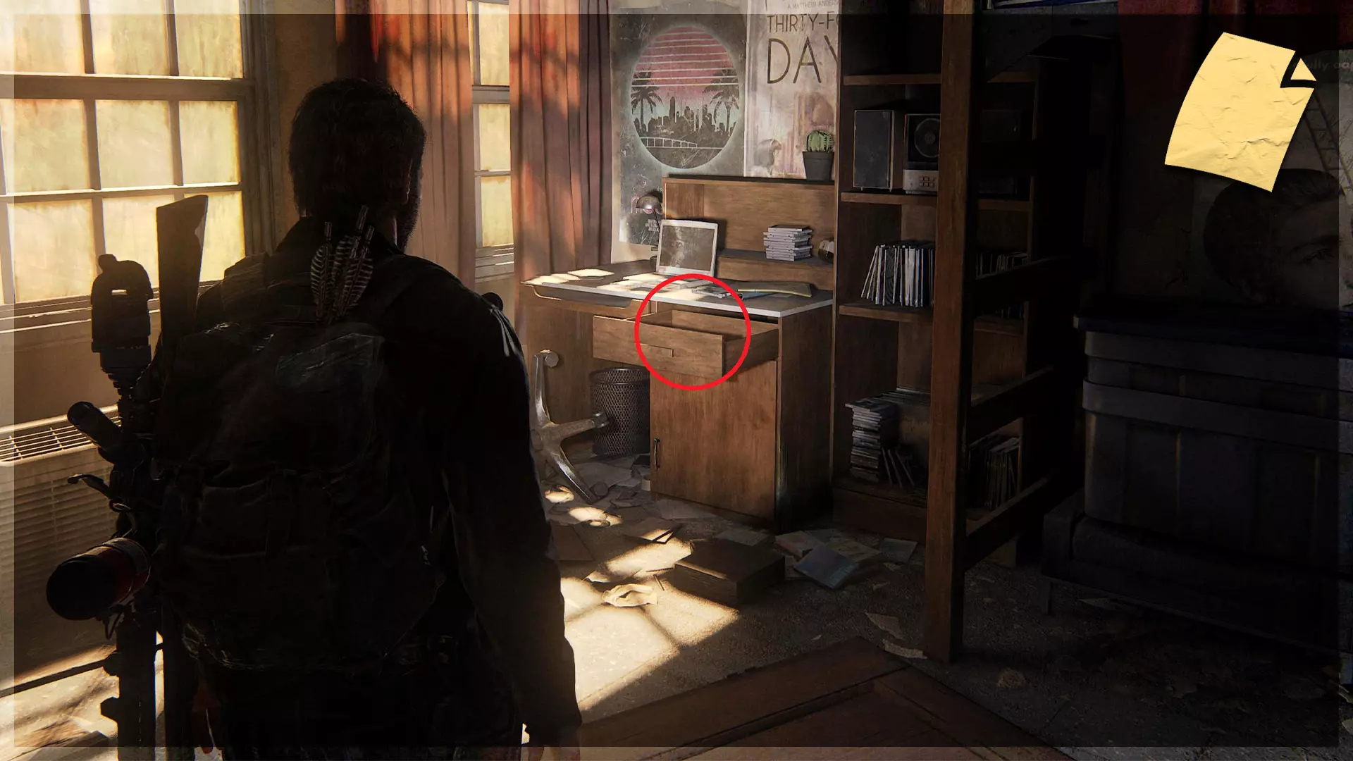 遗物(13/97) ➥ 给德里克的便条 在地铁的购物区有很多点击者和奔跑者,进入你左边的商店。检查柜台后面的抽屉,就能找到这个遗物,里面有保险箱的密码。