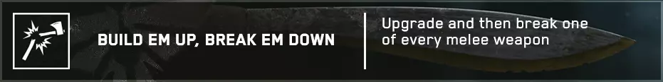 【Build Em Up, Break Em Down】这个成就要求你拾取游戏中的5种近战武器,使用制作材料【Binding】和【Blade】对它们进行升级(除非你捡到的是已升级的近战武器),并为每种武器使用额外的生命值攻击敌人。 5种近战武器分别是:2x4、钢管、棒球棍、斧头、砍刀。 前3种武器很常见,随处可见,而斧头和砍刀仅分别出现在【Tommy's Dam】章节的水电站和牧场房屋中。