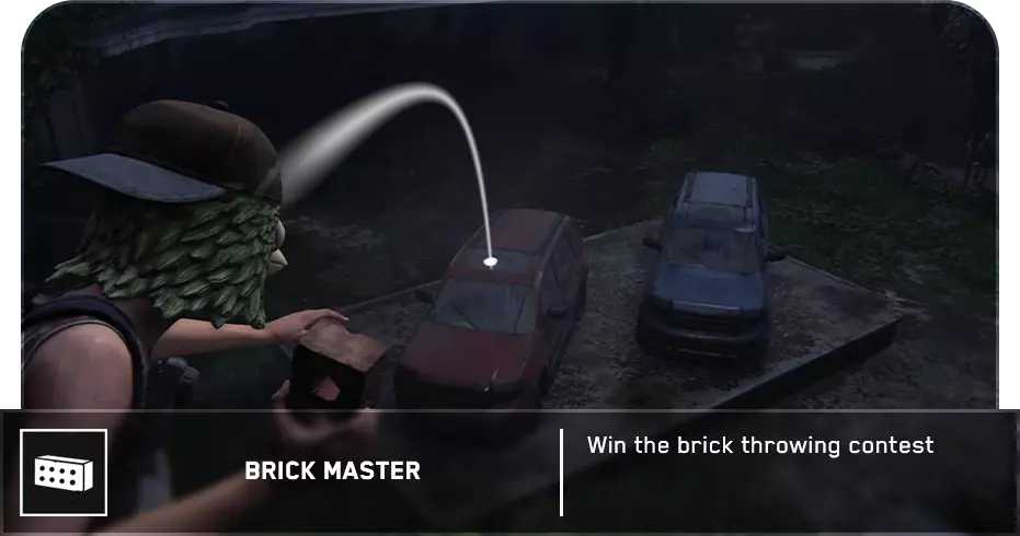在参观万圣节商店后,莱利会向你发起一场扔砖块比赛。你需要用砖块摧毁红色汽车的【7个】窗户。 如果莱利在比分上领先,并说她还剩最后一个未打破的窗户,重新加载检查点以确保她不会赢得比赛。
