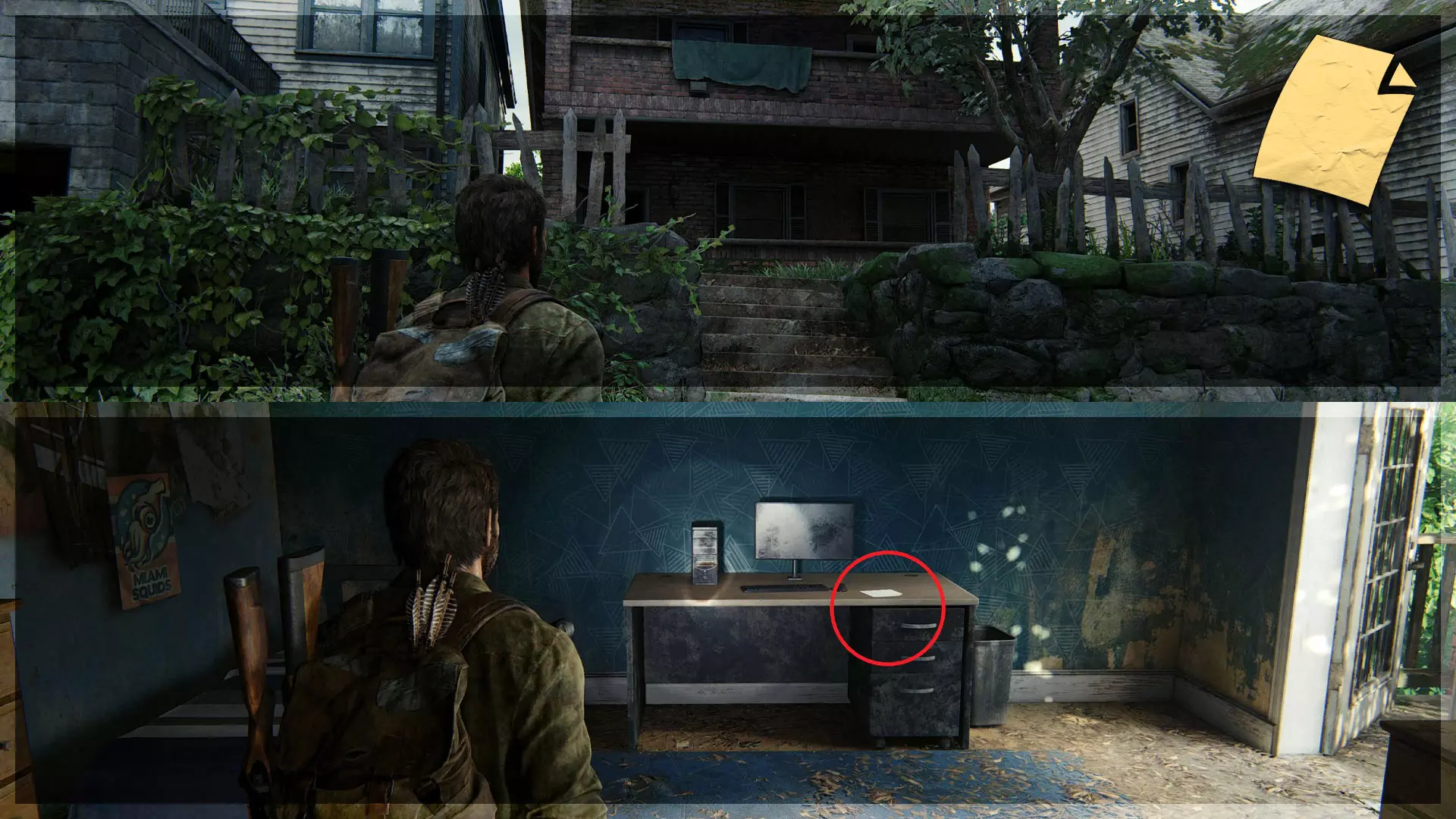 漫画(9/13) ➥ 未知 当你追踪鹿到一栋建筑时,进入左侧房间,在书桌的抽屉里可以找到漫画。