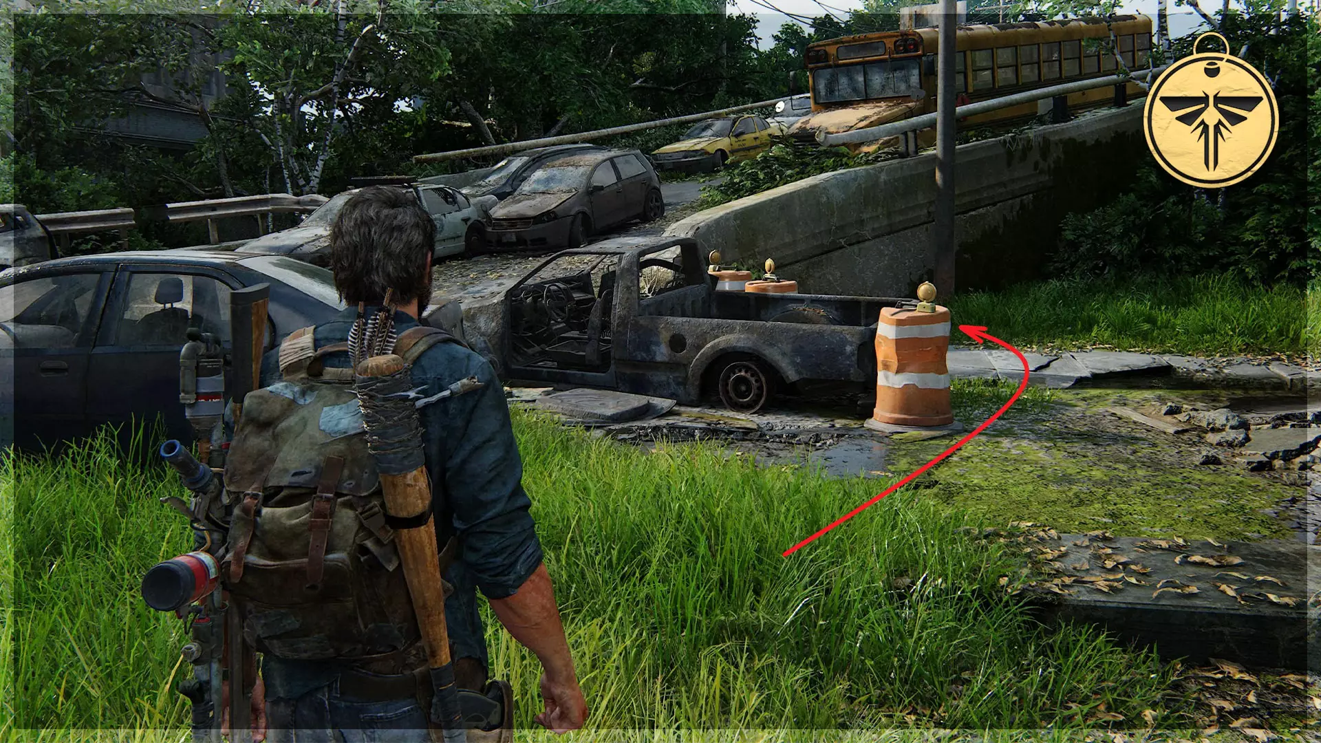 萤火虫吊坠(27/30) 获取者:卡特琳娜·佩里奇 沿着斜坡向下走,直到经过一辆校车。走到校车后面,在一些橙色 cones 旁可以找到这个吊坠。