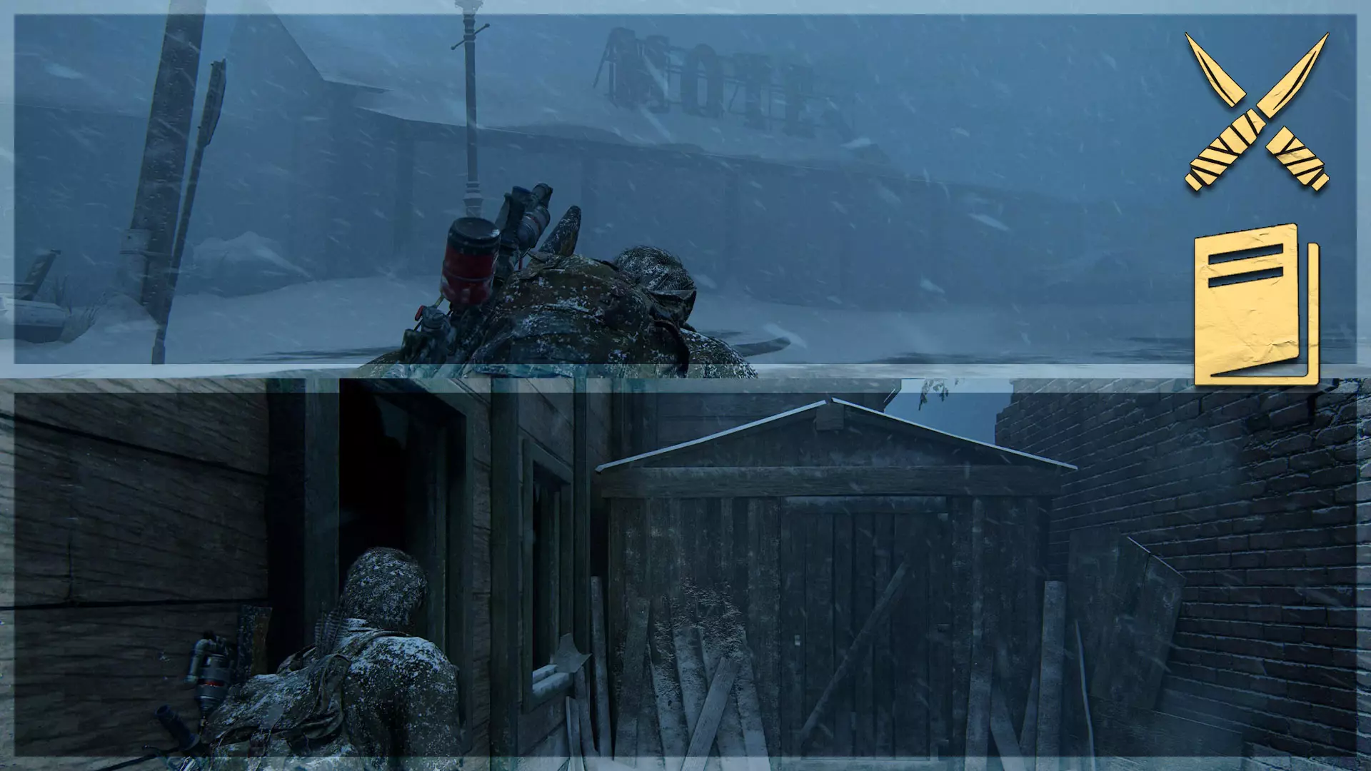 Shiv门(11/13) 训练手册(11/12) ➥ 烟雾塑形 在暴风雪中,穿过街道找到一家汽车旅馆。穿过汽车旅馆,后面会有一扇Shiv门。