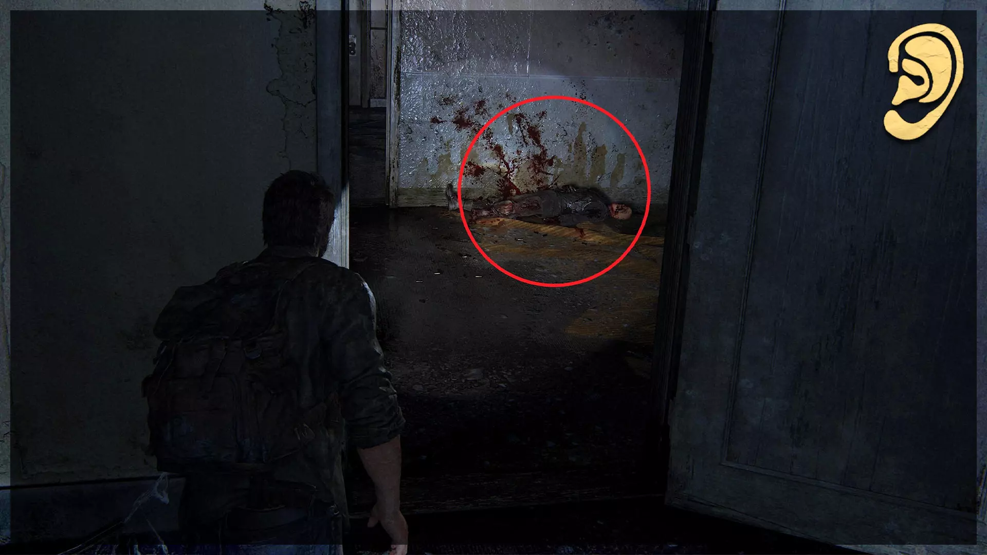 可选对话(6/54) 进入建筑内部,走廊里有一具尸体。与尸体互动可触发对话。