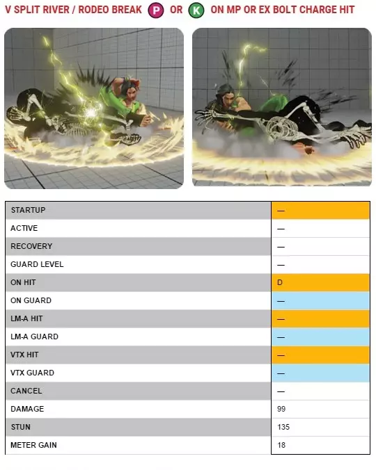 为了诱骗对手使出拆投技或落空攻击。劳拉会闪避这些招式,然后重新拉近距离,利用出其不意的帧数陷阱、普通投或指令投进行择。这种V技能取消接特殊技取消的另一个重要用途是用于骗取站立 counter-hit。