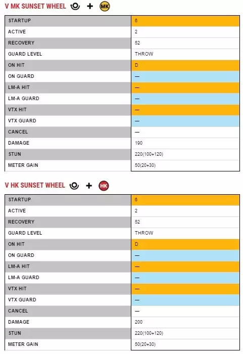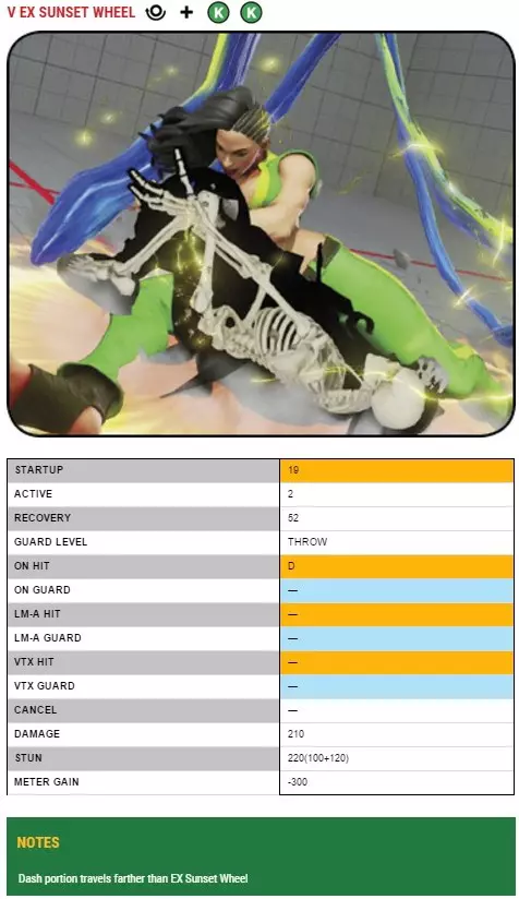 格挡时仅-2帧,因此在大多数情况下使用是安全的;其回报是一个两段重攻击连击,可衔接后续的起手。 面对中立跳,与其使用高硬直的【日落轮】,不如选择快硬直的普通投技。对于格斗家角色来说,普通投技尤其有用,因为玩家对抗格斗家类型角色时的本能反应是起身而非输入投技拆解。例如,如果你使用诸如前冲站立这样的连招序列