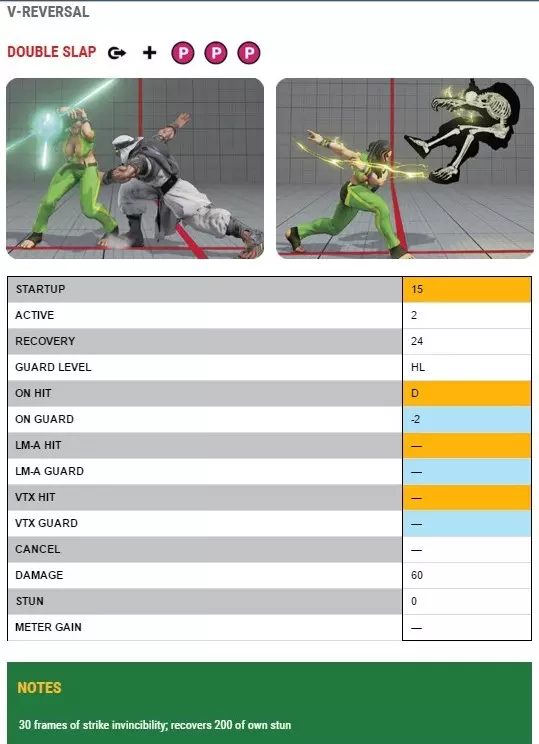 332点伤害,492点眩晕值(需要一格EX能量槽)。从双重撞击目标连招发起的V触发取消连招。格挡时为-2帧,命中时可轻松确认并释放火花秀来结束连招。 连招10 站立