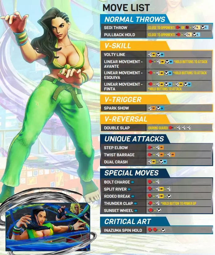 优点 她的伤害极高,即使是最简单的起手也能造成超过100点伤害。 作为一名摔角手,她的地面移动能力极强,线性移动V技能极大地增强了她的立回能力。 她的一些tick接指令投的压制链有很小的逃脱窗口,使对手陷入艰难的猜拳局面。 她的许多击倒来自打投或投掷,这限制了对手的受身选择,只能原地快速起身或保持倒地状态。 雷霆一击对常规角色来说是宝贵的工具,但对劳拉这样的摔角手而言更是如此。 缺点 劳拉的连招有限;她只有少数的命中确认连招,且没有实用的防空 Crush Counter 连招。她的玩法以立回为主,因此对《街头霸王》新手来说可能较难上手。她没有大多数角色那样常规的低判定连击,所以面对有经验的玩家时,她的进攻很难施展。劳拉是一名地面型、机动性强的投技角色,拥有可蓄力的飞行道具攻击。她的优势在于能够灵活地在中近距离穿插游走,并以强力的指令投【日落旋风】构成威胁。她非常依赖扎实的《街头霸王》基础,因此掌握起来有一定难度。不过她的连击在操作上不算太复杂。你的目标是稳健地进行中距离博弈,直到找到机会通过投技造成击倒,或者使用轻拳【闪电冲锋】的连击来接近对手。达成此目标的方法: 尽早进入中距离,站稳脚跟并将对手压制至角落 使用【雷霆一击】促使敌人做出错误决策,并突破其防御 使用站立姿势试探
