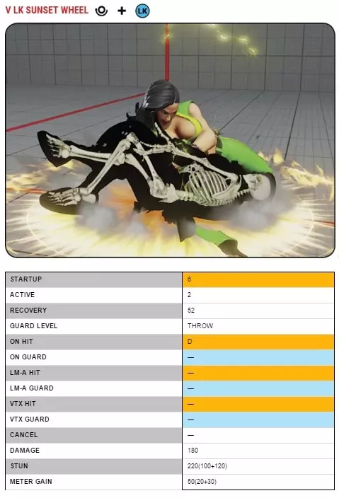 这是一记头顶回旋踢,攻击距离略短于半个屏幕。任何可特殊取消的攻击也都可以用V技能取消(站立状态下)
