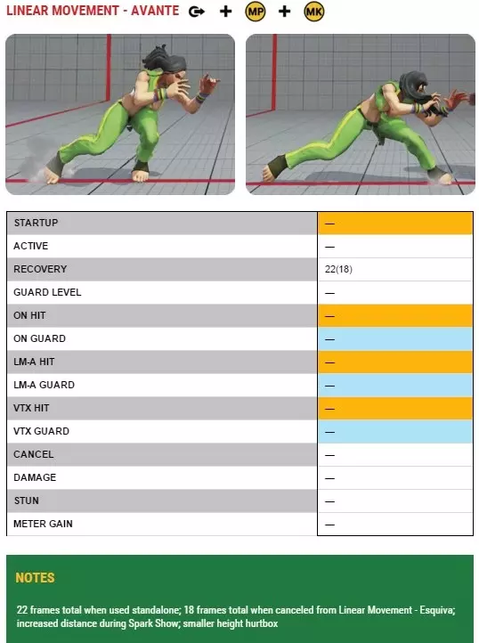 它是直线移动-前进的后跳变体。它比劳拉的普通后跳多6帧,但拥有多种独特特性,使其更加灵活。它可以从任何可取消特殊技的攻击(如直线移动-前进)取消进入,甚至还能取消为其他招式。直线移动-闪避的第15至26帧可以取消为特殊攻击(日落轮除外)或她的其他V技能。本质上,你可以用另一个招式跳过此招的最后12帧。你可以创造性地运用这一特性,尤其是配合直线移动-前进、轻拳/中拳/EX闪电冲锋和雷霆一击。 例如,如果你击倒对手后接近至近距离,可以使用站立