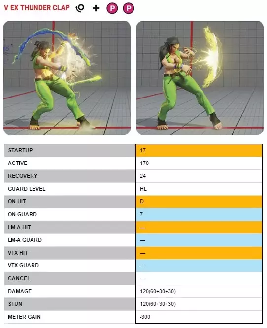 双重掌击:格挡攻击后,劳拉会转身用双手掌击对手胸部,命中后将其击倒。劳拉的V反击在击倒优势方面优于大多数其他角色。成功命中后向前冲刺,面对快速起身的对手你将获得+9帧优势,面对向后快速起身的对手则为+14帧——有充足时间准备下一次攻击。此时,你基本可以尝试任何类型的帧数陷阱、择中攻击或指令投。 不过,由于劳拉的V触发是三格能量类型,使用双重掌击通常会牺牲你本回合强大的火花秀V触发强化效果。如果无法通过 Crush Counter(破招 counter)或 Volty Line(伏特冲刺)获得额外的V槽,那么你需要承受约75%的耐力伤害才能积攒三格V槽,因此在使用Double Slap(双重掌击)来抵御对手压制前,务必仔细检查自己的V槽。好处是,如果你确实消耗一格V槽使用了双重掌击,并且不依赖Spark Show(火花表演)作为制胜手段,那么在这一局中你至少还能再使用两次双重掌击(凭借其出色的击倒优势)。这很容易将战局节奏重新拉回对你有利的局面;作为一个擅长贴身缠斗的摔角手角色,这一点至关重要。 如果双重掌击被格挡,你会处于-2帧的不利状态,这通常是安全的。 火花表演:顾名思义,劳拉的火花表演V触发技能会为她赋予雷电元素的力量。在约13秒内,劳拉的多个招式获得新特性,包括所有特殊技和临界艺术的伤害与眩晕值提升。直线移动-前进和直线移动-闪避的移动距离增加。雷鸣掌1级自动升级为雷鸣掌2级,雷鸣掌3级的蓄力时间缩短。EX雷鸣掌额外增加一段攻击。最后,EX落日旋风的冲刺范围扩大。这些增益效果,尤其是涉及雷鸣掌的部分,足以改变游戏局势。 拥有满V槽可以打出更丰富的连招,让你能从劳拉的普通招式取消接V触发。你的中距离牵制招式会变得更具威胁,正如连招部分列出的多个连招所示。此外,如果你能迫使对手格挡你的某个高优势 poke 连招,就能制造一些难以摆脱的 50/50 局面。