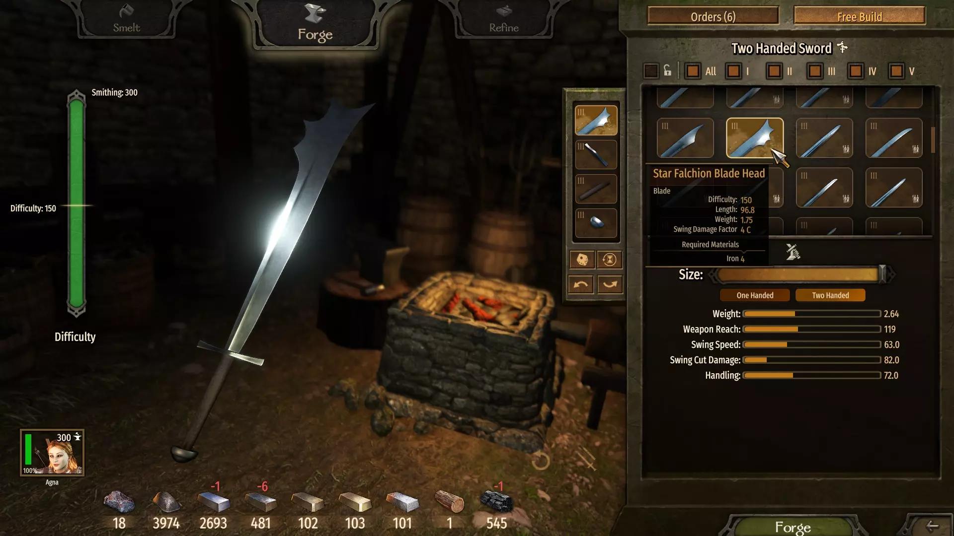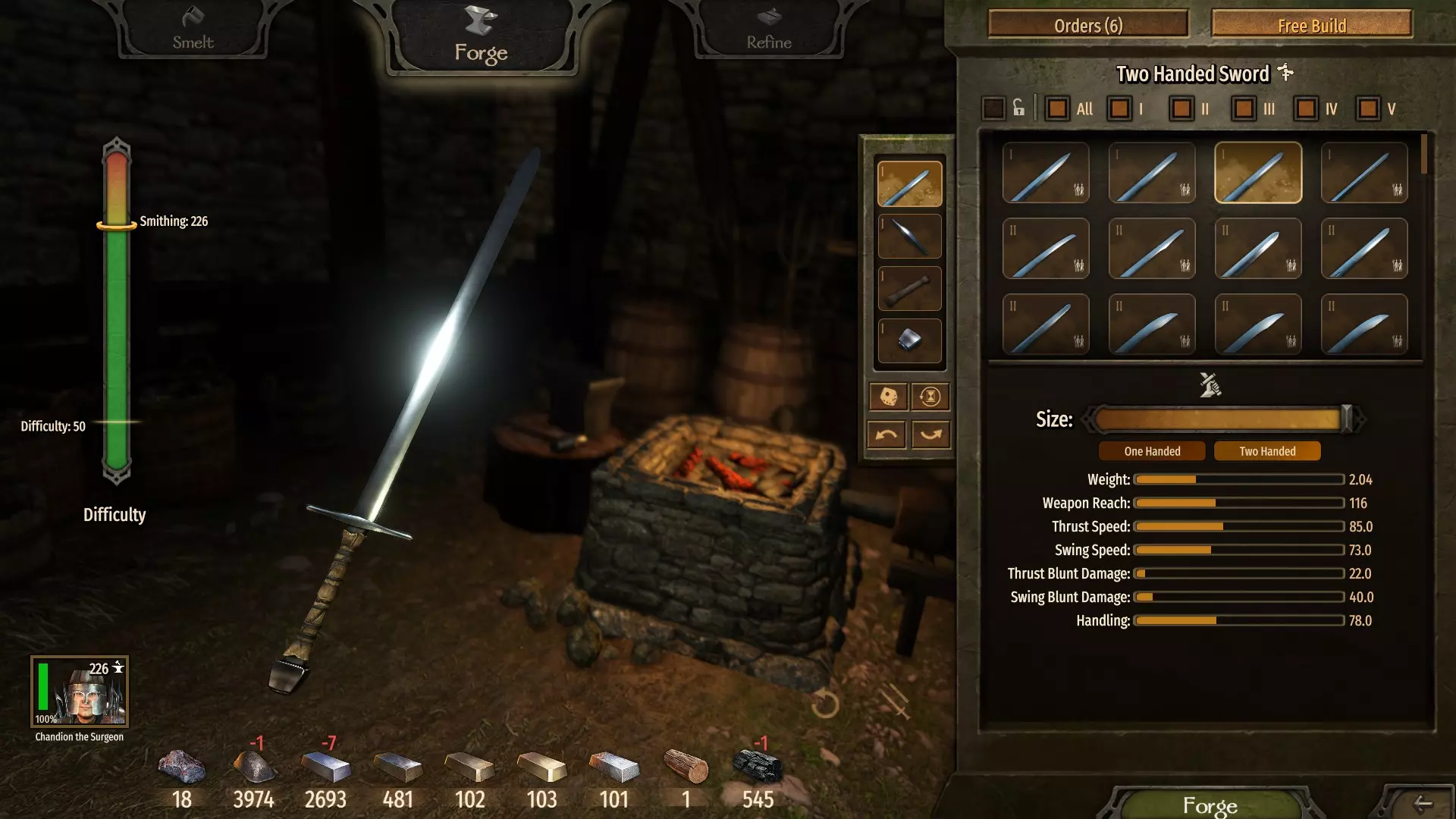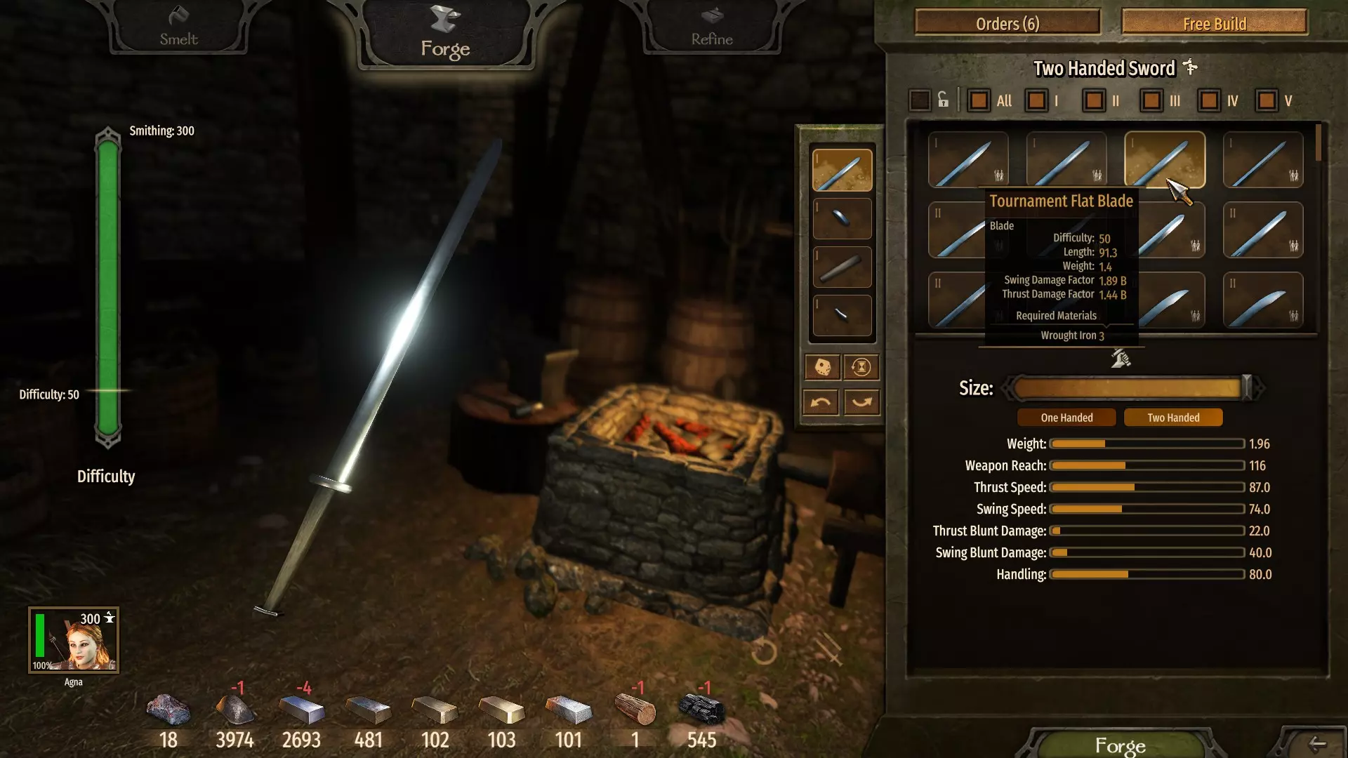 (7单位熟铁 - 无利可图) 请注意制作双手武器的难度。每个部件,尤其是高等级部件,都会增加难度,而越难制作的武器能让你的锻造技能提升得更快。 当前目标是通过交替锻造和重熔双手剑,在第二级解锁【铁制弗利萨剑刃】。 在这个等级,制作它是最佳选择,因为它价格最高且所需资源最少。