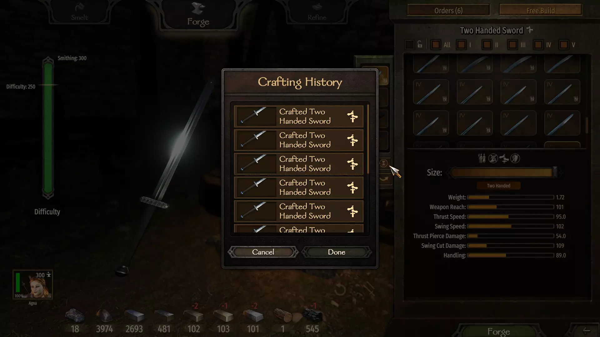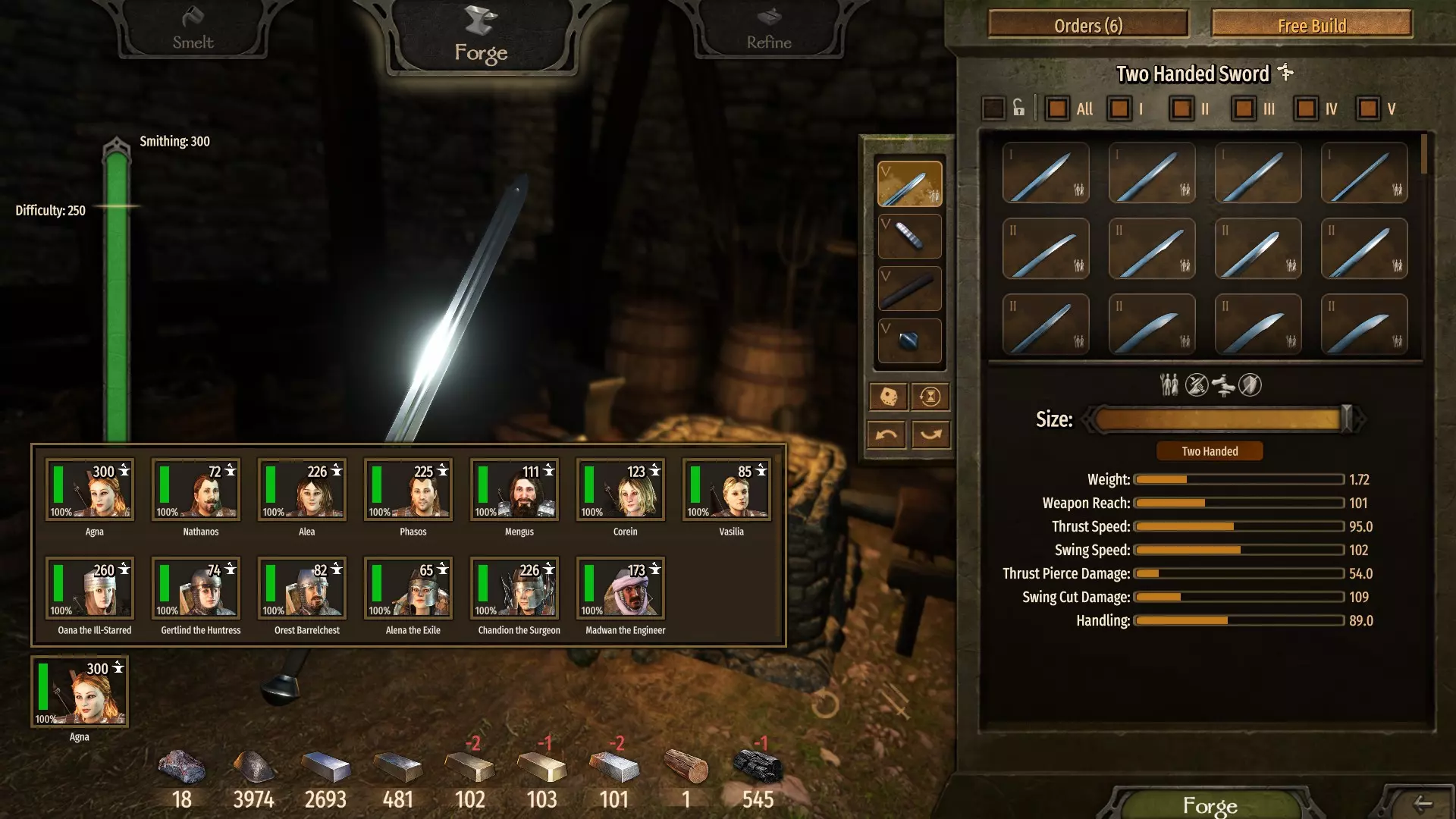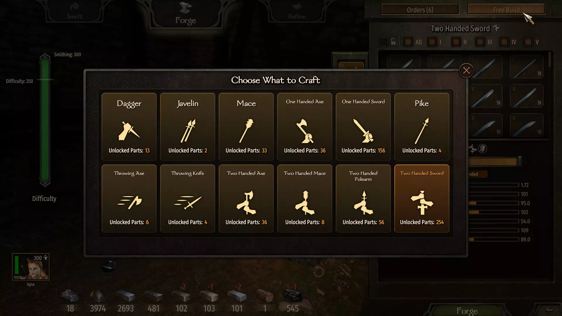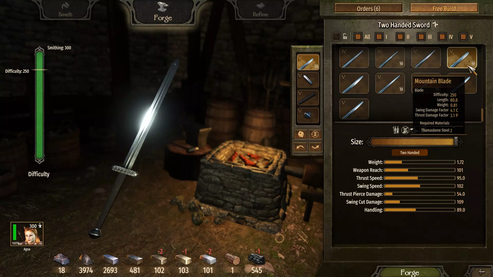 (7单位熟铁 - 无利可图) 请注意制作双手武器的难度。每个部件,尤其是高等级部件,都会增加难度,而越难制作的武器能让你的锻造技能提升得更快。 当前目标是通过交替锻造和重熔双手剑,在第二级解锁【铁制弗利萨剑刃】。 在这个等级,制作它是最佳选择,因为它价格最高且所需资源最少。