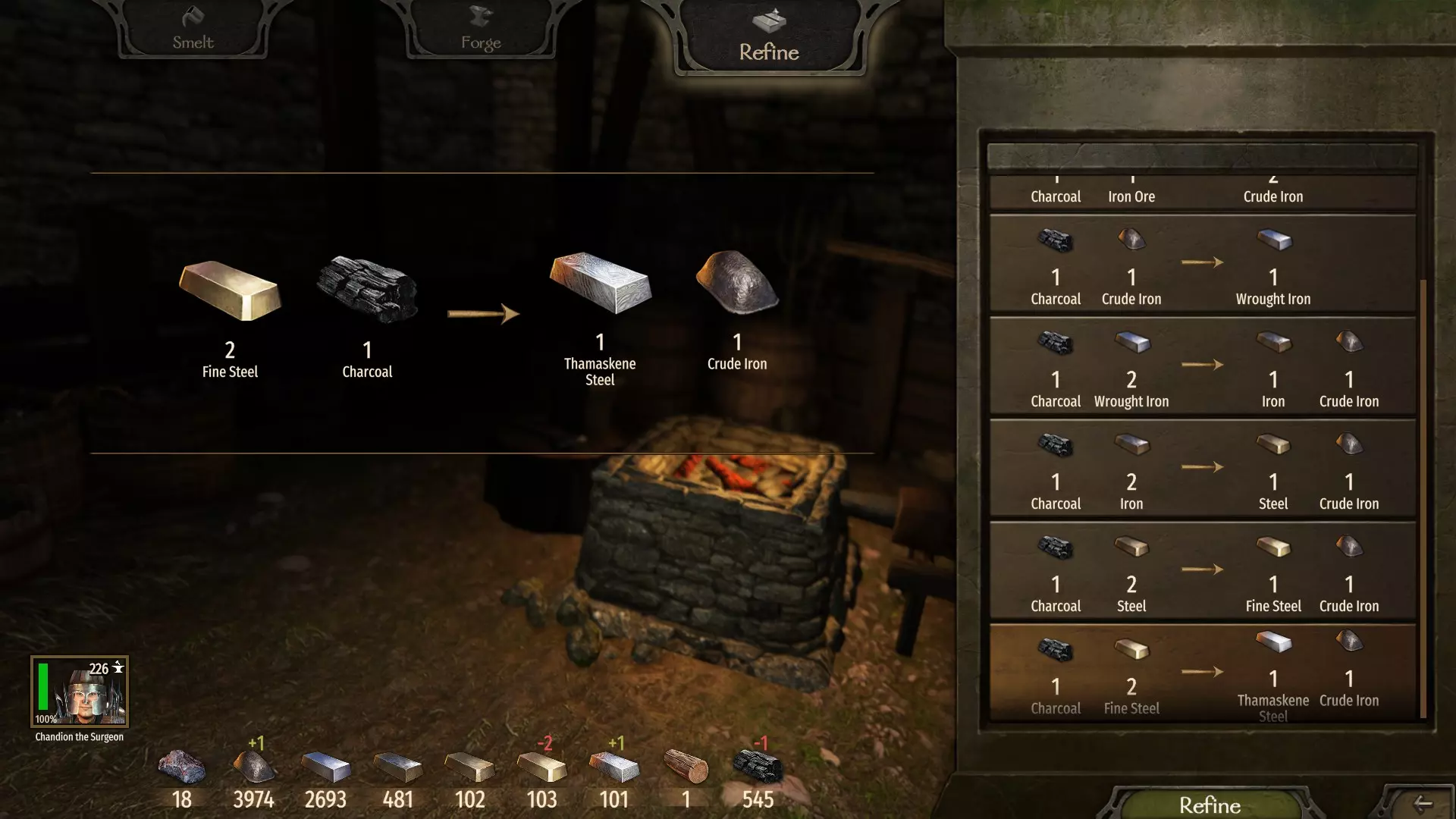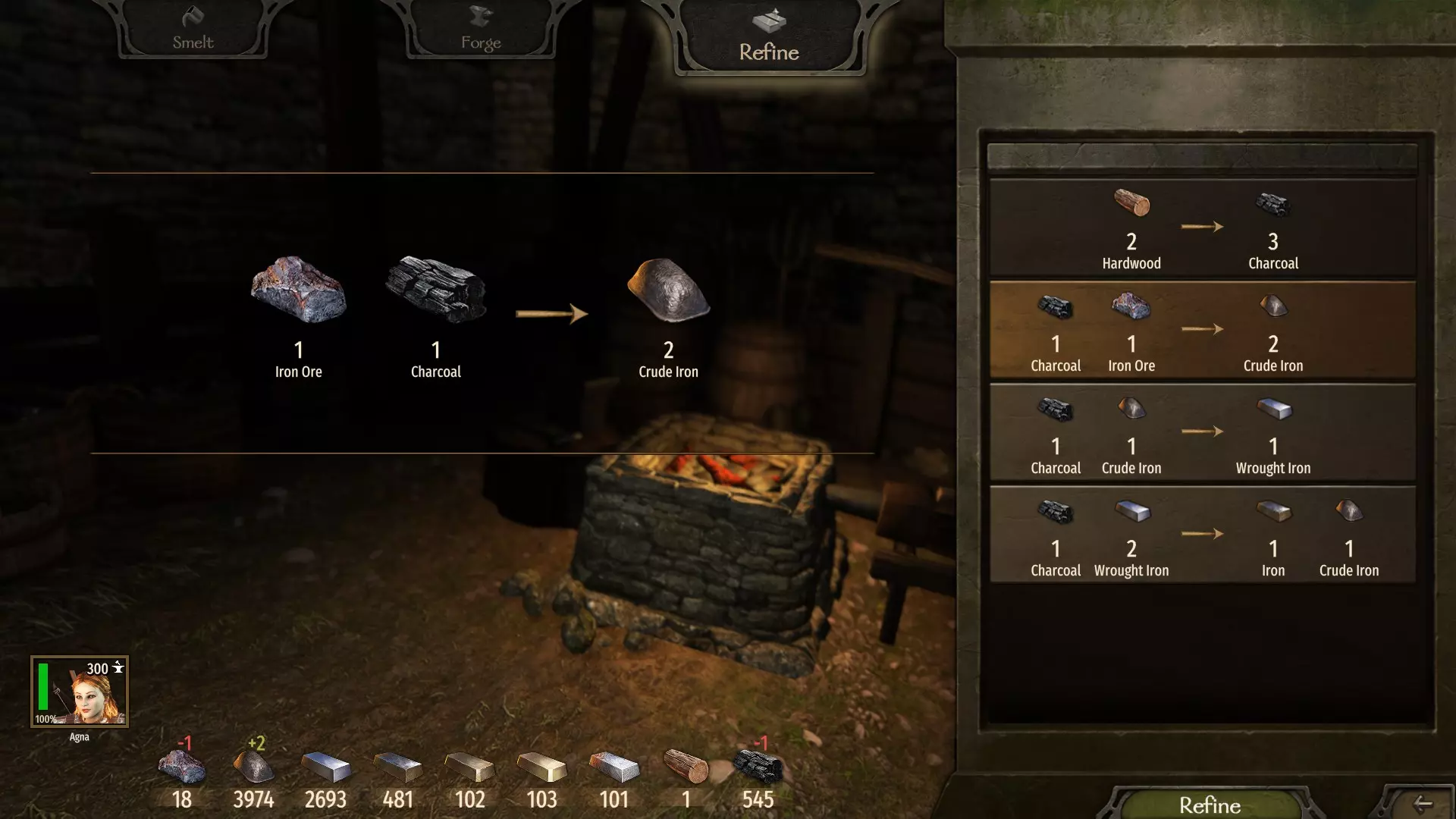 (+ 可精炼原材料菜单) 每个人必备的是——【运动】技能中的耐力 perk(工作后仅消耗一半体力)+【锻造】技能中的高效木炭制造者 perk(2单位木材可制作3单位燃料)。