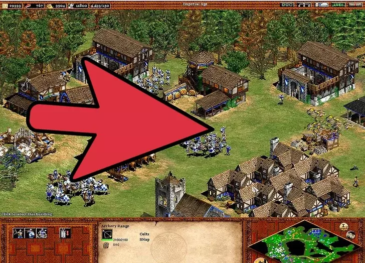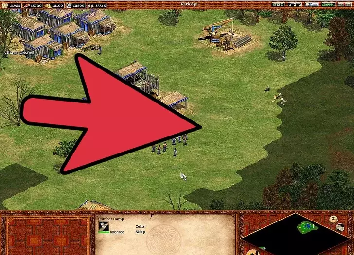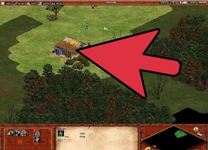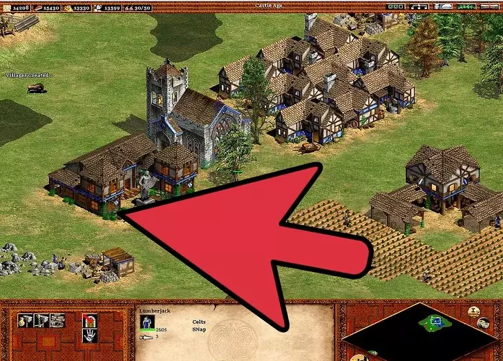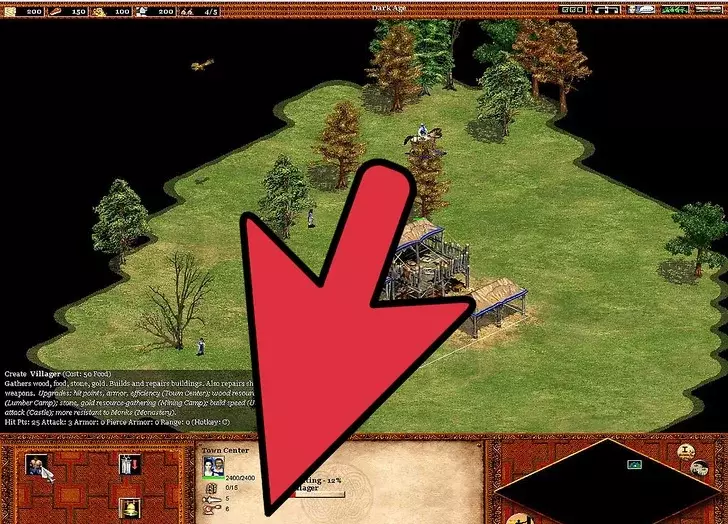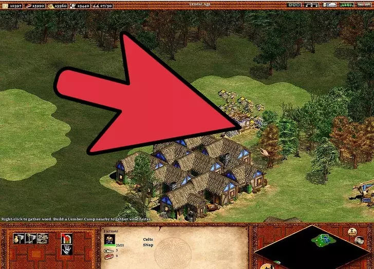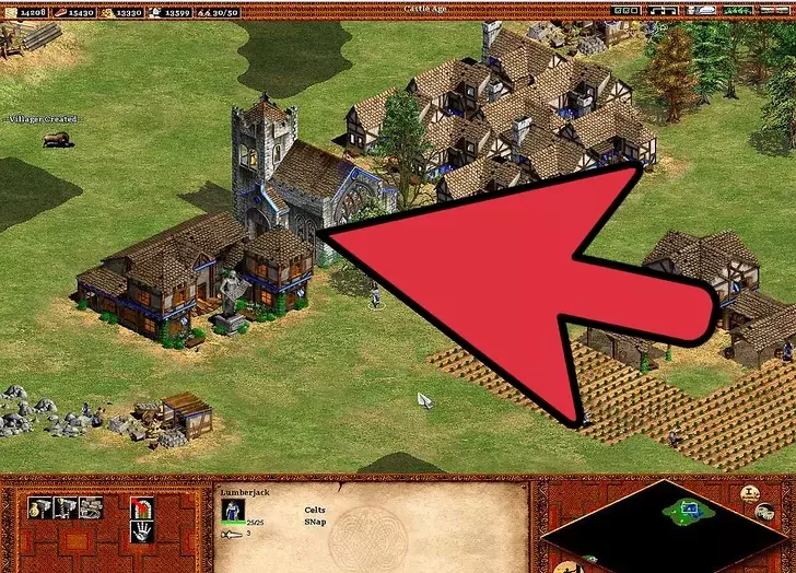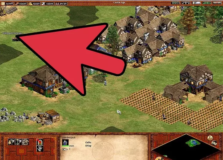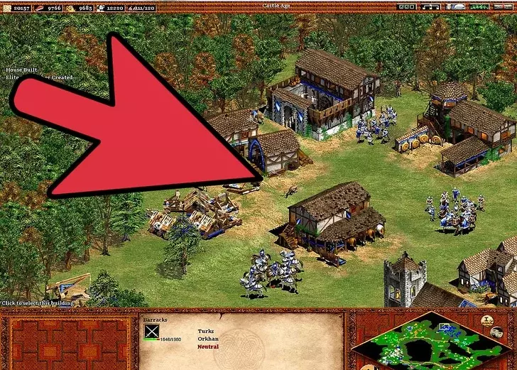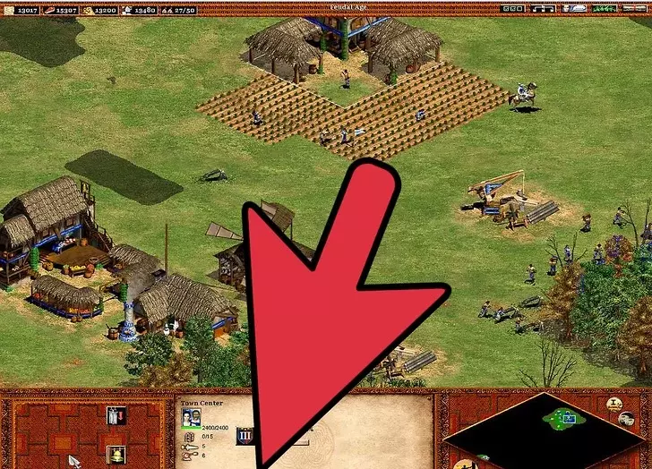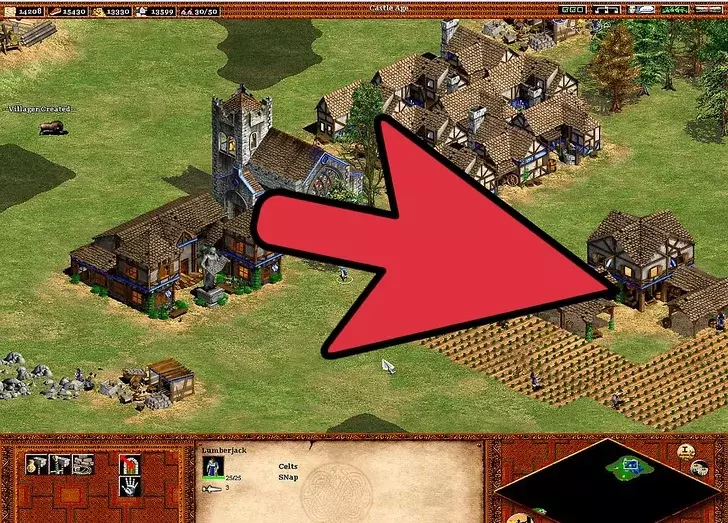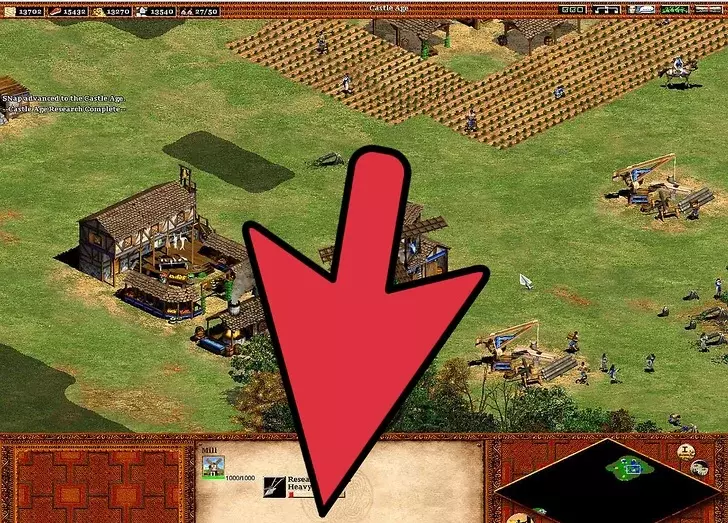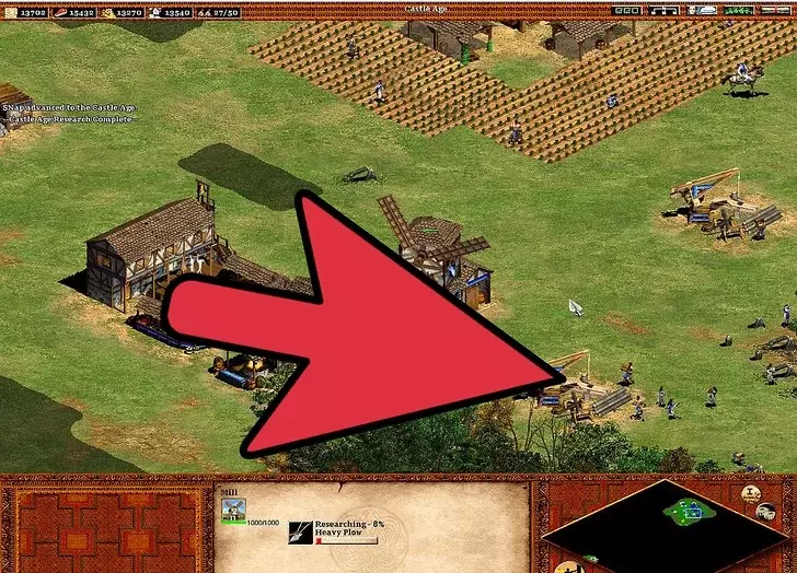 4 继续扩张你的文明。 继续用新招募的农民建造更多农场。【再播种】技能很重要,因为手动重新播种不仅麻烦,而且在指挥军队进攻或抵御入侵时可能会让人非常沮丧。建造城镇中心可以避免你再建造风车。 与风车不同,建造更多伐木场很重要。这在城堡时代尤为关键,因为入侵者会攻击那些通常远离城镇中心的伐木工人(警报响起时,伐木工人不会前往城镇中心)。由于森林砍伐,需要建造伐木营地——树木越少,村民需要走的路就越长:靠近森林的伐木营地可以缩短这段路程。 村民需要被派去采集黄金。因此,需要建造更多的采矿营地。如果没有稳定地分配村民进行采矿,800黄金的需求会变得更加困难。黄金在城堡时代尤为重要,因为它是军事发展的关键要素。大多数军事单位都需要消耗黄金(在那些单位成本更高的文明中,这一点更为关键)。采矿的优先级要低得多,因为矿石仅用于建造塔楼、城镇中心、城堡、城墙和射箭孔。