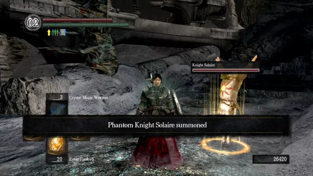 7. 游戏结局前的最终相遇 - 当你打开捷径并消灭昆虫后,返回千足恶魔身后的区域。 - 你会发现索拉尔坐在地上,虽然沮丧但精神正常。与他对话。 - 之后,他会以金色召唤印记的形式出现在格温战斗前。(需要保持人类形态才能召唤他)