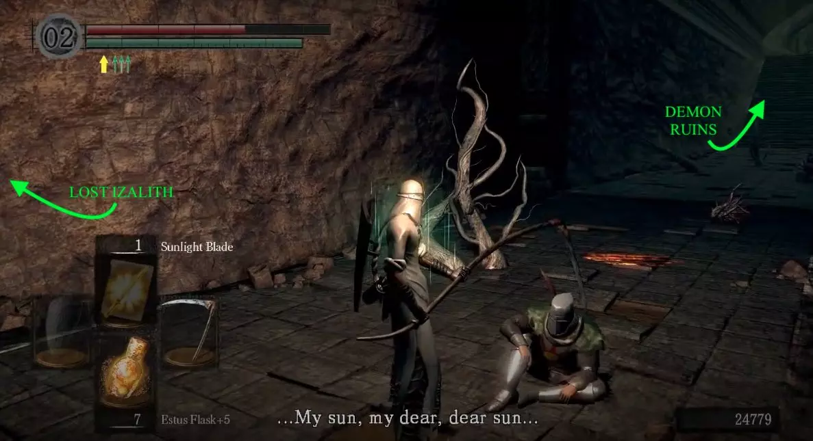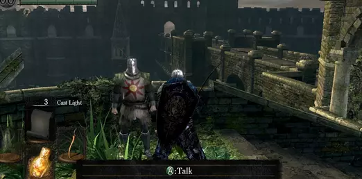 3. 太阳祭坛 - 可选遭遇 - 返回不死人教区,在你初次遇见他的桥下方,前往营地篝火附近的太阳祭坛。 - 如果你拥有足够的信仰值(25点或以上),或者曾进行过联机合作,他会在此邀请你加入太阳战士誓约。