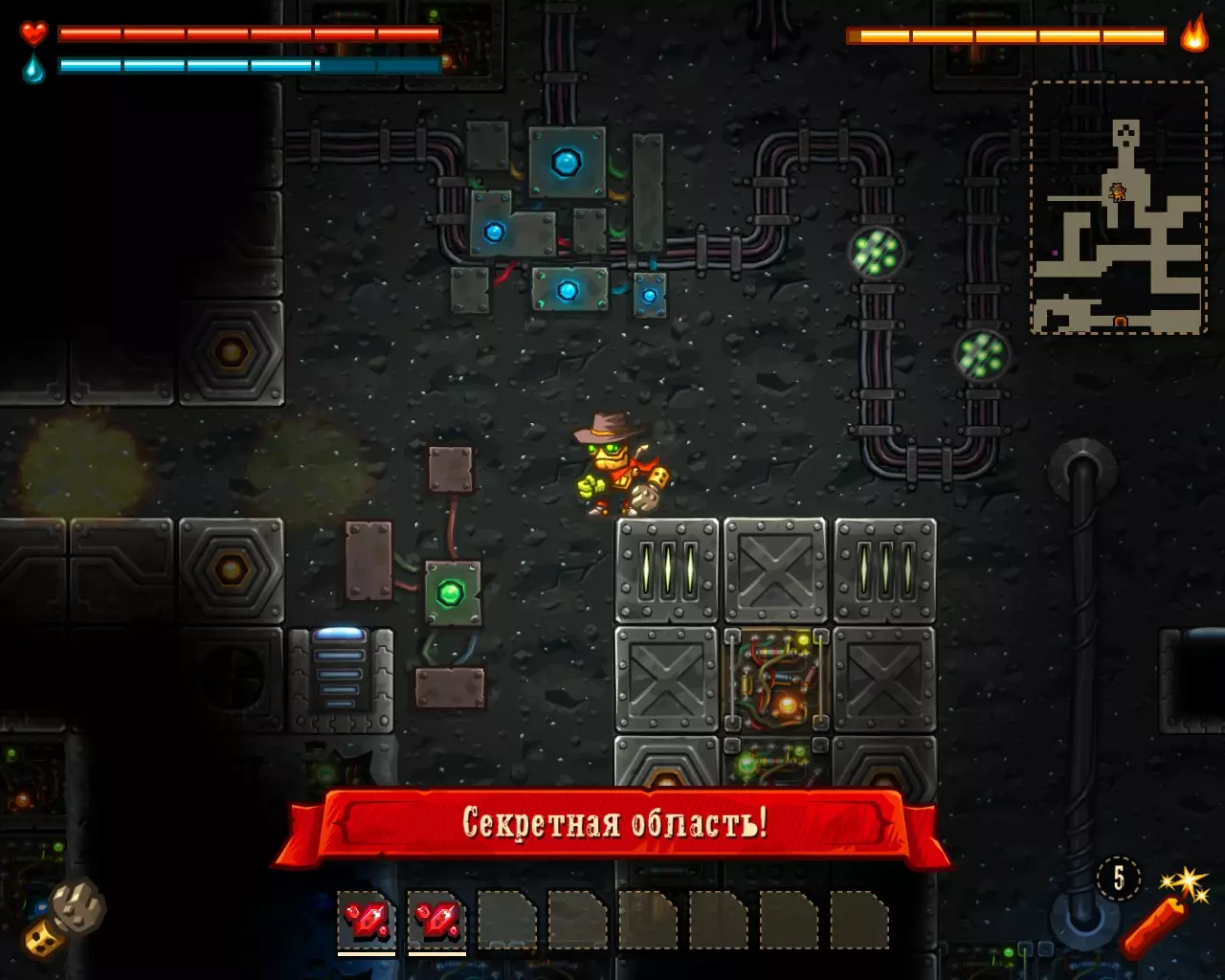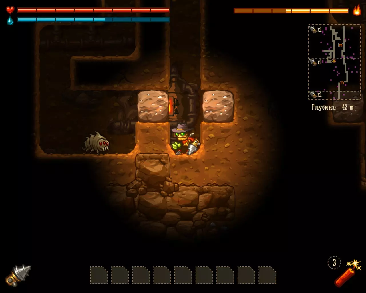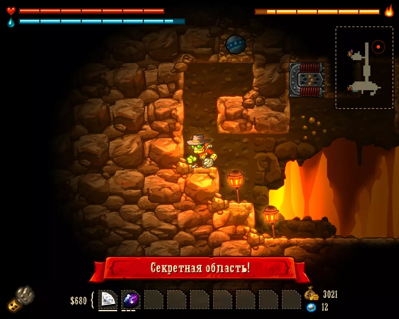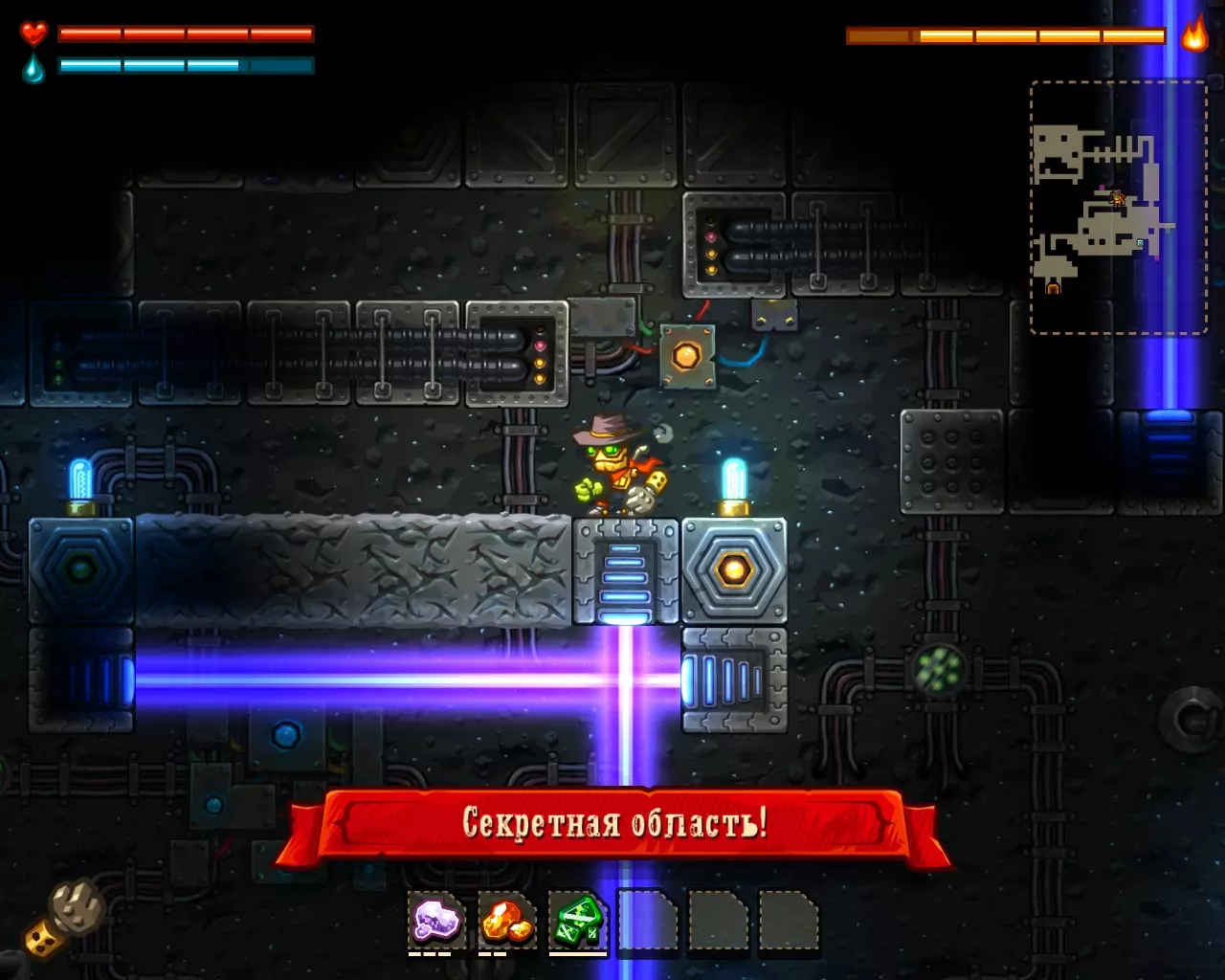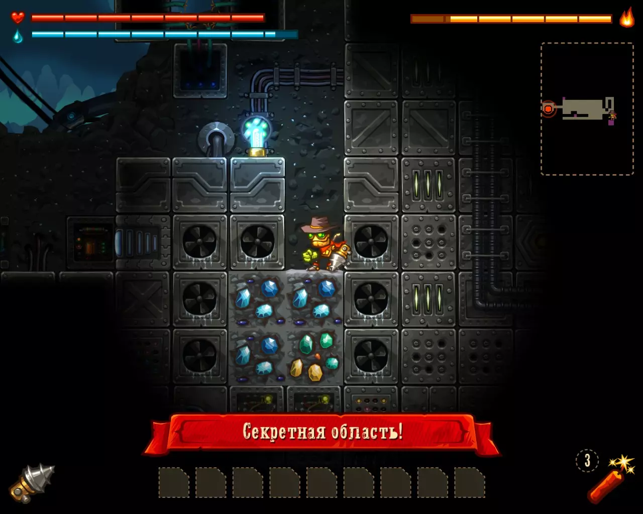 ______________________________________________________________________________ Внимание! Эту часть с расчетами Вы можете пропустить. Руководство ниже - после них. ______________________________________________________________________________ Условные обозначения: Архея, Старый мир и Вектрон будем называть мир #1, мир #2 и мир #3 соответственно. В каждом мире: К1, К2 и К3 - квестовые комнаты. [0-1] - промежуток между началом мира и К1. [1-2] - промежуток между К1 и К2. [2-3] - промежуток между К2 и концом мира. Неосновные (не квестовые) комнаты называем в зависимости от того, на каком промежутке они находятся: Н1[0-1], Н2[0-1] - первая и вторая комната первого промежутка в мирах. Н1[1-2], Н2[1-2] - первая и вторая комната второго промежутка в мирах. Н1[2-3], Н2[2-3] - первая и вторая комната третего промежутка в мирах. Расчеты: Мир #1 .................................... Мир #2........................................ Мир #3 [0-1] - $71 и 0 сфер ________ [0-1] - $1021 и 6 сфер _______ [0-1] - $2424 и 13 сфер [1-2] - $202 и 0 сфер _______ [1-2] - $1855 и 9 сфер _______ [1-2] - $1673 и 6 сфер [2-3] - $812 и 16 сфер ______ [2-3] - $2768 и 9 сфер _______ [2-3] - $8467 и 36 сфер К1 - $712 и 9 сфер ................ К1 - $75 и 10 сфер .................... К1 - $650 и 3 сфер К2 - $67 и 10 сфер ................ К2 - $100 и 10 сфер .................. К2 - $900 и 14 сфер К3 - $128 и 6 сфер ................ К3 - $888 и 10 сфер .................. К3 - $0 и 0 сфер (босс) Н1[1-2] - $16 и 3 сфер ______ Н1[0-1] - $0 и 7 сфер ________ Н1[0-1] - $183 и 3 сфер Н1[2-3] - $66 и 0 сфер ______ Н1[1-2] - $100 и 7 сфер ______ Н1[1-2] - $300 и 3 сфер Н2[2-3] - $50 и 3 сфер ______ Н2[1-2] - $100 и 7 сфер ______ Н1[2-3] - $600 и 7 сфер ...................................................................................................... Н2[2-3] - $740 и 3 сфер Всего: Мир #1: пространство мира $1085 и 16 сфер; все комнаты этого мира $1039 и 31 сфер Мир #2: пространство мира $5644 и 24 сфер; все комнаты этого мира $1263 и 51 сфер Мир #3: пространство мира $12564 и 55 сфер; все комнаты этого мира $3373 и 33 сфер ______________________________________________________________________________ Руководство: Начинаем игру. Не обращаем внимания на руду (сферы собираем только если заметим). Главное - как можно скорее достигнуть мира Вектрона и получить сканер минералов. Приоритет улучшений: 1 - бур; 2 - бак воды; 3 - увеличения жизни; 4 - фонарь. Получили сканер, затем опустошаем полностью третий мир "Вектрон" - руда+сферы (сам мир и все его комнаты - $16000 и 88 сфер). Видим, что не хватило 3-4 тысячи золота. Нехватку добираем в: В комнатах с генераторами, попутно ломая их! (1-я квестовая комната "Археи" - $712 и 3-я квестовая комната "Старого мира" - $888) Во втором мире - промежуток от 2-й квестовой комнаты до конца мира (там $2768) Пользуемся только буром! Динамит и телепорт всегда носим полными. Не боимся заставлять все телепортами, главное - экономия времени. Собрав $20 000 золота, пробегаем по всем комнатам первого и второго мира собирая сферы (в таблице расчетов, выше, указано сколько сфер в комнатах К1, К2, К3 и Нx[x-x]) Записывайте сколько Вы потратили сфер на улучшения и покупку телепортов + сколько у Вас сфер в инвентаре (Tab), что бы узнать сколько еще не хватает. А показатель собранного золота находится у скупщицы руды. Когда все собрали и уничтожили генераторы - вперед к боссу. Следите за временем! В меню выбора профиля показывается время игры. Когда вылезаем на поверхность (надпись "игра сохранина"), можно выйти из игры, посмотреть время и зайти. Время при нажатом Esc и Tab - не идет. И помните! Если Вы погибли или потратили уйму времени впустую - откатывайте игру до последнего сохранения (Alt+F4 или Alt+Tab -> диспетчер задач -> завершить процесс SteamWorld Dig) Примечание: Это руководство для тех - кто уже прошел игру хоть раз, т.к. для такого уровня требуется специальная с