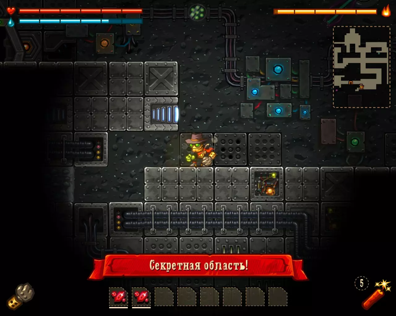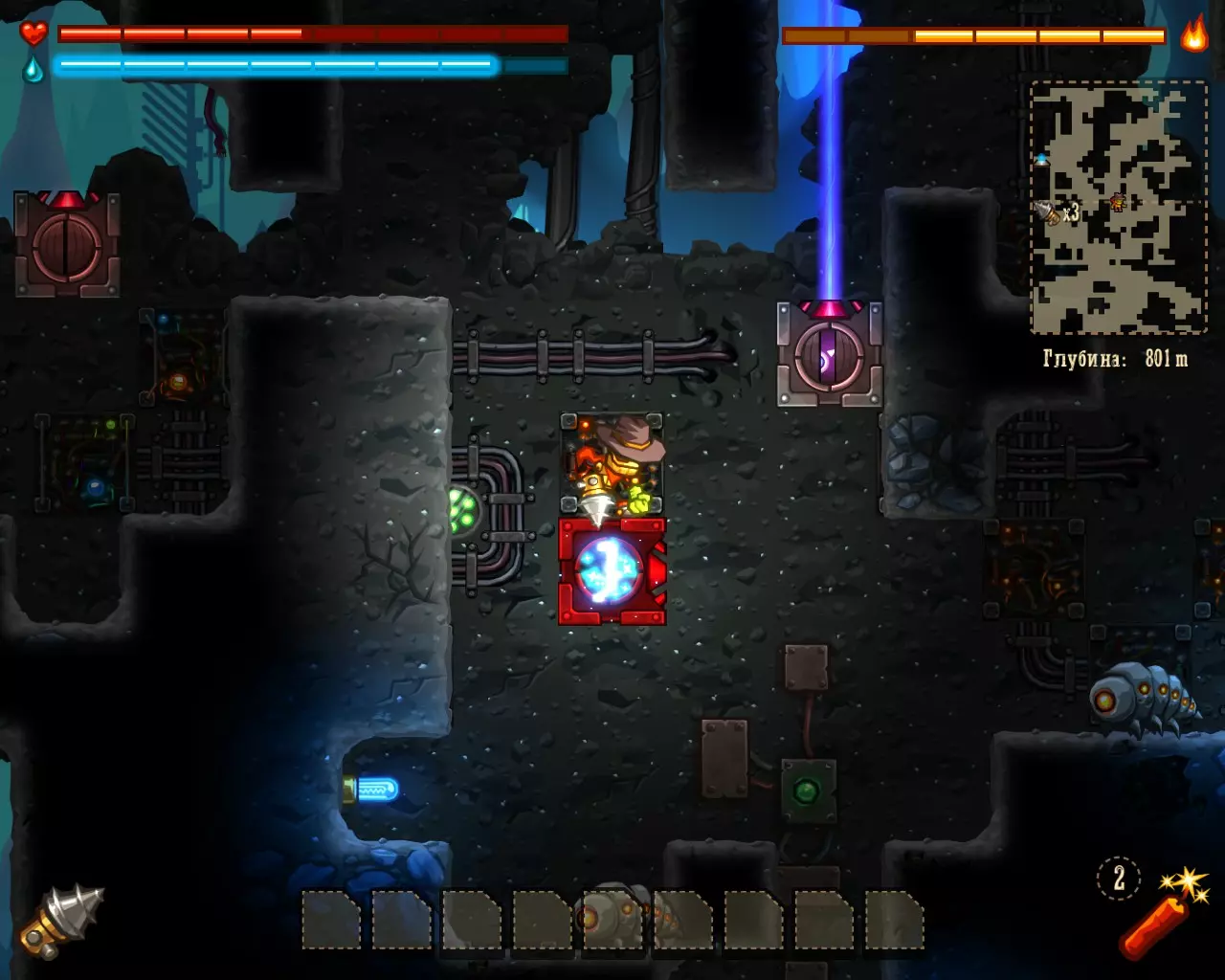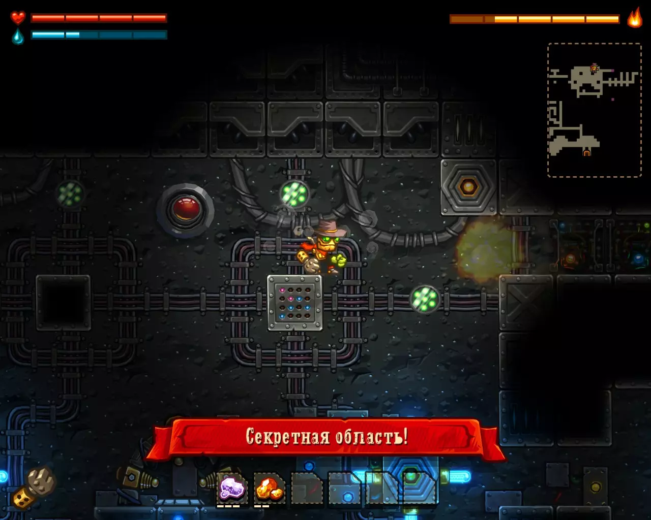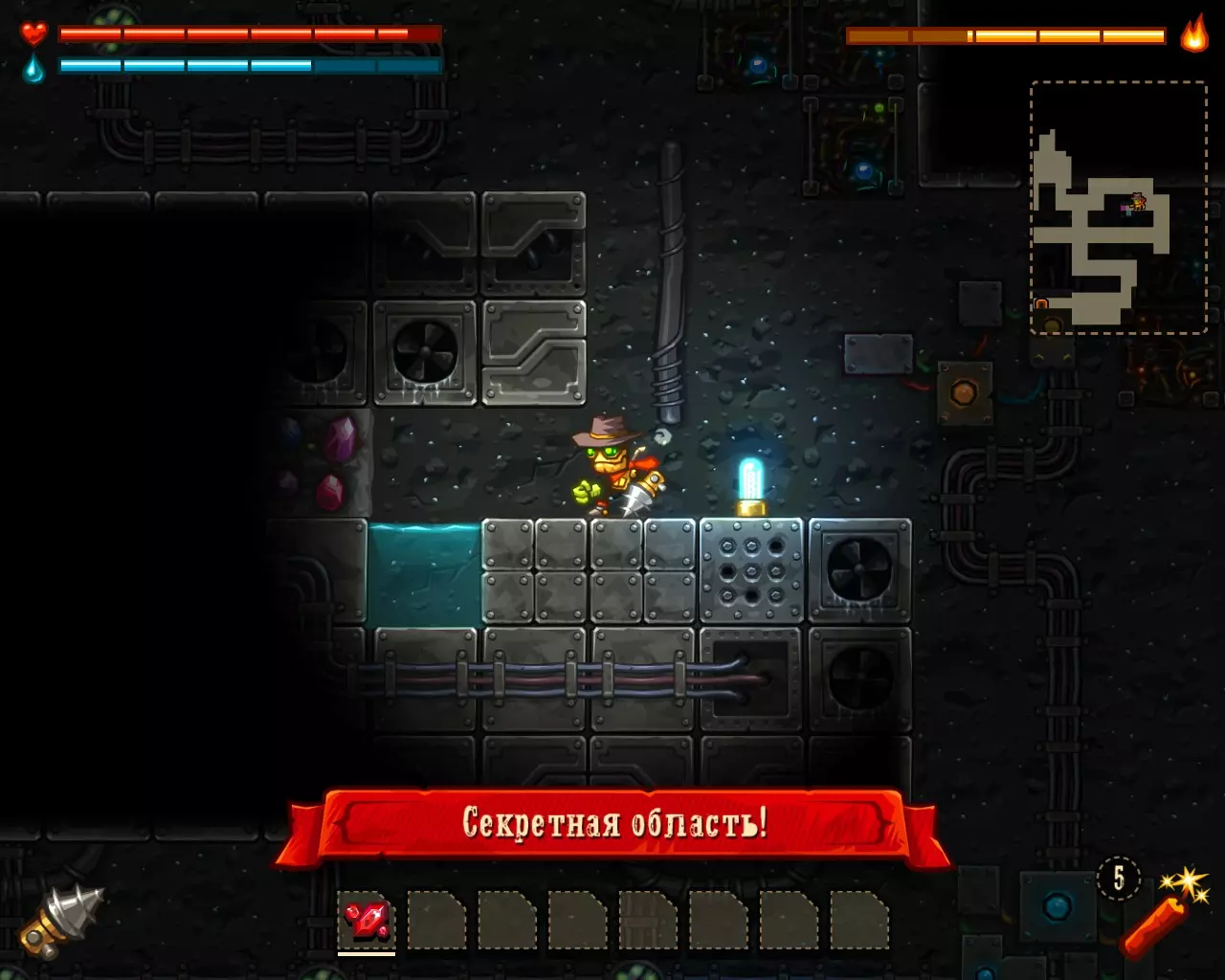 ______________________________________________________________________________ Внимание! Эту часть с расчетами Вы можете пропустить. Руководство ниже - после них. ______________________________________________________________________________ Условные обозначения: Архея, Старый мир и Вектрон будем называть мир #1, мир #2 и мир #3 соответственно. В каждом мире: К1, К2 и К3 - квестовые комнаты. [0-1] - промежуток между началом мира и К1. [1-2] - промежуток между К1 и К2. [2-3] - промежуток между К2 и концом мира. Неосновные (не квестовые) комнаты называем в зависимости от того, на каком промежутке они находятся: Н1[0-1], Н2[0-1] - первая и вторая комната первого промежутка в мирах. Н1[1-2], Н2[1-2] - первая и вторая комната второго промежутка в мирах. Н1[2-3], Н2[2-3] - первая и вторая комната третего промежутка в мирах. Расчеты: Мир #1 .................................... Мир #2........................................ Мир #3 [0-1] - $71 и 0 сфер ________ [0-1] - $1021 и 6 сфер _______ [0-1] - $2424 и 13 сфер [1-2] - $202 и 0 сфер _______ [1-2] - $1855 и 9 сфер _______ [1-2] - $1673 и 6 сфер [2-3] - $812 и 16 сфер ______ [2-3] - $2768 и 9 сфер _______ [2-3] - $8467 и 36 сфер К1 - $712 и 9 сфер ................ К1 - $75 и 10 сфер .................... К1 - $650 и 3 сфер К2 - $67 и 10 сфер ................ К2 - $100 и 10 сфер .................. К2 - $900 и 14 сфер К3 - $128 и 6 сфер ................ К3 - $888 и 10 сфер .................. К3 - $0 и 0 сфер (босс) Н1[1-2] - $16 и 3 сфер ______ Н1[0-1] - $0 и 7 сфер ________ Н1[0-1] - $183 и 3 сфер Н1[2-3] - $66 и 0 сфер ______ Н1[1-2] - $100 и 7 сфер ______ Н1[1-2] - $300 и 3 сфер Н2[2-3] - $50 и 3 сфер ______ Н2[1-2] - $100 и 7 сфер ______ Н1[2-3] - $600 и 7 сфер ...................................................................................................... Н2[2-3] - $740 и 3 сфер Всего: Мир #1: пространство мира $1085 и 16 сфер; все комнаты этого мира $1039 и 31 сфер Мир #2: пространство мира $5644 и 24 сфер; все комнаты этого мира $1263 и 51 сфер Мир #3: пространство мира $12564 и 55 сфер; все комнаты этого мира $3373 и 33 сфер ______________________________________________________________________________ Руководство: Начинаем игру. Не обращаем внимания на руду (сферы собираем только если заметим). Главное - как можно скорее достигнуть мира Вектрона и получить сканер минералов. Приоритет улучшений: 1 - бур; 2 - бак воды; 3 - увеличения жизни; 4 - фонарь. Получили сканер, затем опустошаем полностью третий мир "Вектрон" - руда+сферы (сам мир и все его комнаты - $16000 и 88 сфер). Видим, что не хватило 3-4 тысячи золота. Нехватку добираем в: В комнатах с генераторами, попутно ломая их! (1-я квестовая комната "Археи" - $712 и 3-я квестовая комната "Старого мира" - $888) Во втором мире - промежуток от 2-й квестовой комнаты до конца мира (там $2768) Пользуемся только буром! Динамит и телепорт всегда носим полными. Не боимся заставлять все телепортами, главное - экономия времени. Собрав $20 000 золота, пробегаем по всем комнатам первого и второго мира собирая сферы (в таблице расчетов, выше, указано сколько сфер в комнатах К1, К2, К3 и Нx[x-x]) Записывайте сколько Вы потратили сфер на улучшения и покупку телепортов + сколько у Вас сфер в инвентаре (Tab), что бы узнать сколько еще не хватает. А показатель собранного золота находится у скупщицы руды. Когда все собрали и уничтожили генераторы - вперед к боссу. Следите за временем! В меню выбора профиля показывается время игры. Когда вылезаем на поверхность (надпись "игра сохранина"), можно выйти из игры, посмотреть время и зайти. Время при нажатом Esc и Tab - не идет. И помните! Если Вы погибли или потратили уйму времени впустую - откатывайте игру до последнего сохранения (Alt+F4 или Alt+Tab -> диспетчер задач -> завершить процесс SteamWorld Dig) Примечание: Это руководство для тех - кто уже прошел игру хоть раз, т.к. для такого уровня требуется специальная с